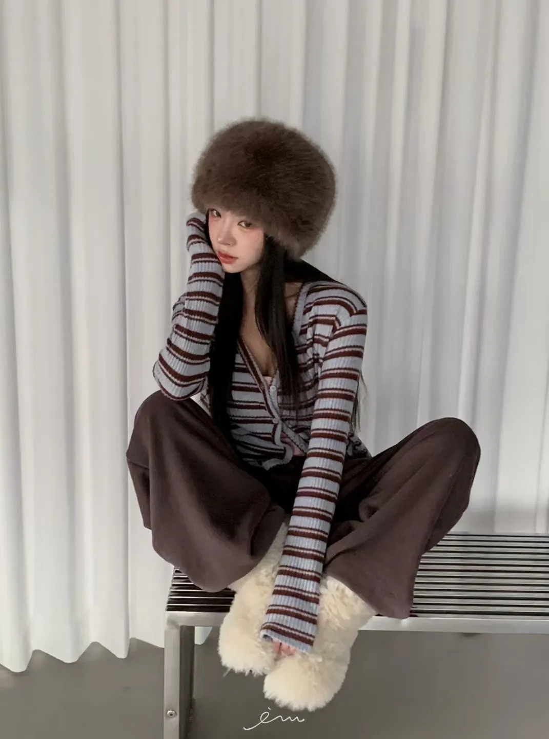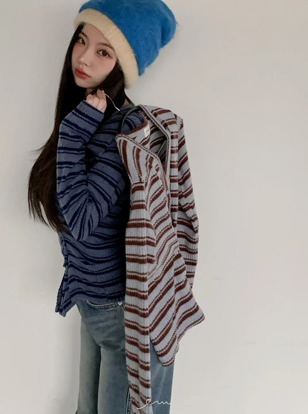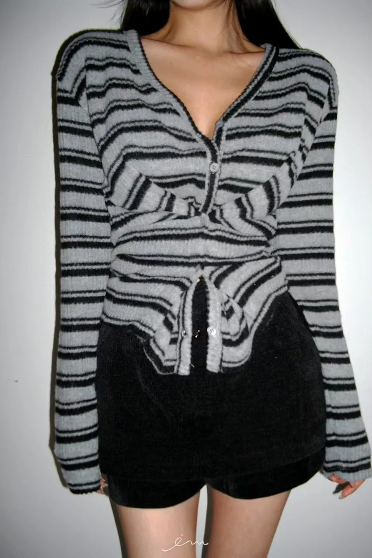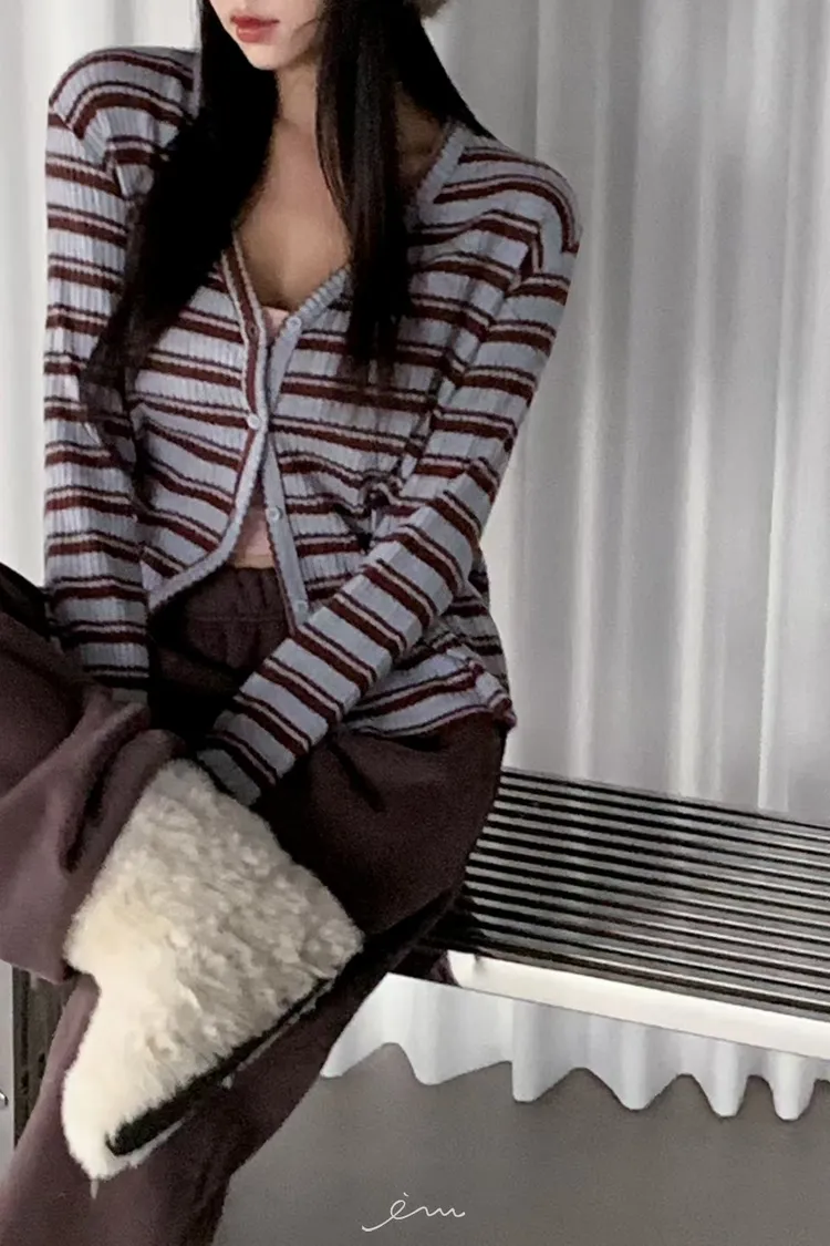 MON排釦假兩件感條紋外套