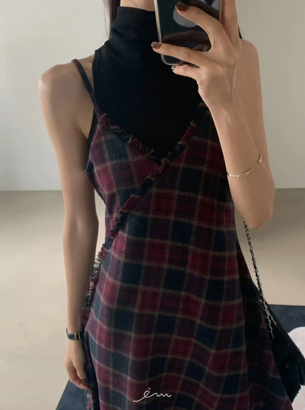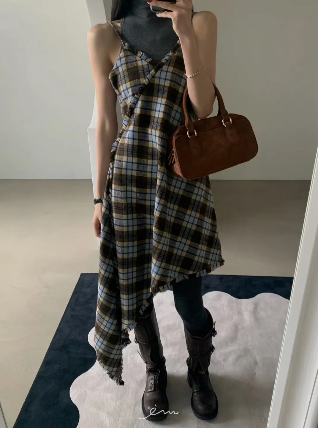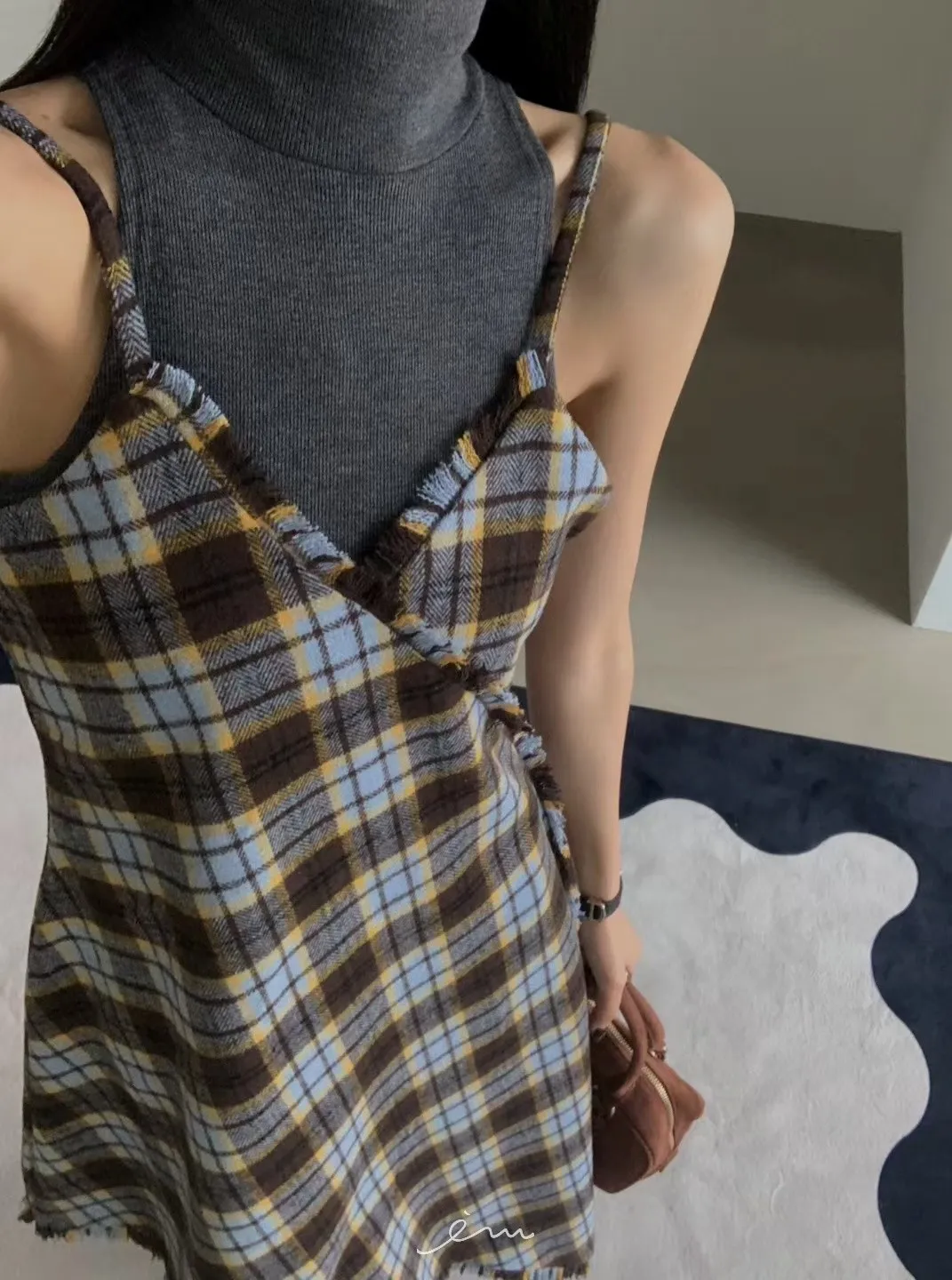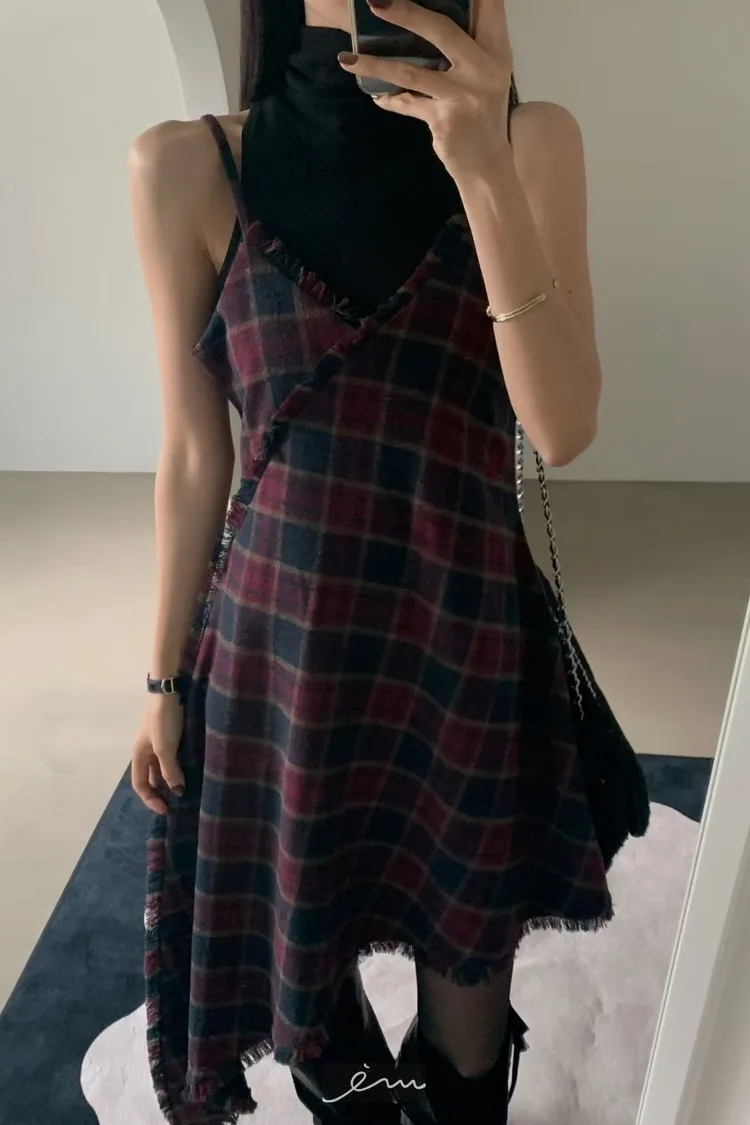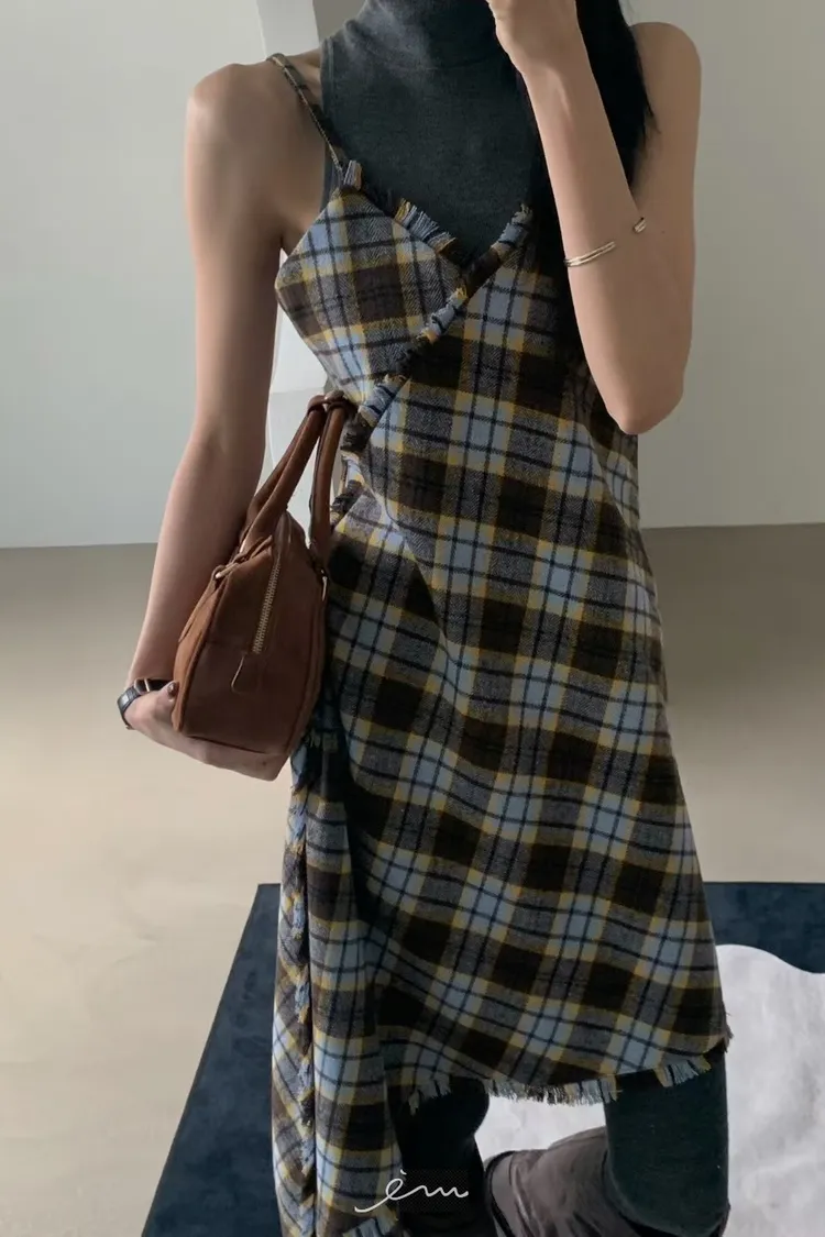 VER法蘭絨鬚鬚邊細肩格紋短洋