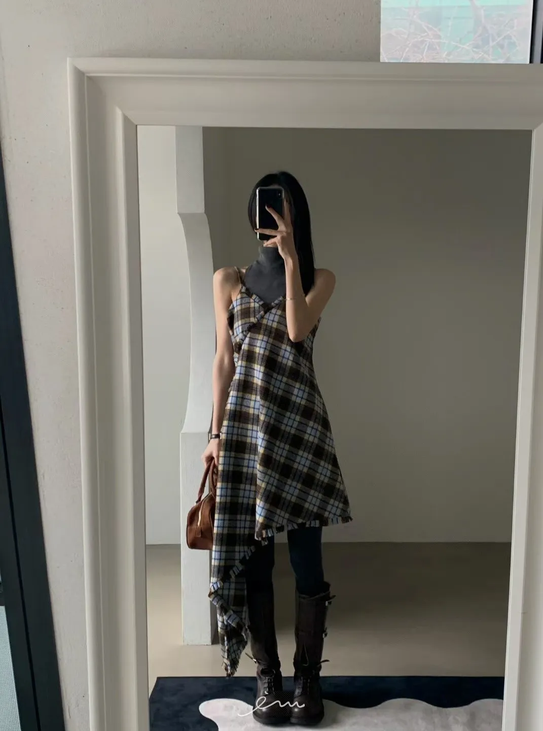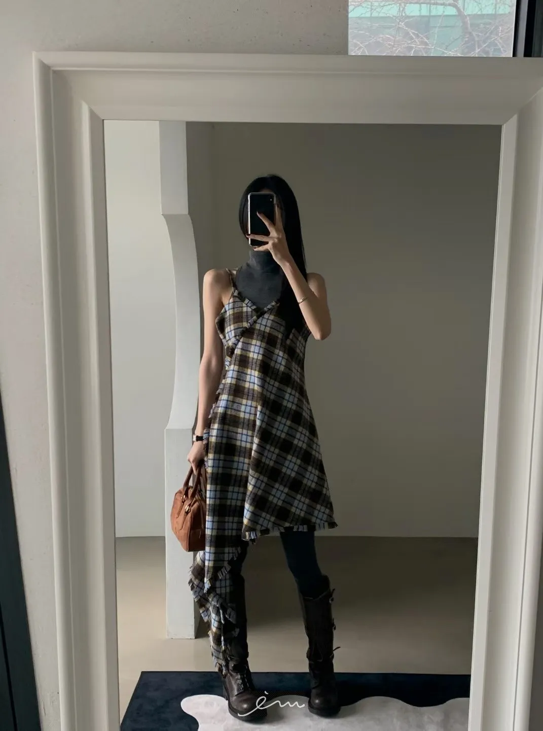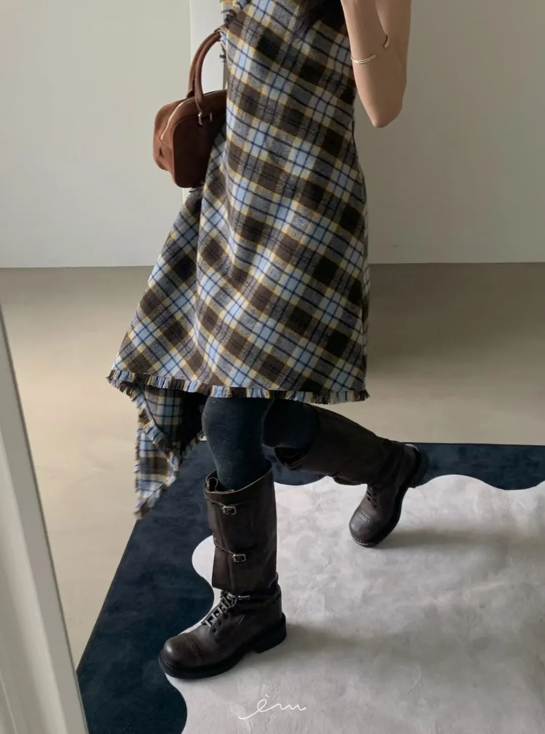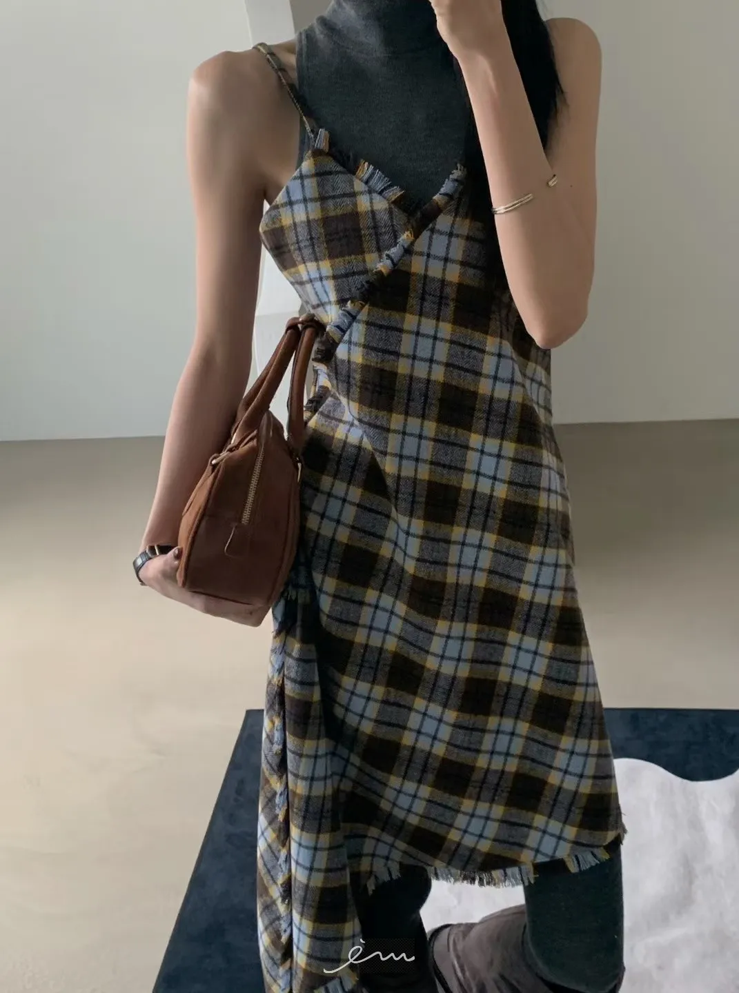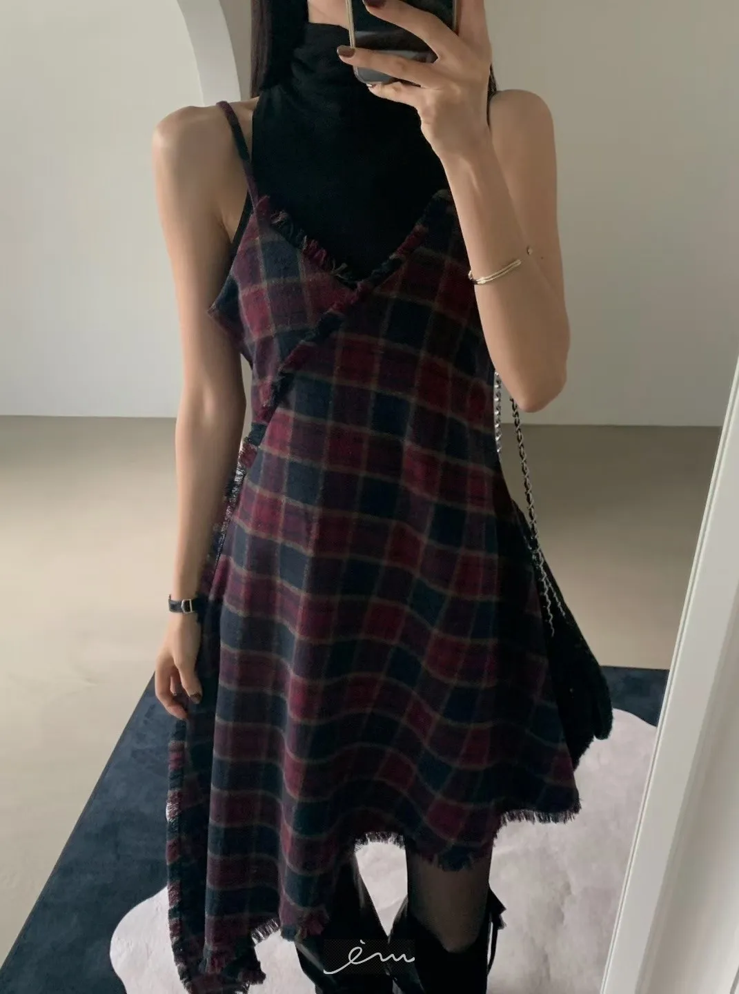 VER法蘭絨鬚鬚邊細肩格紋短洋