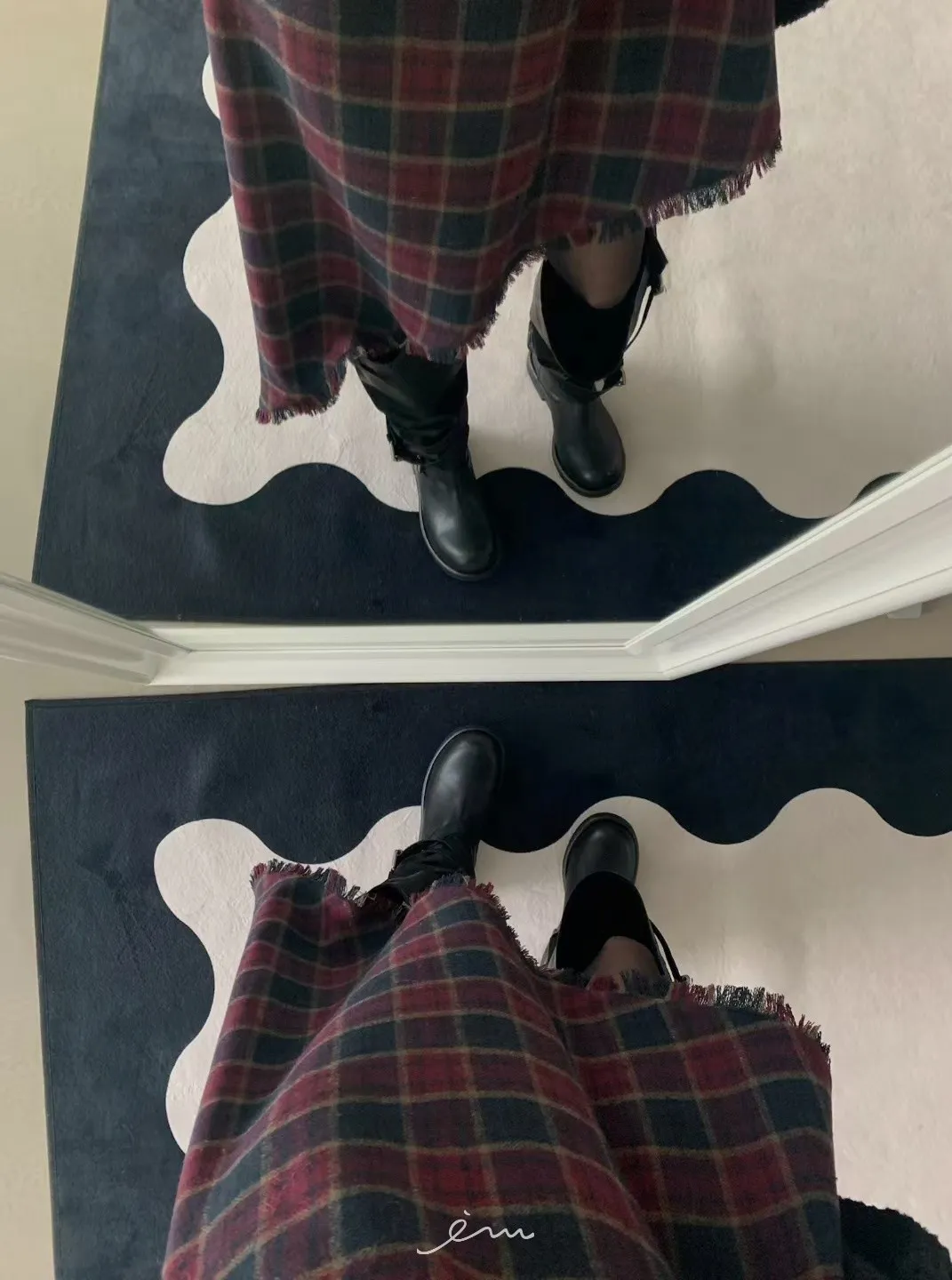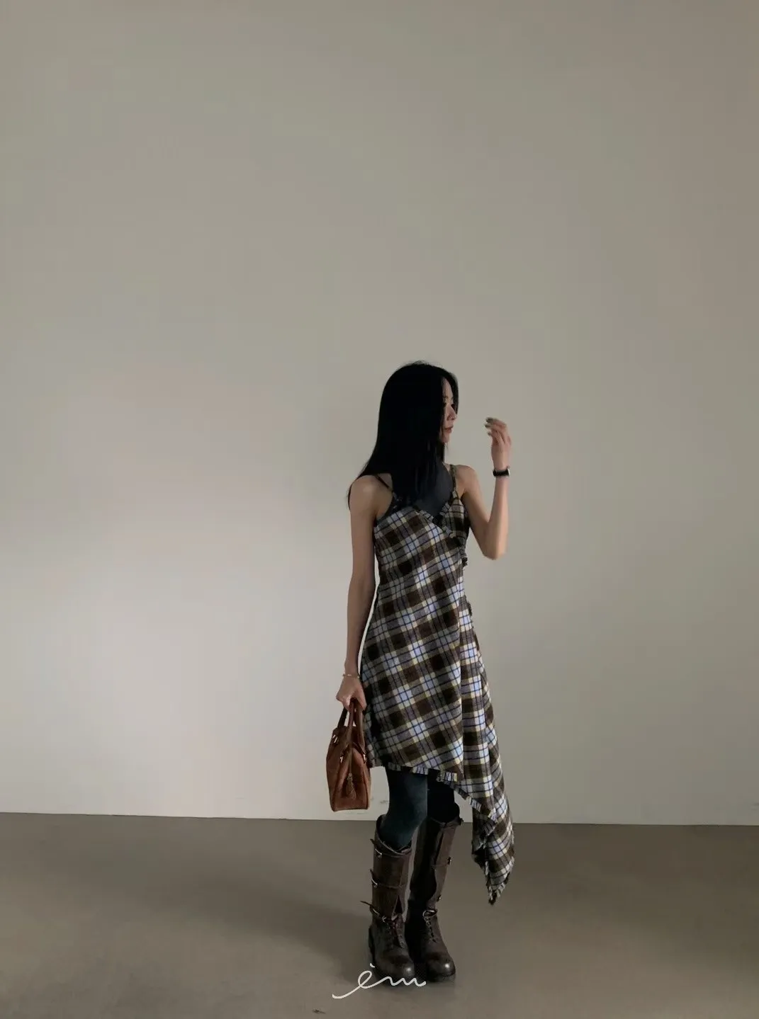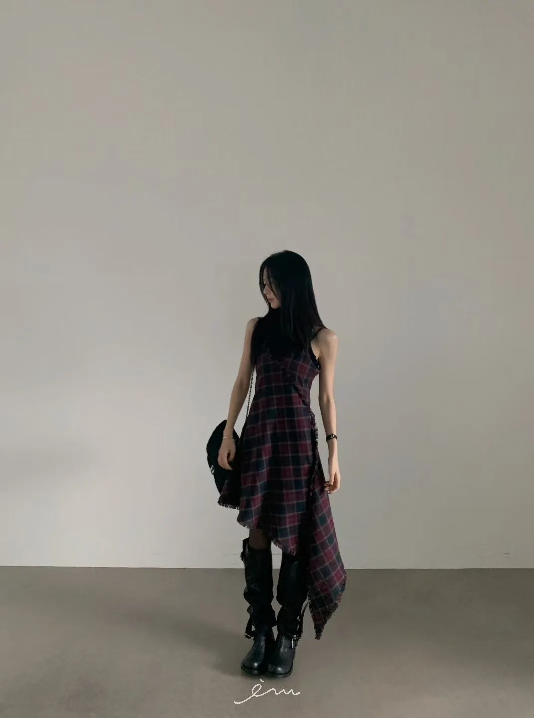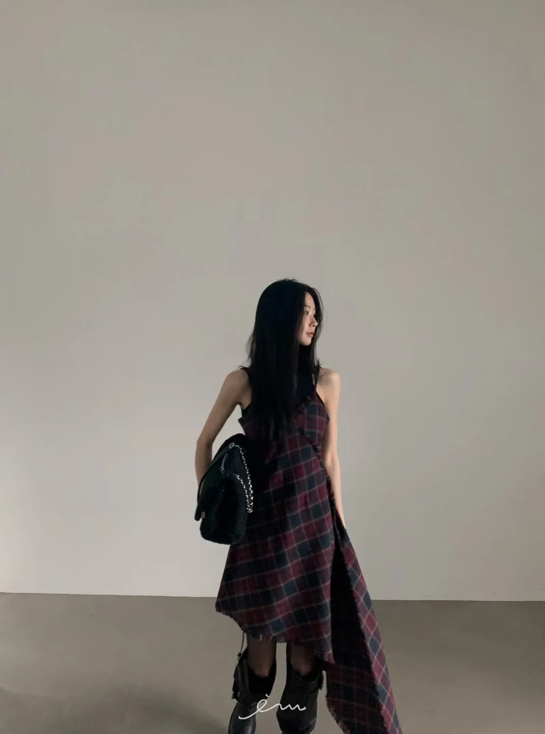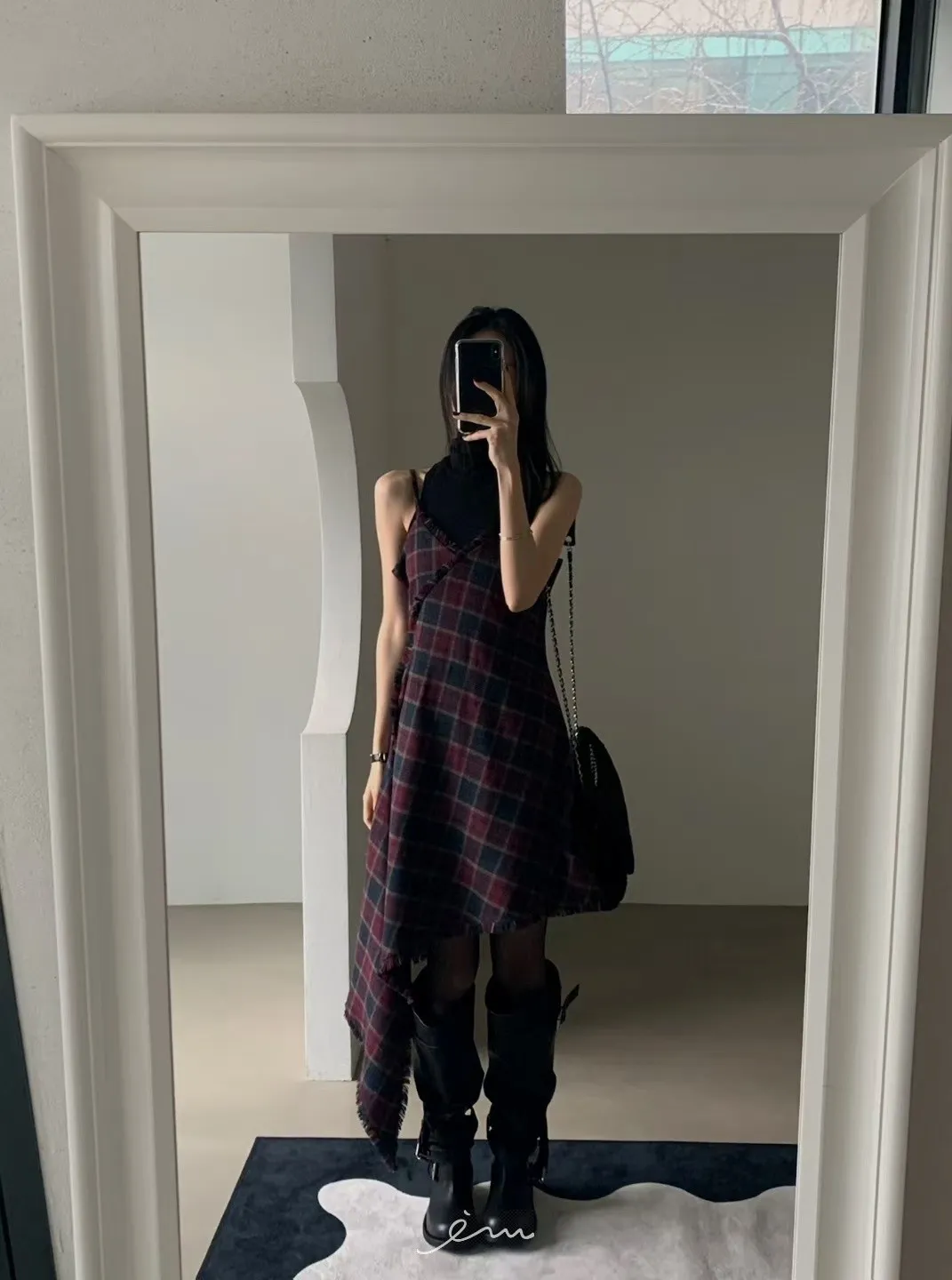 VER法蘭絨鬚鬚邊細肩格紋短洋