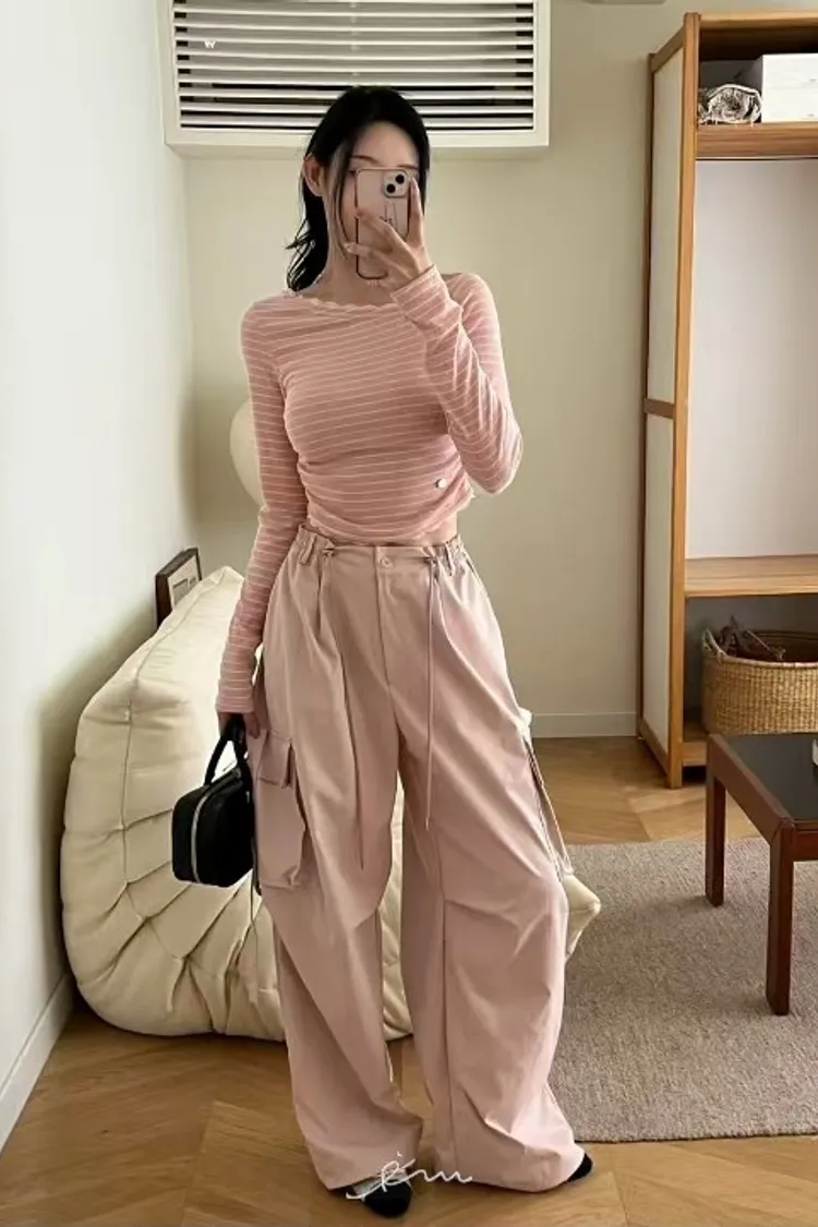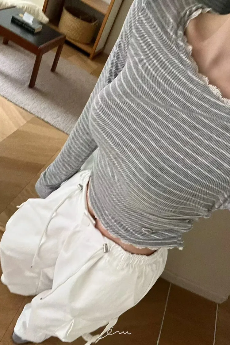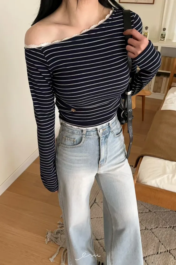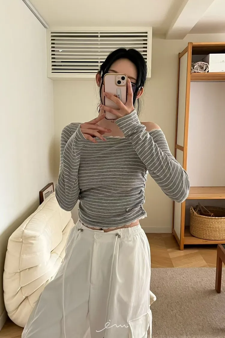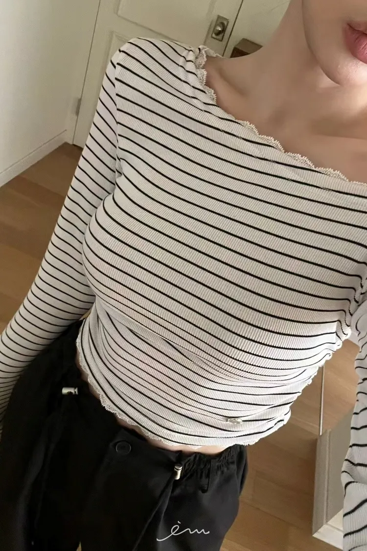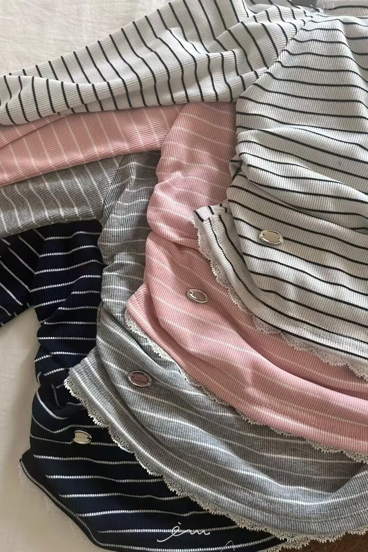 BAI拼蕾絲鐵標側抓皺條紋上衣(限時優惠)