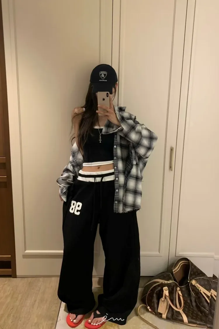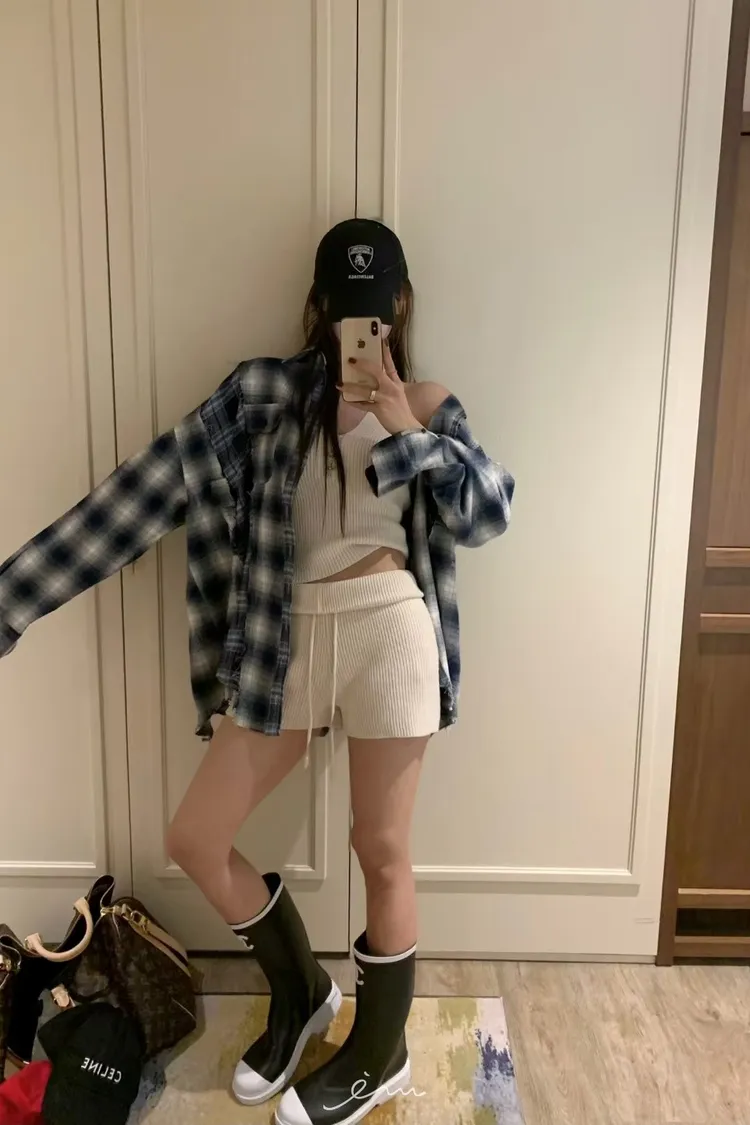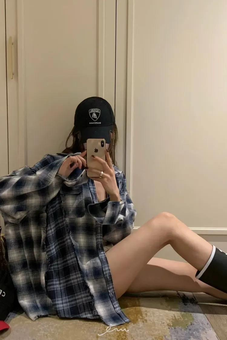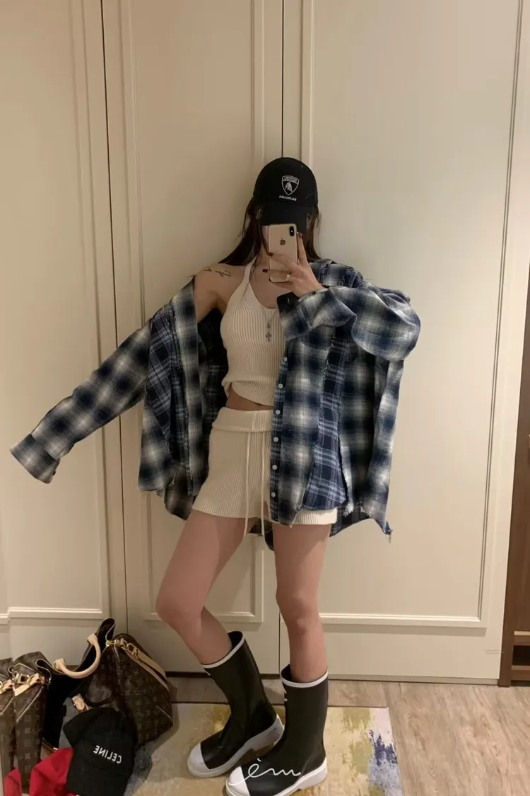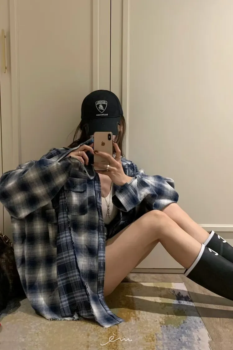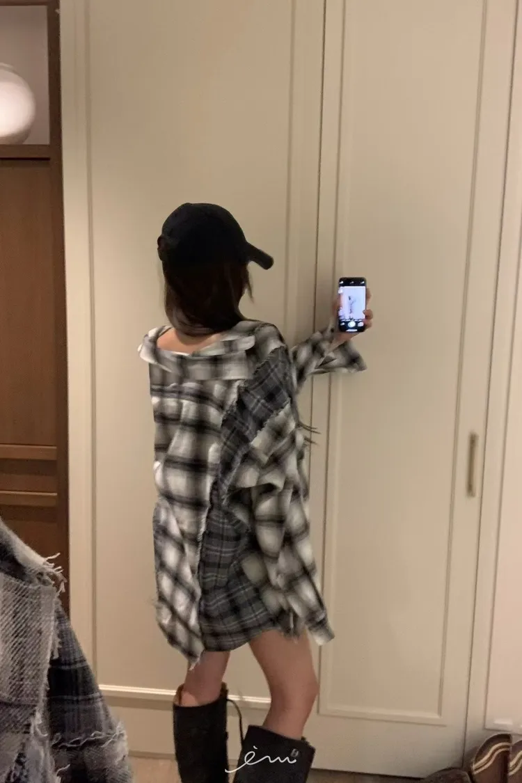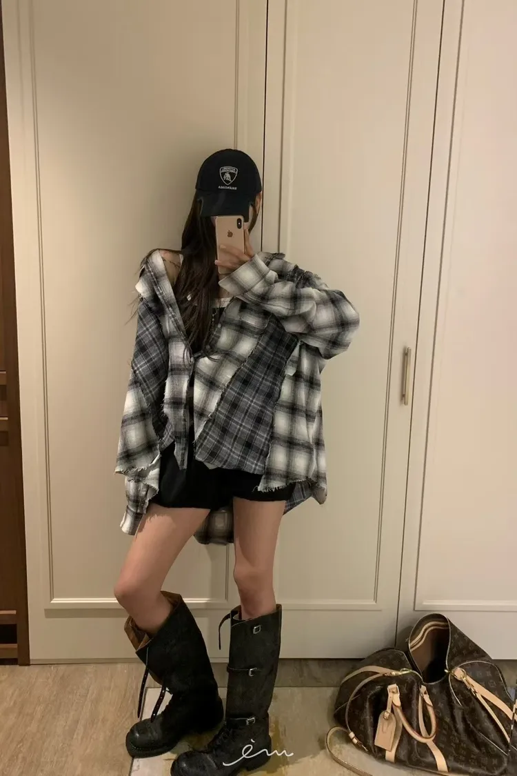 VK拼接鬚鬚雙口袋格紋襯衫