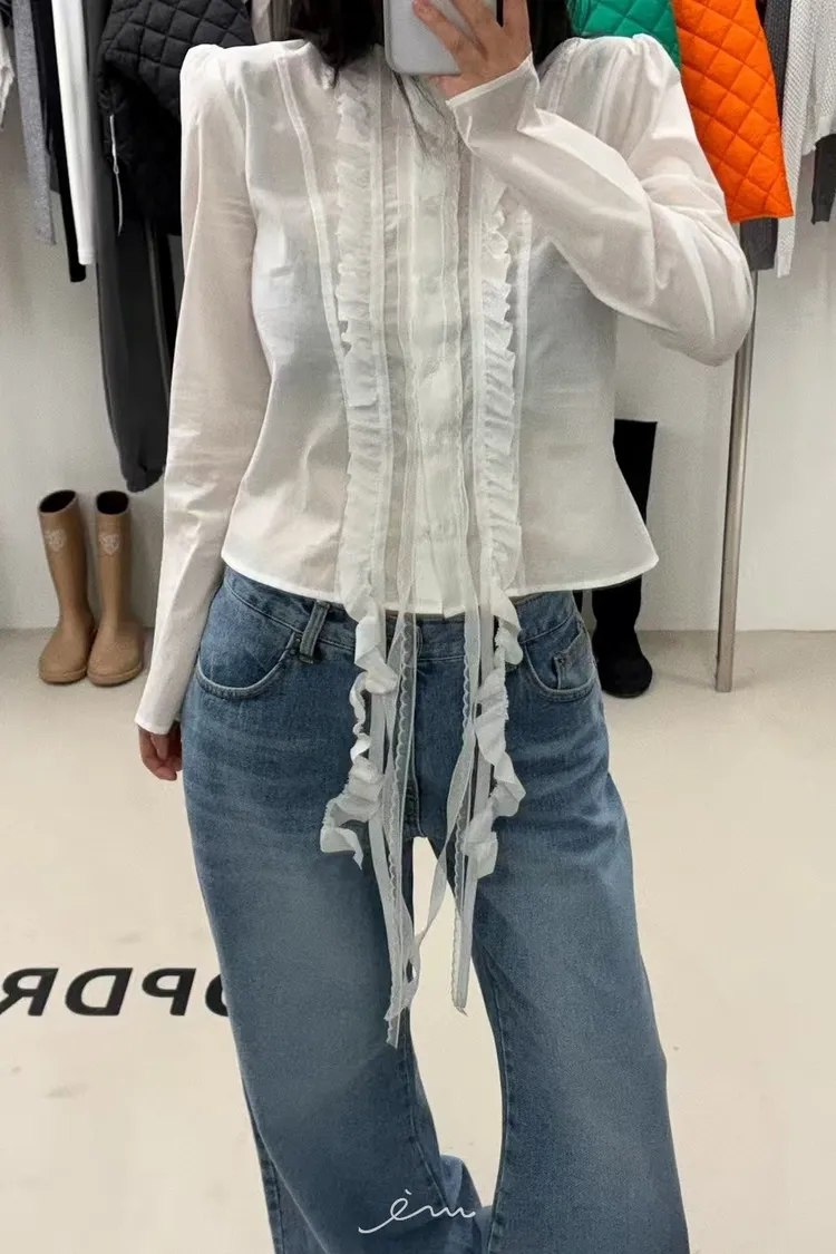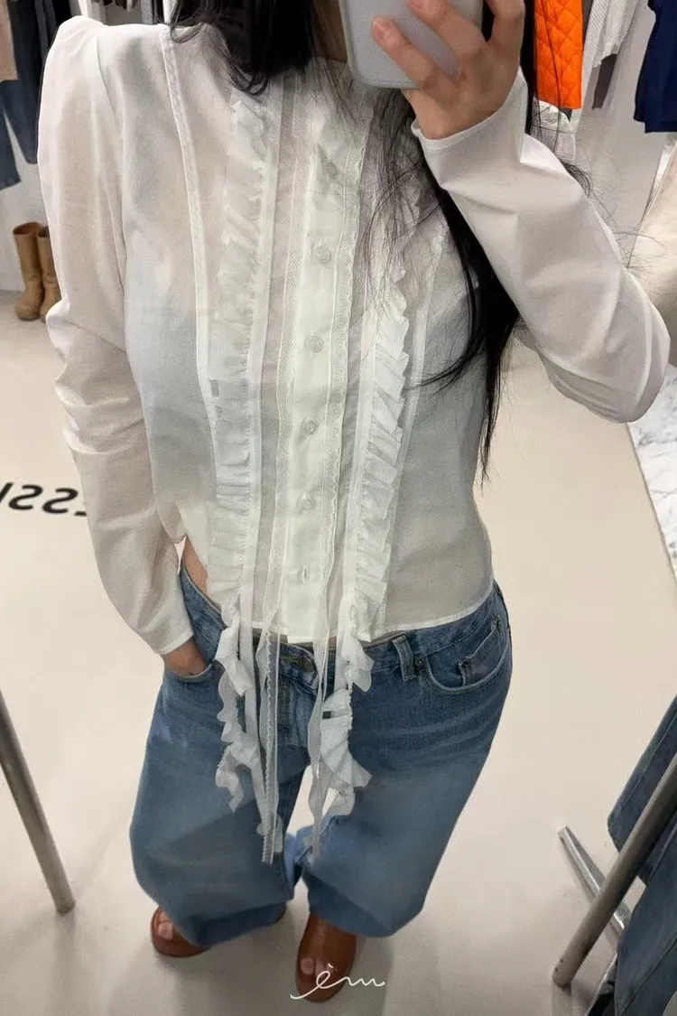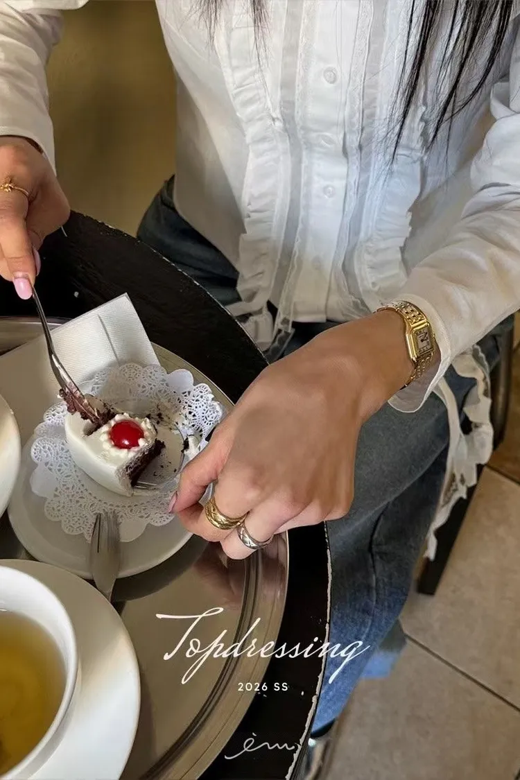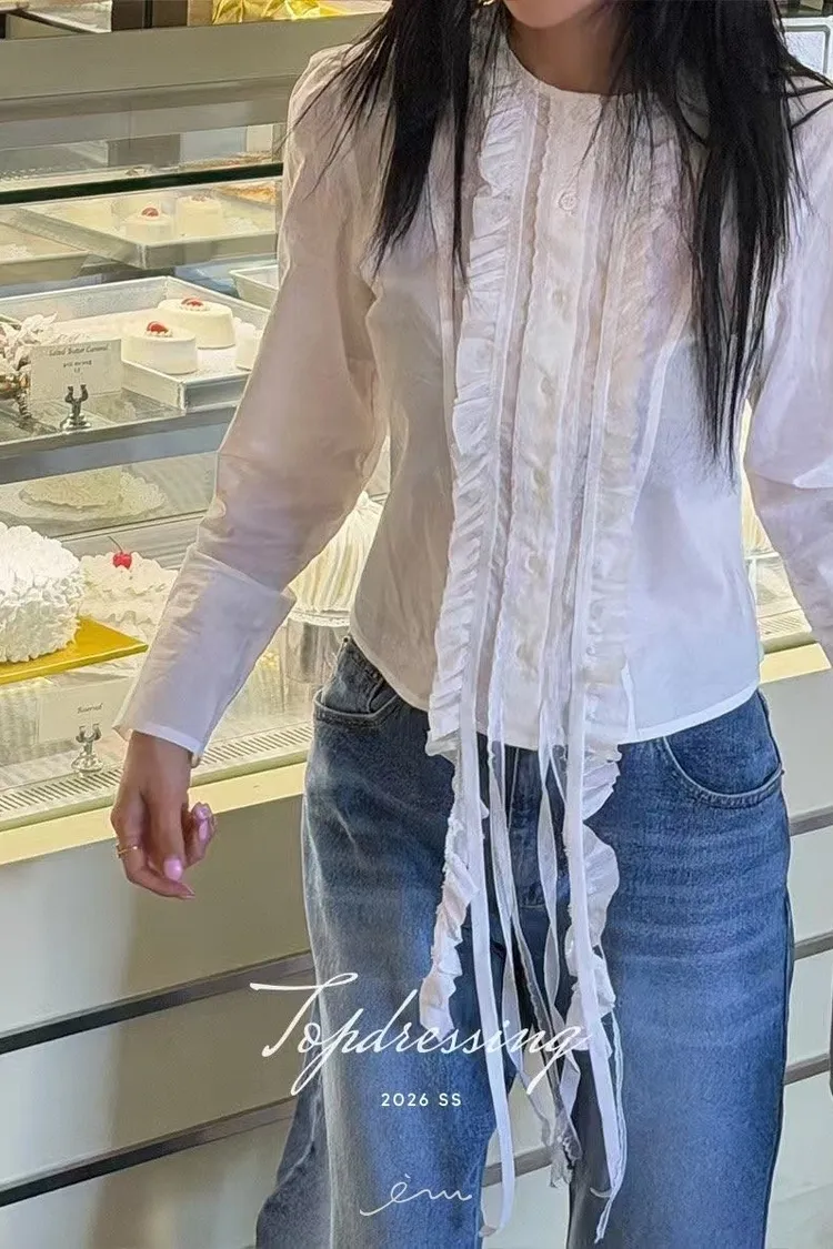 TOP荷葉抽繩蕾絲鈕釦上衣