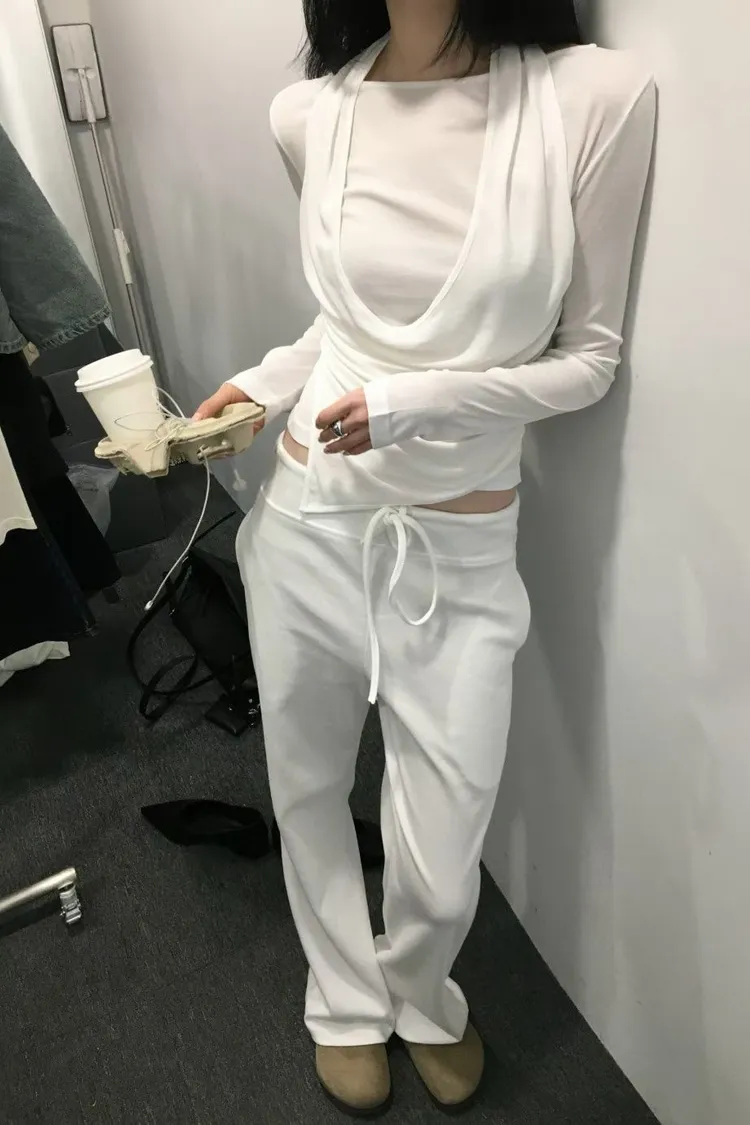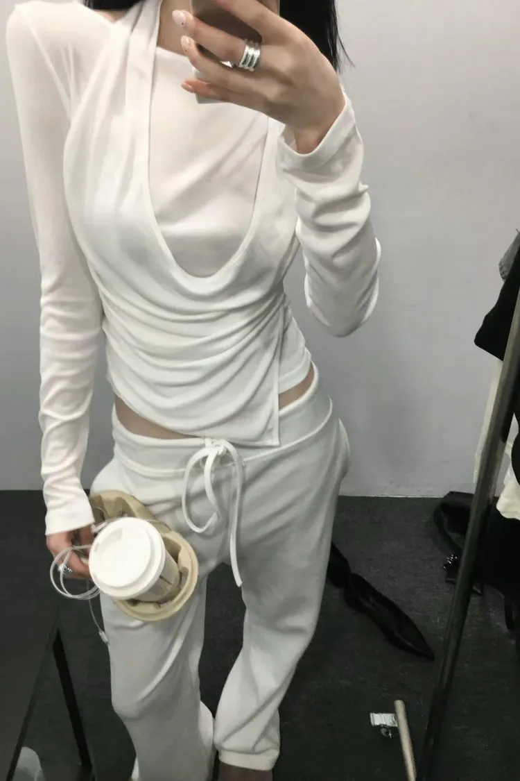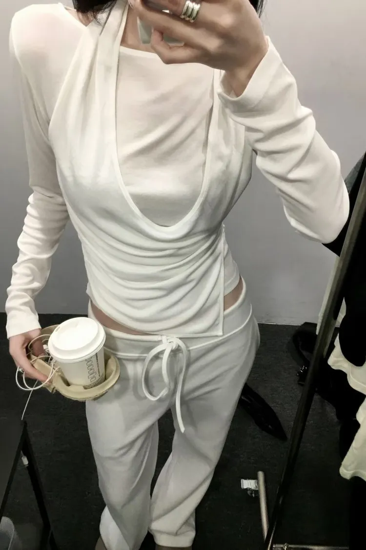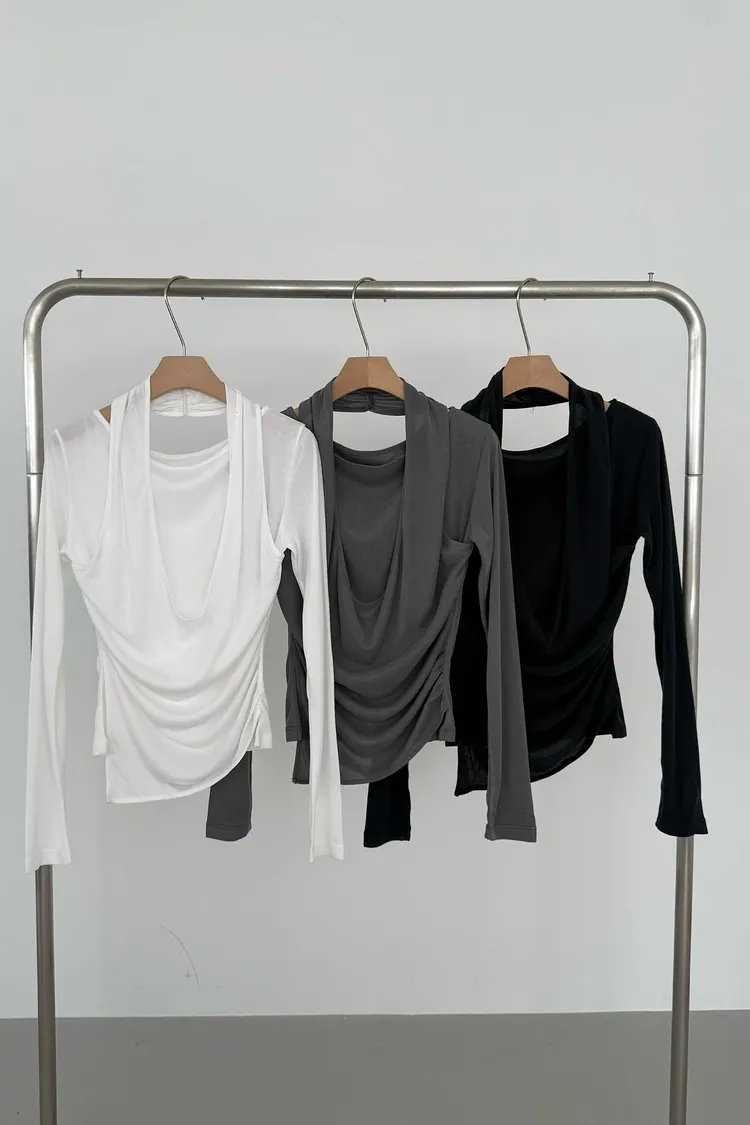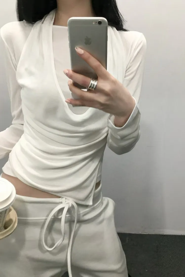 韓女鬆弛感兩件式掛脖抓皺上衣