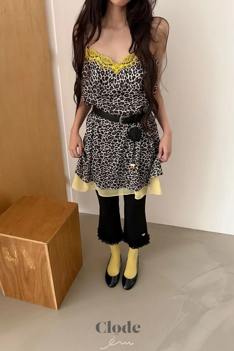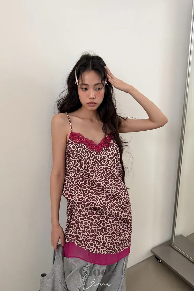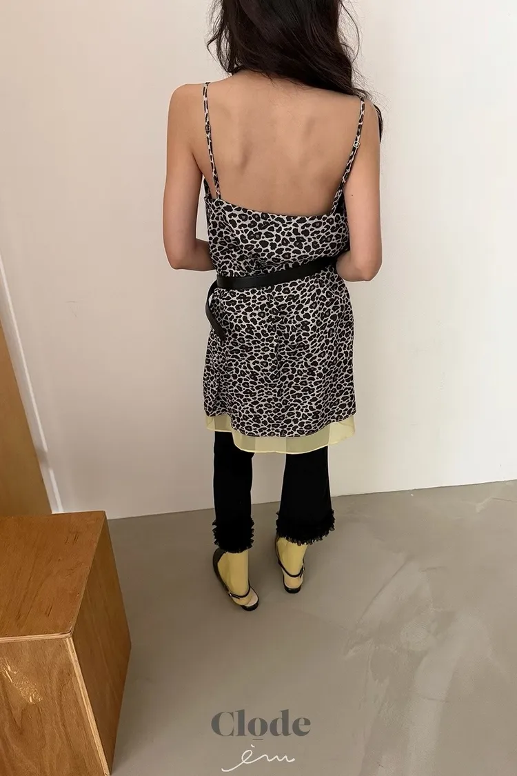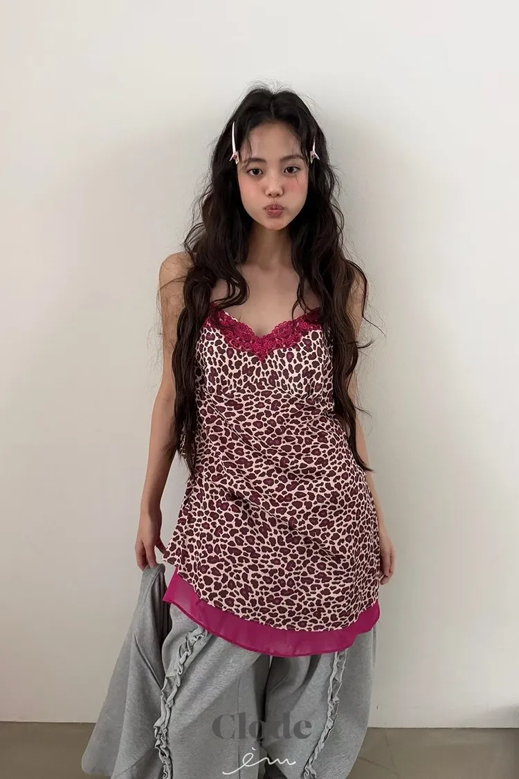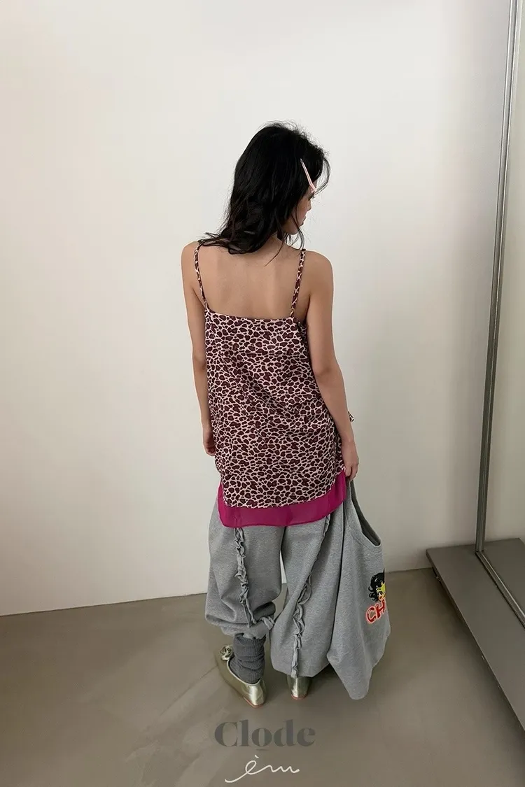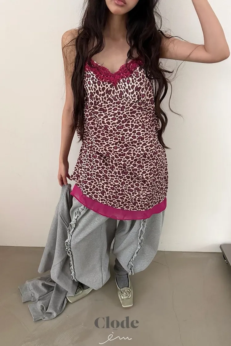 CL下拼紗蕾絲豹紋細肩背心