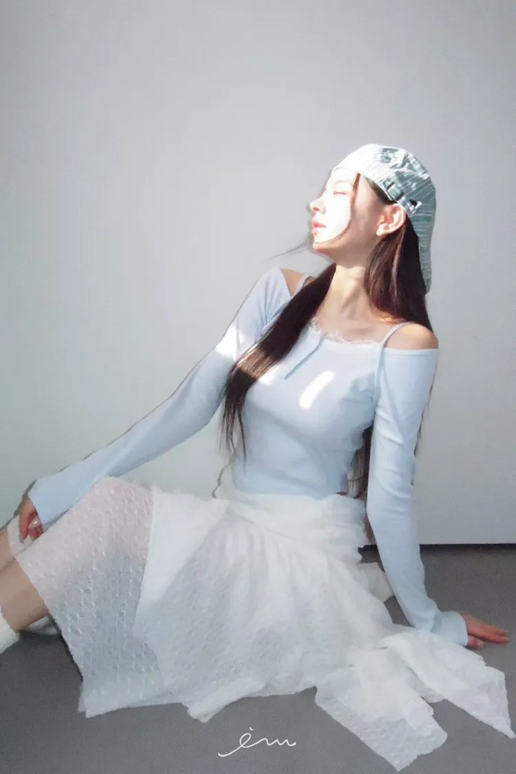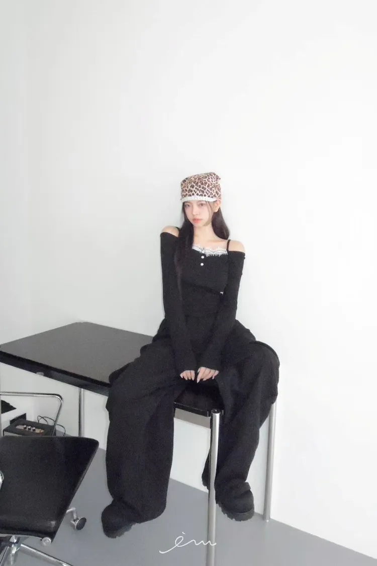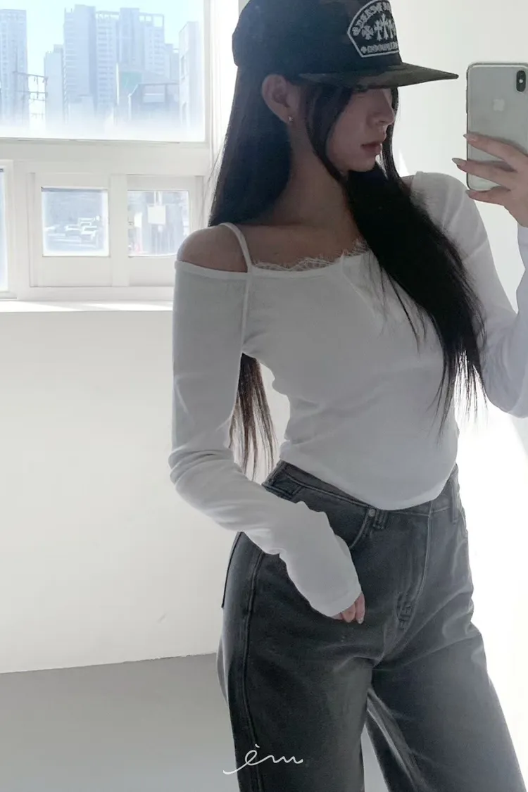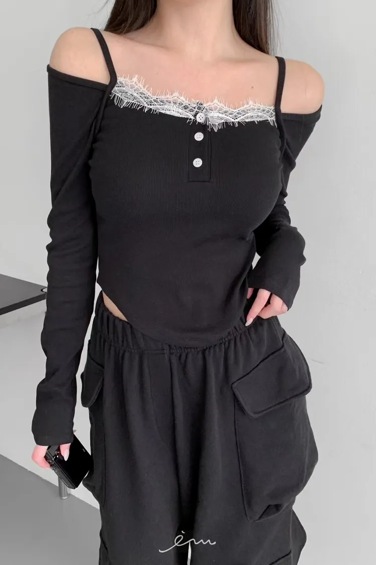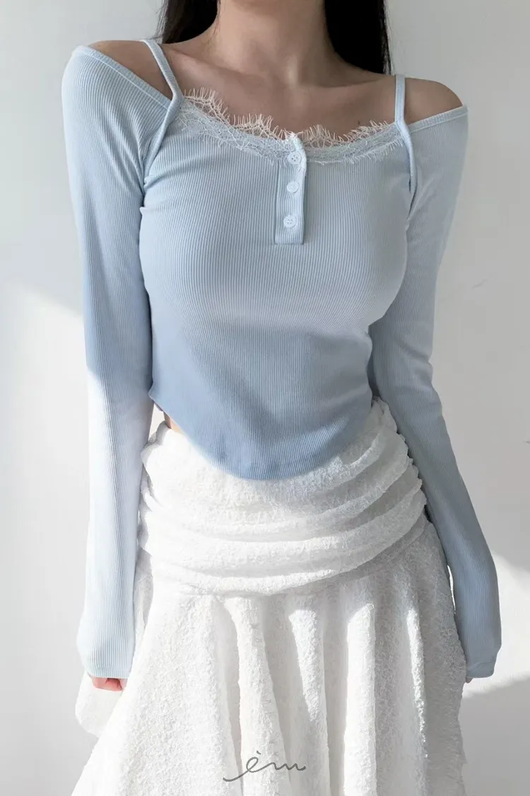 MON三釦細肩蕾絲一字領衣