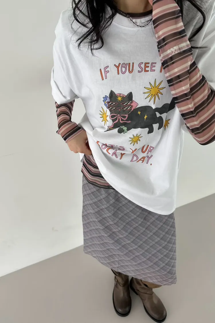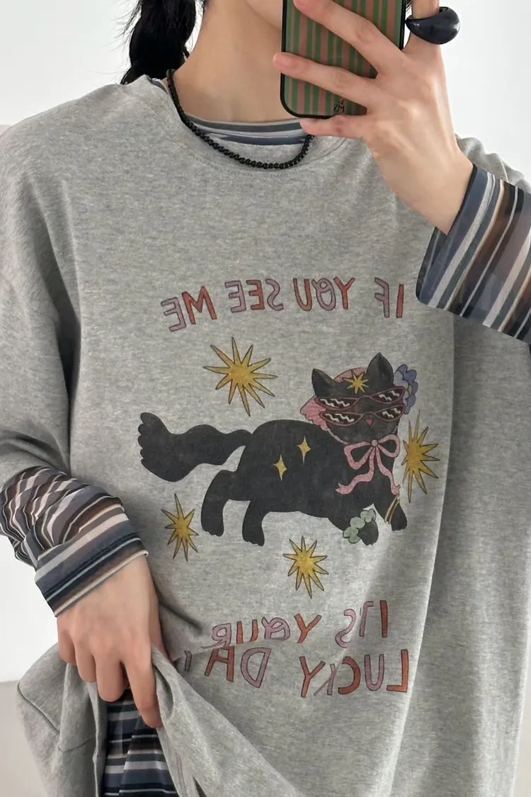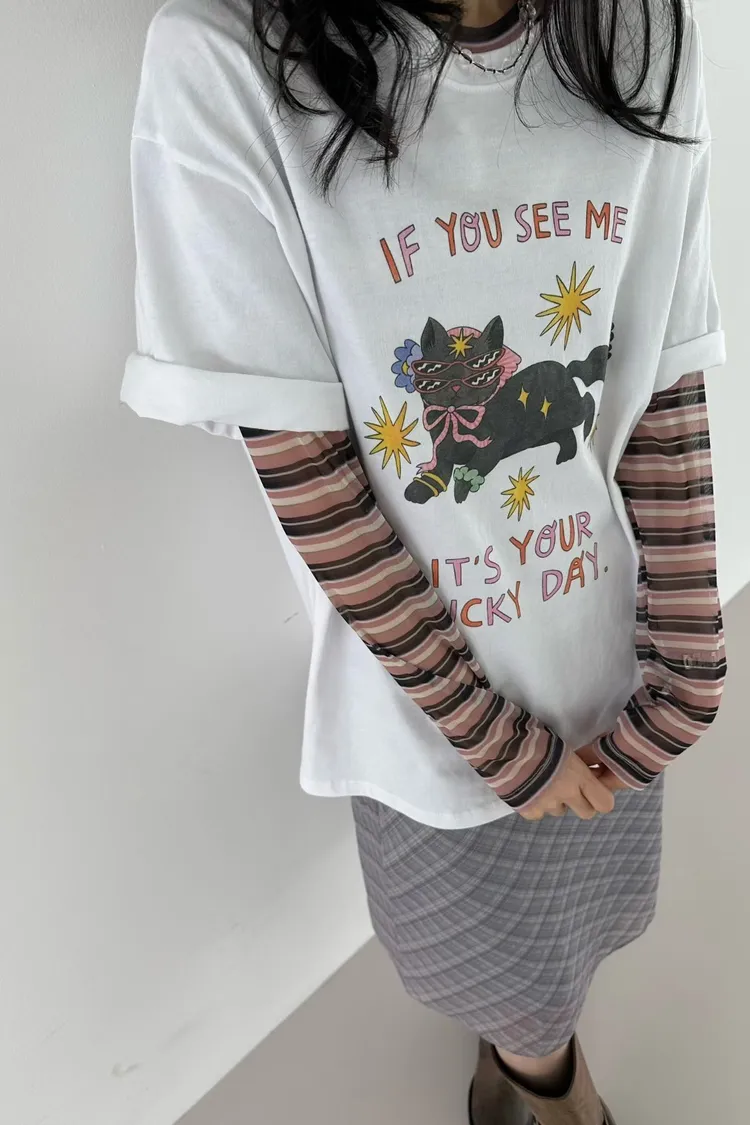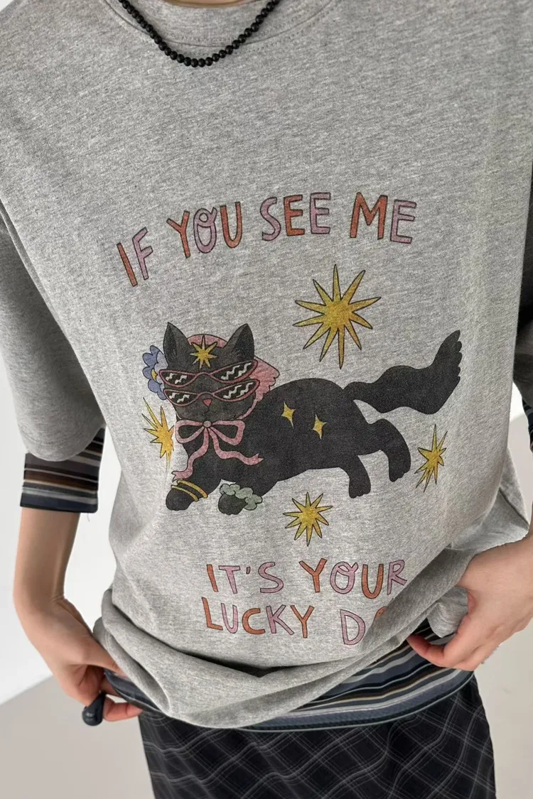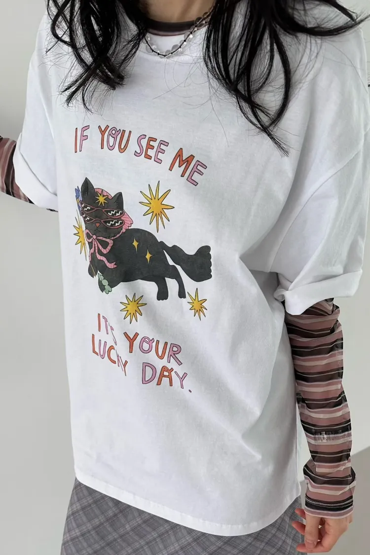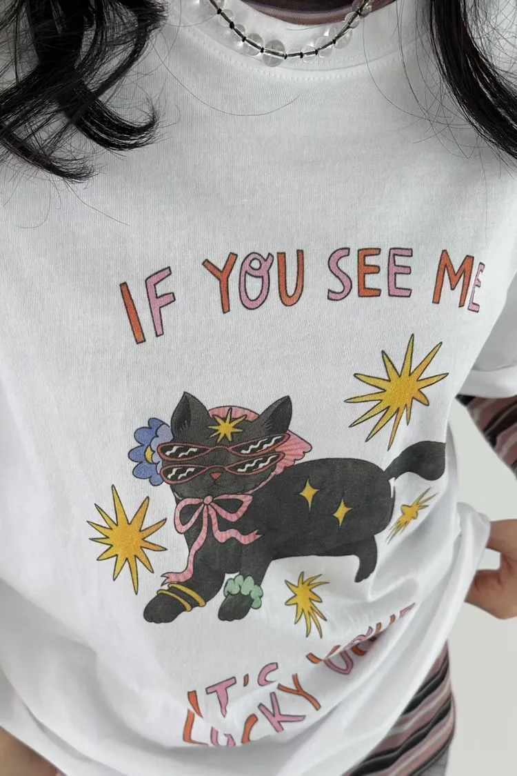 看到會幸運戴墨鏡頭巾貓貓英字T