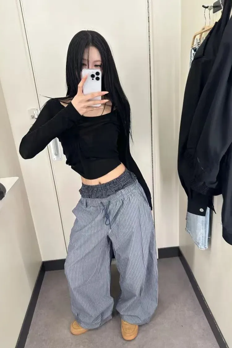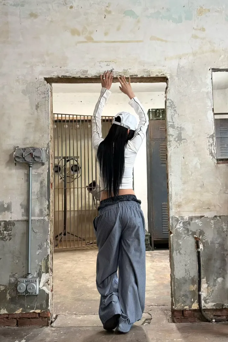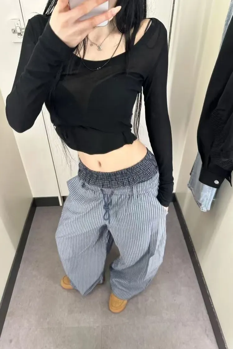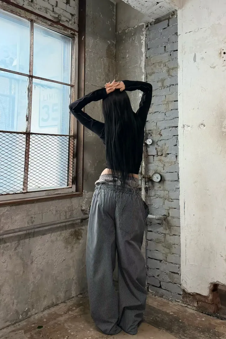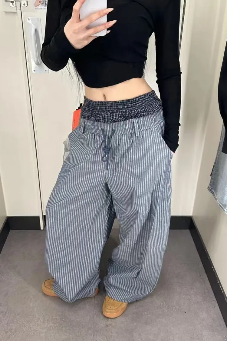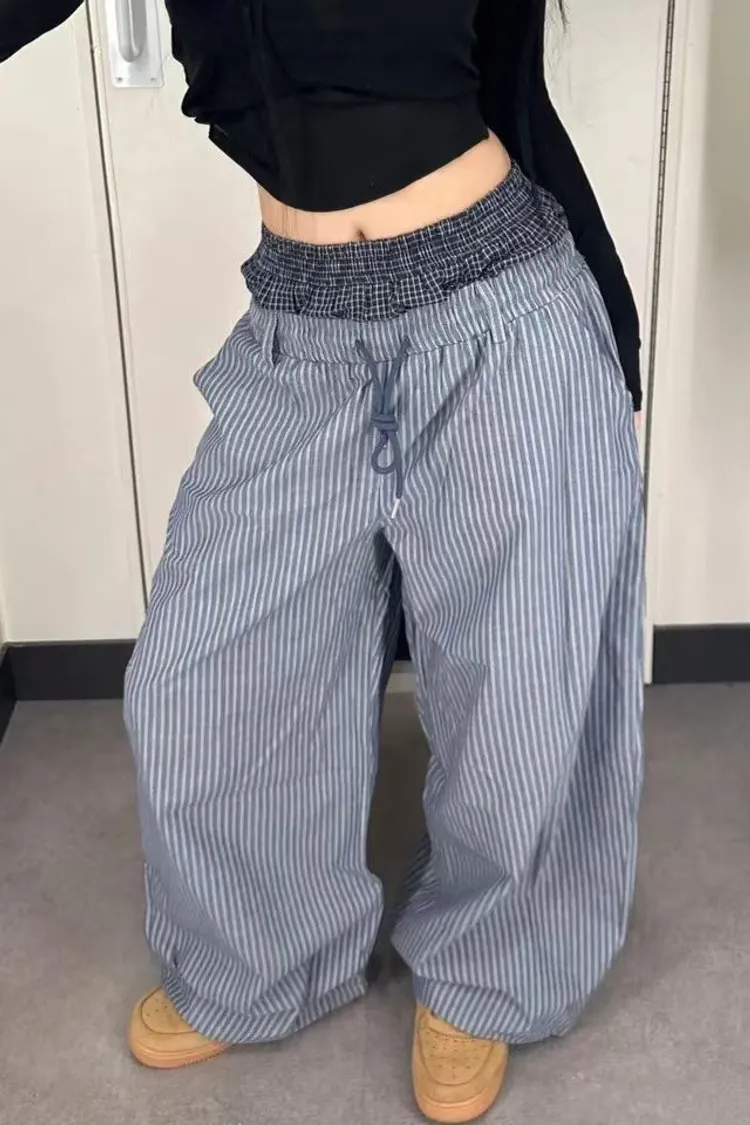 雙褲頭格紋直條抽繩褲