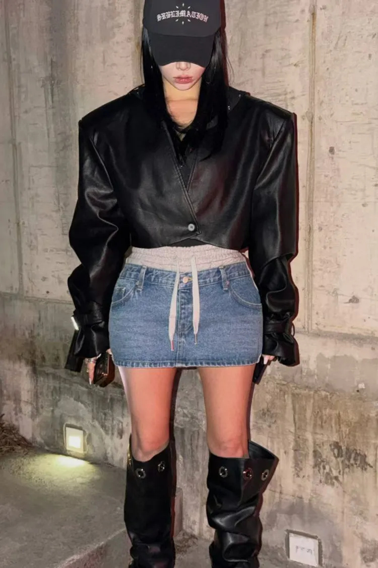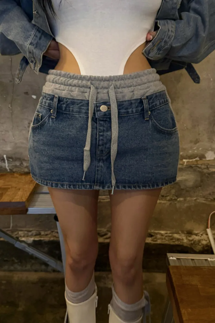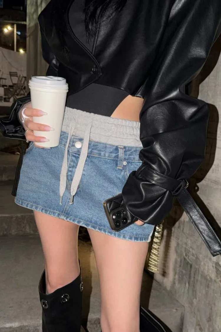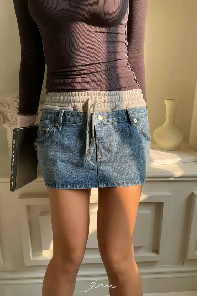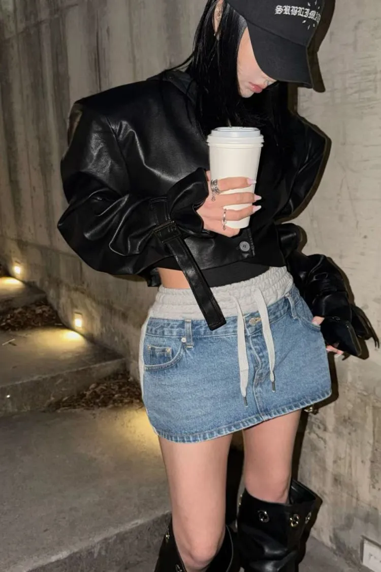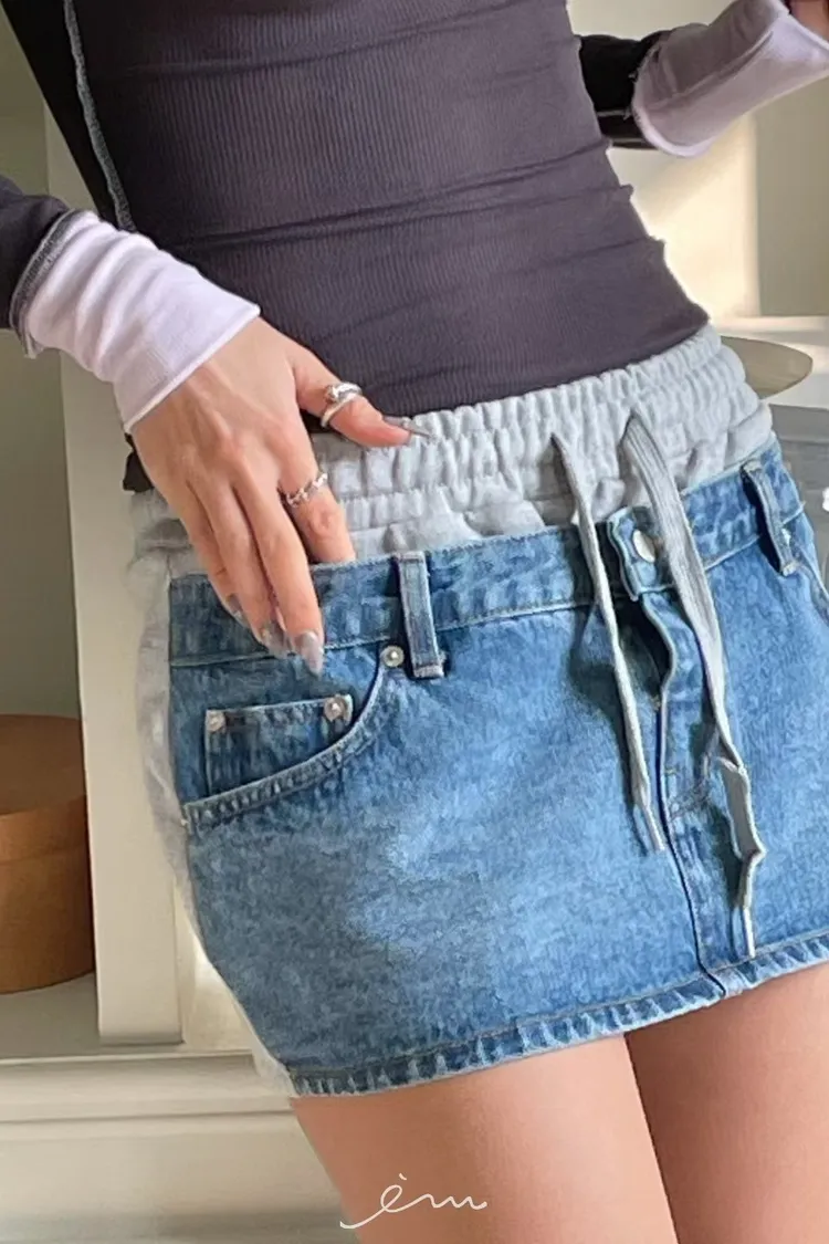 拼異材質抽牛仔短裙