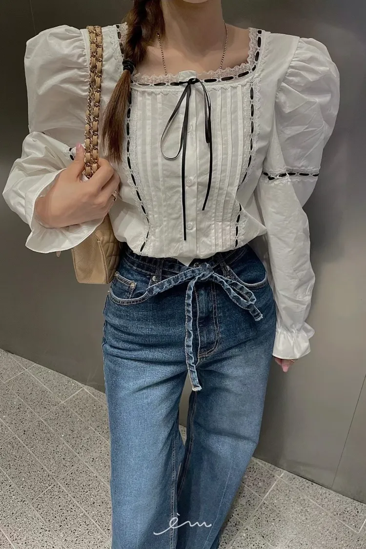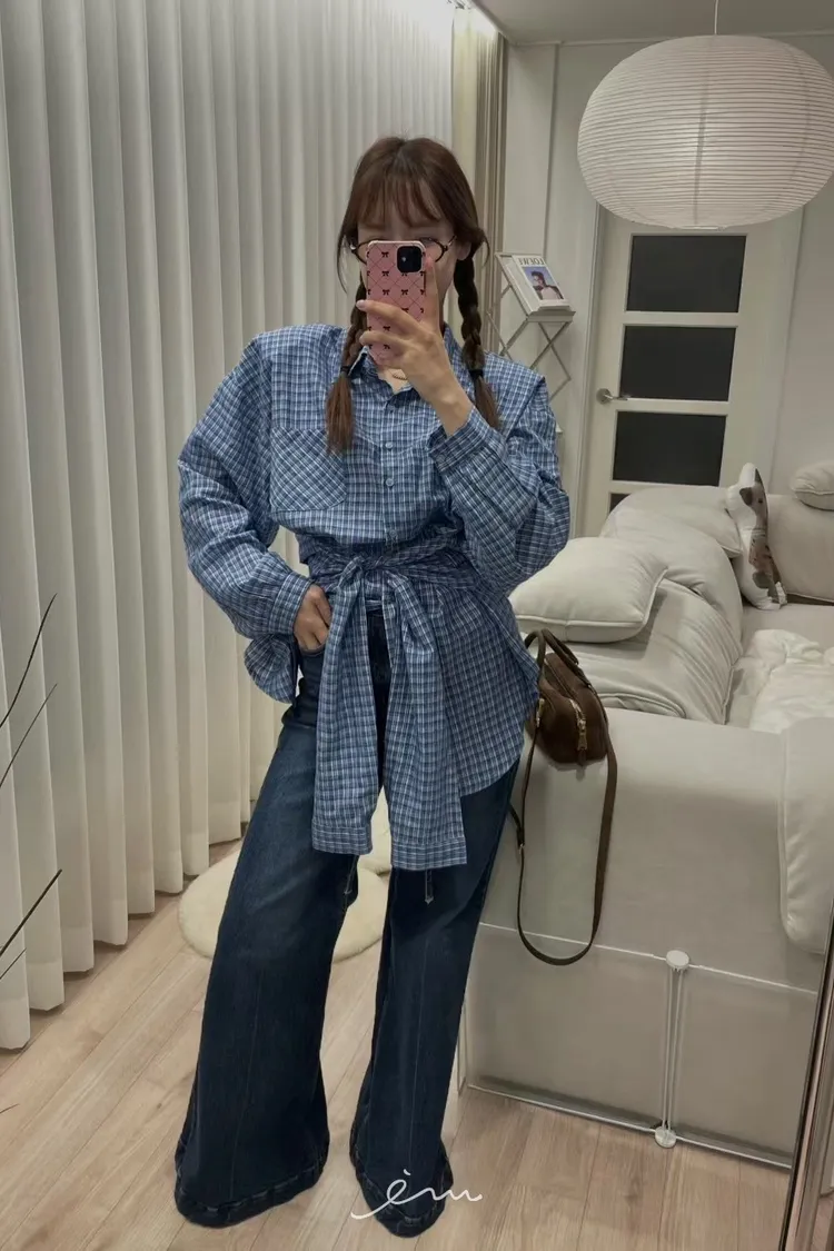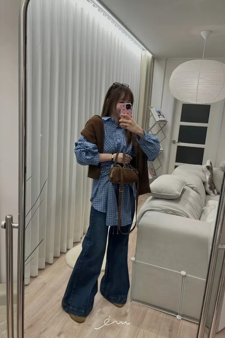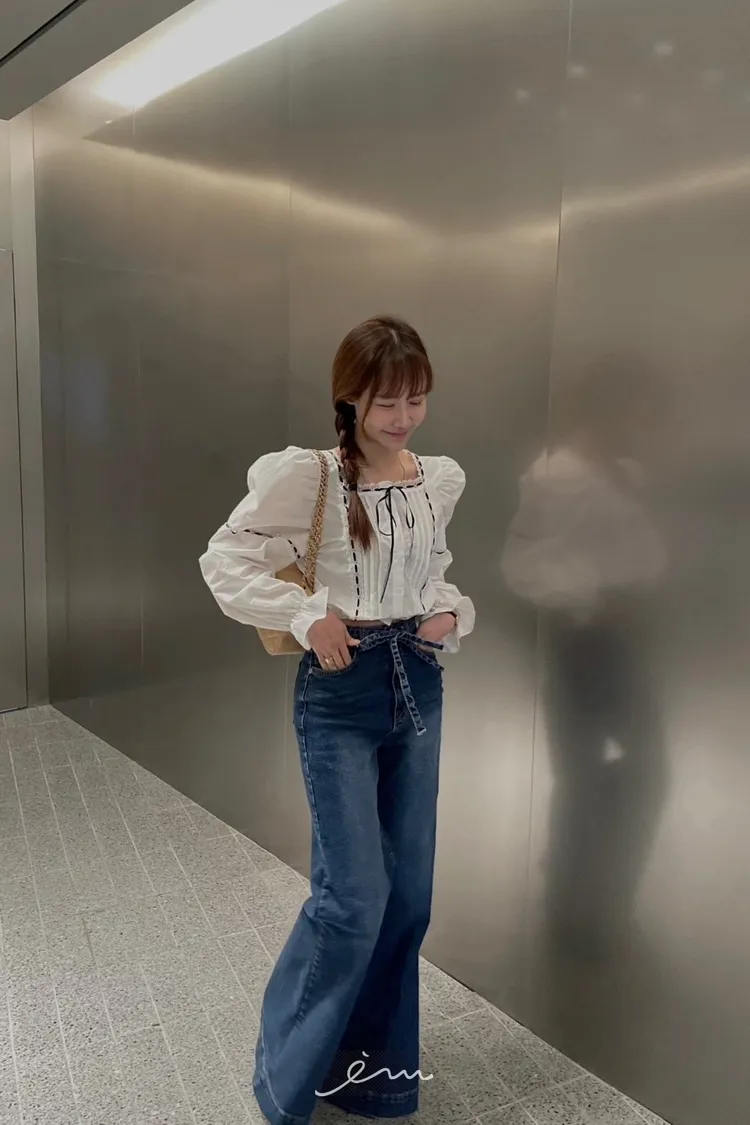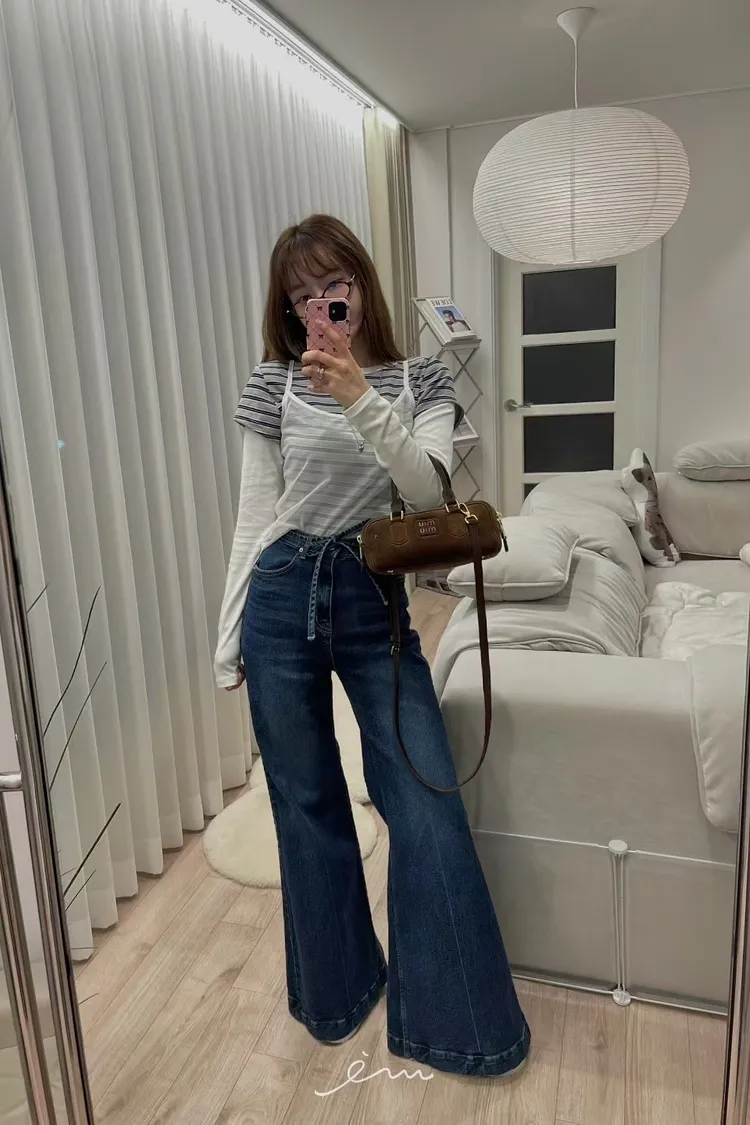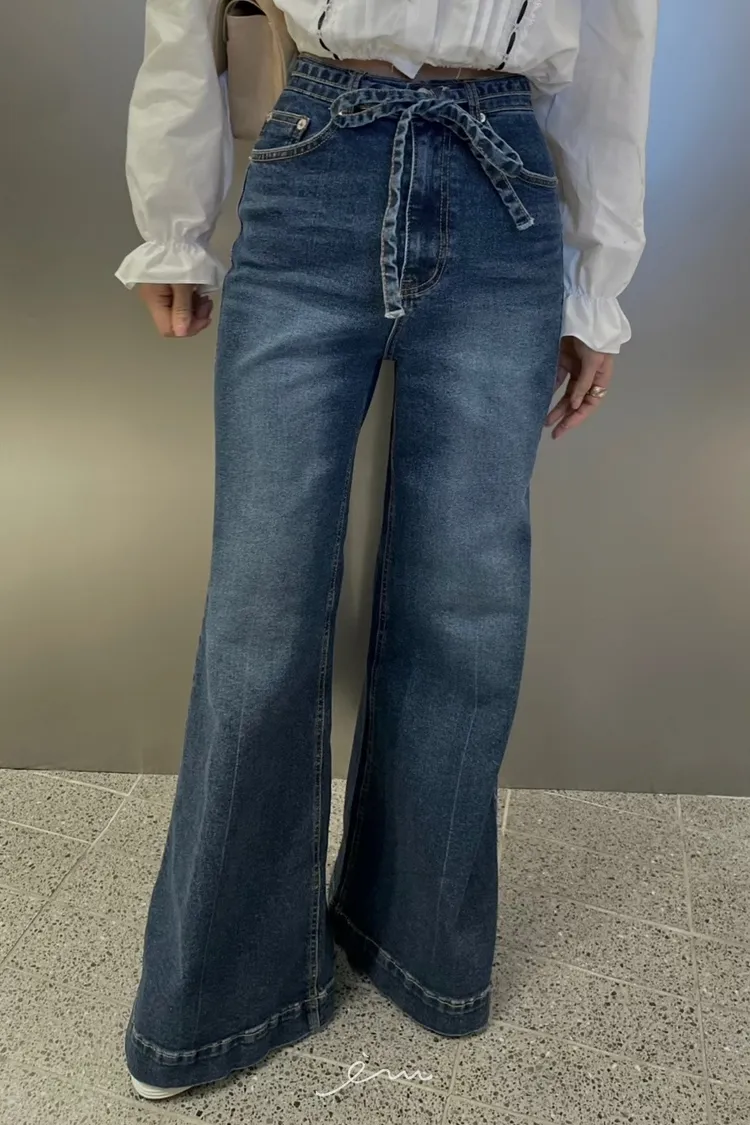 MI繩子+彈性牛仔微喇叭寬褲