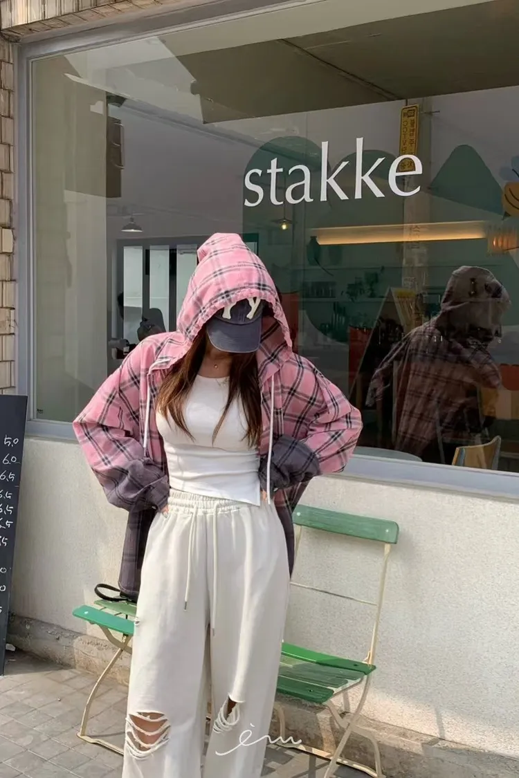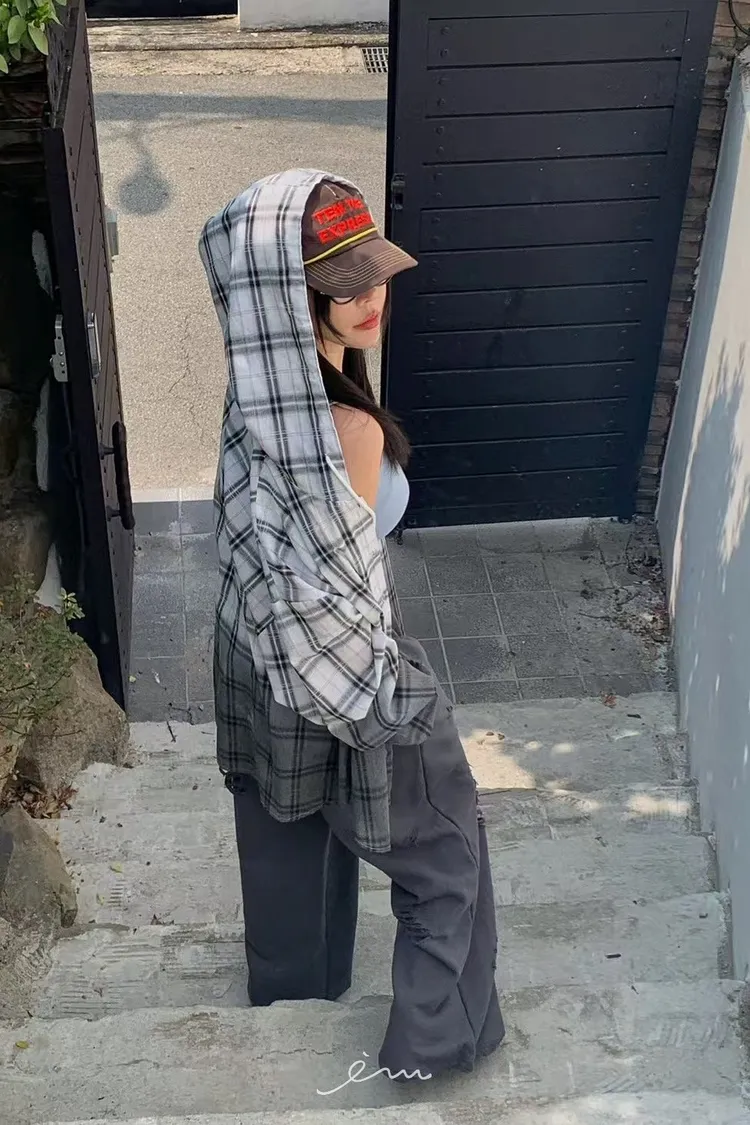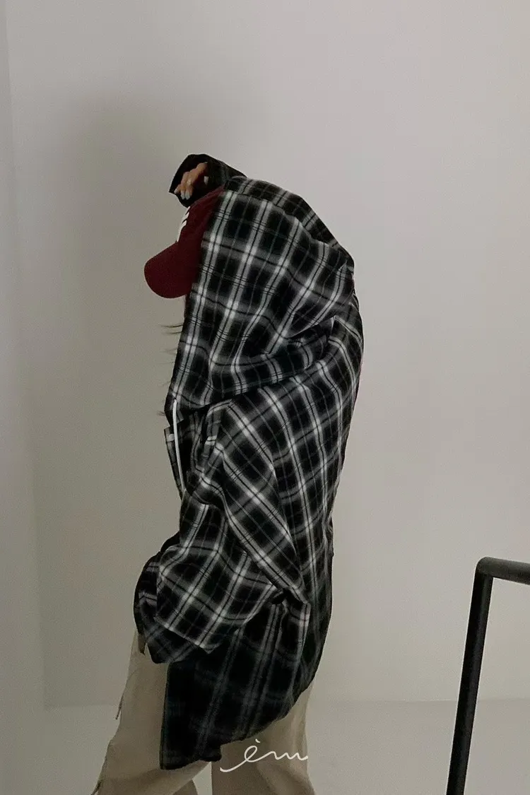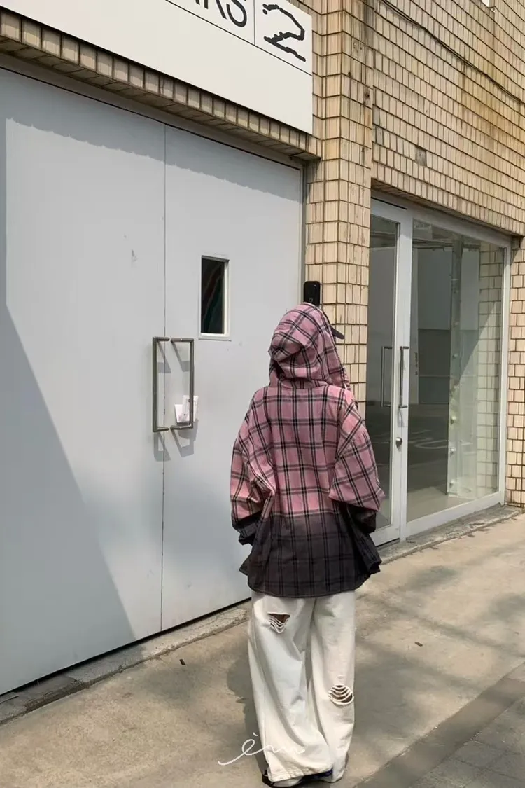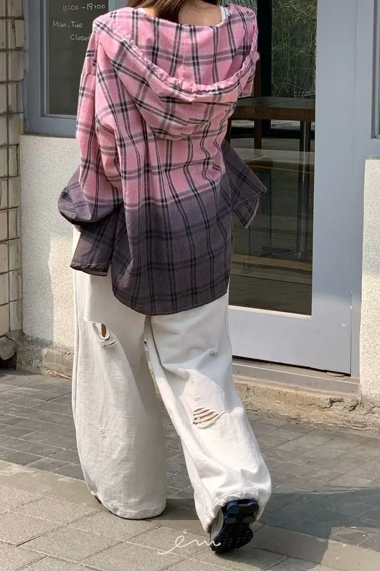 RE黑漸層格紋連帽襯衫