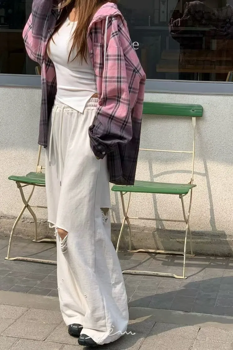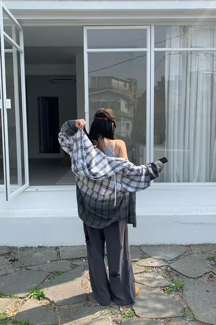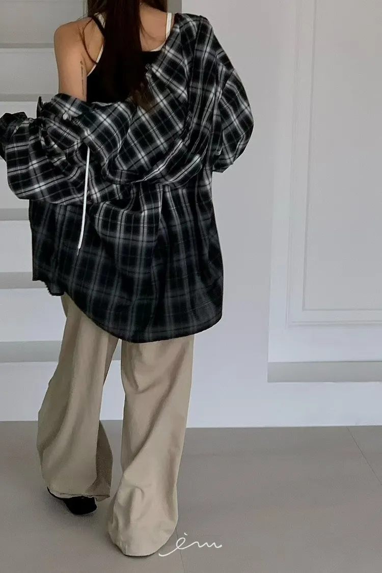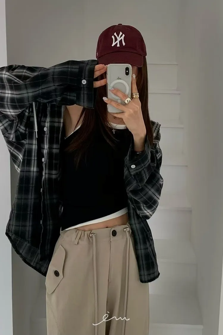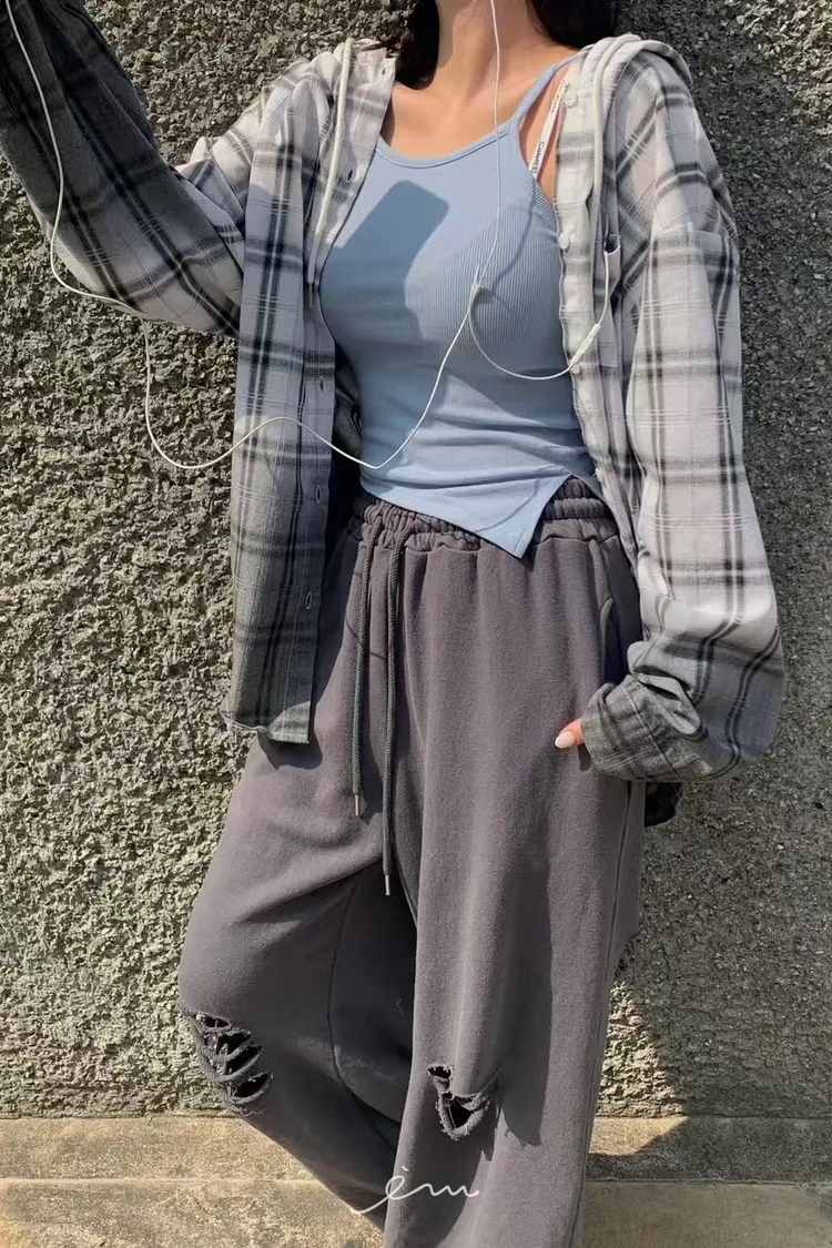RE黑漸層格紋連帽襯衫