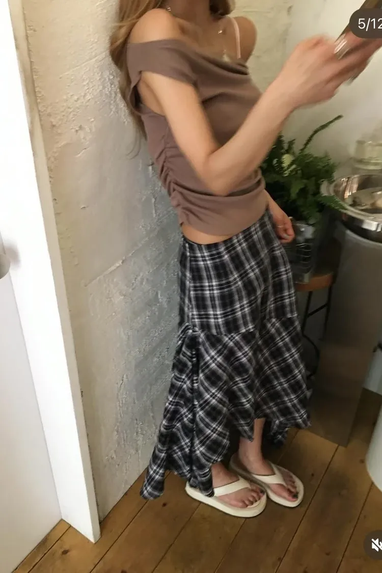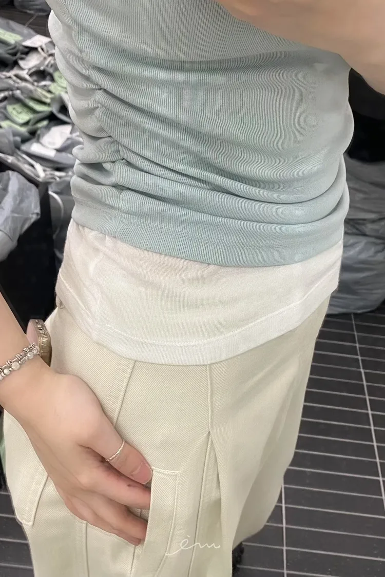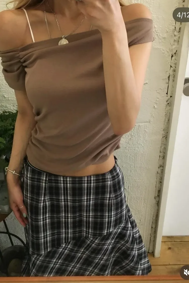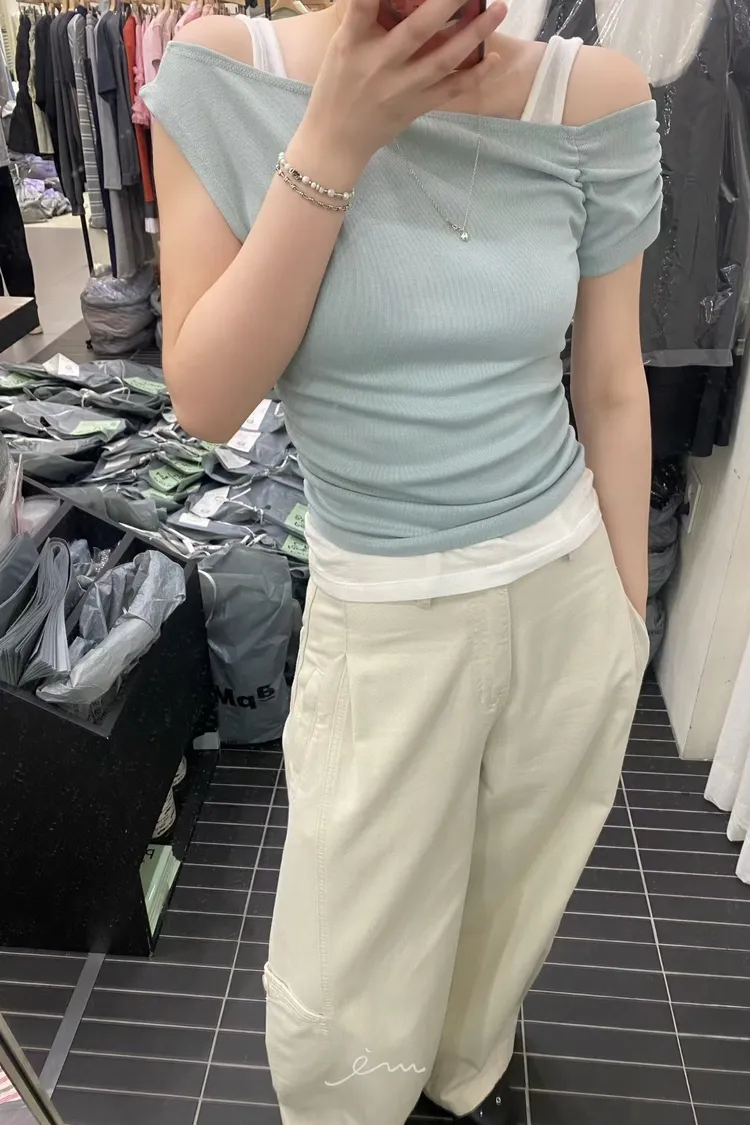 PER側抓皺斜肩素面衣