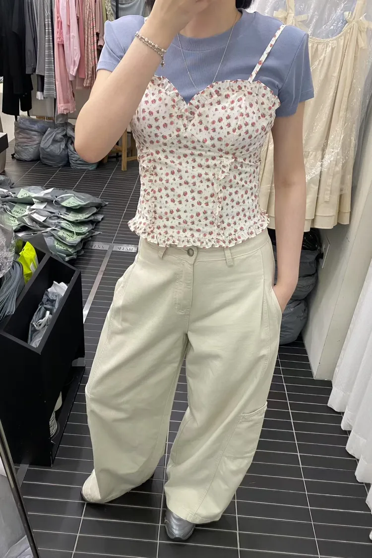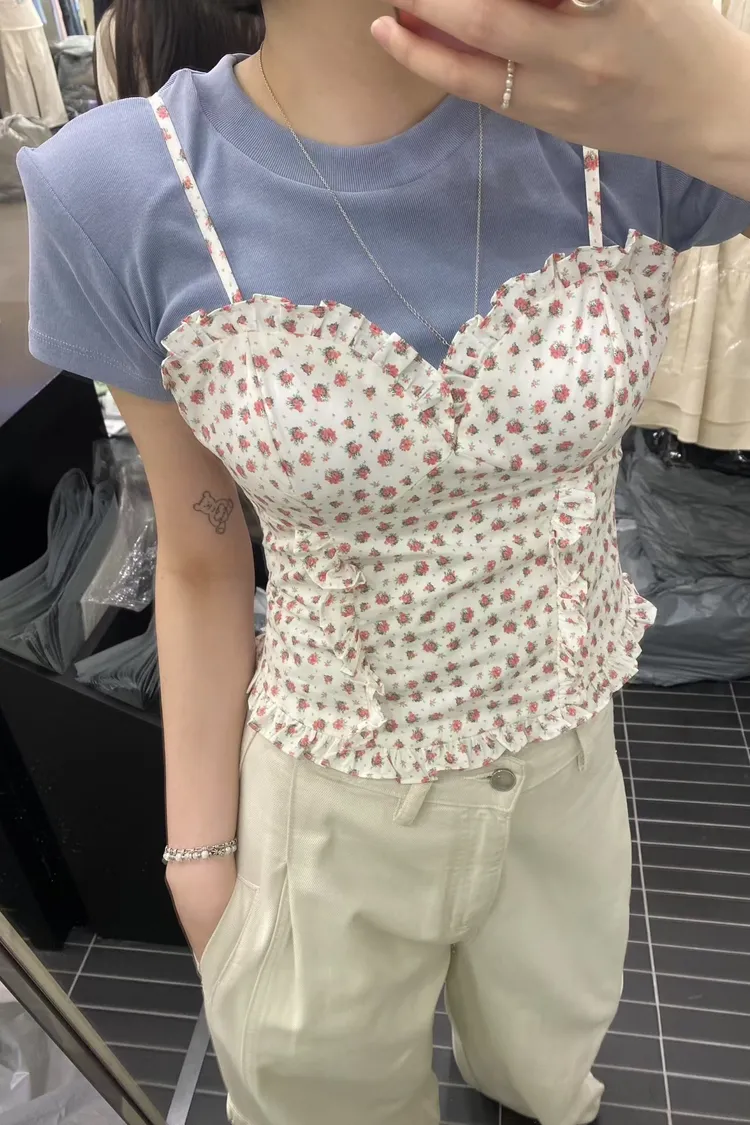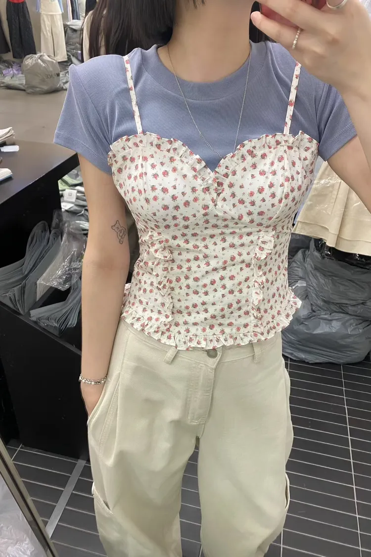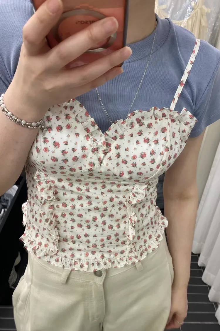 PER荷葉細肩碎花馬甲罩杯背心