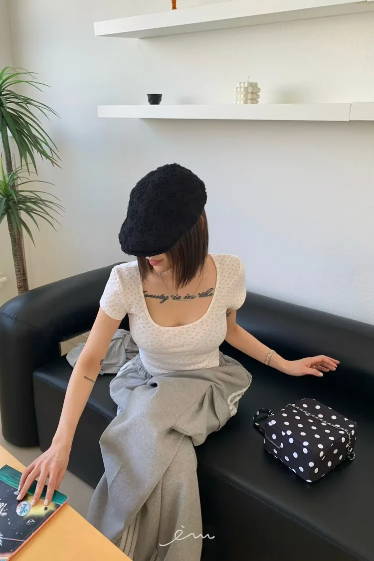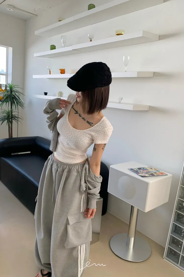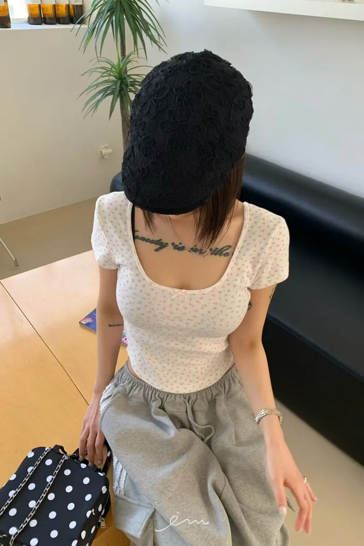 OK小蝴蝶結碎花大圓領T