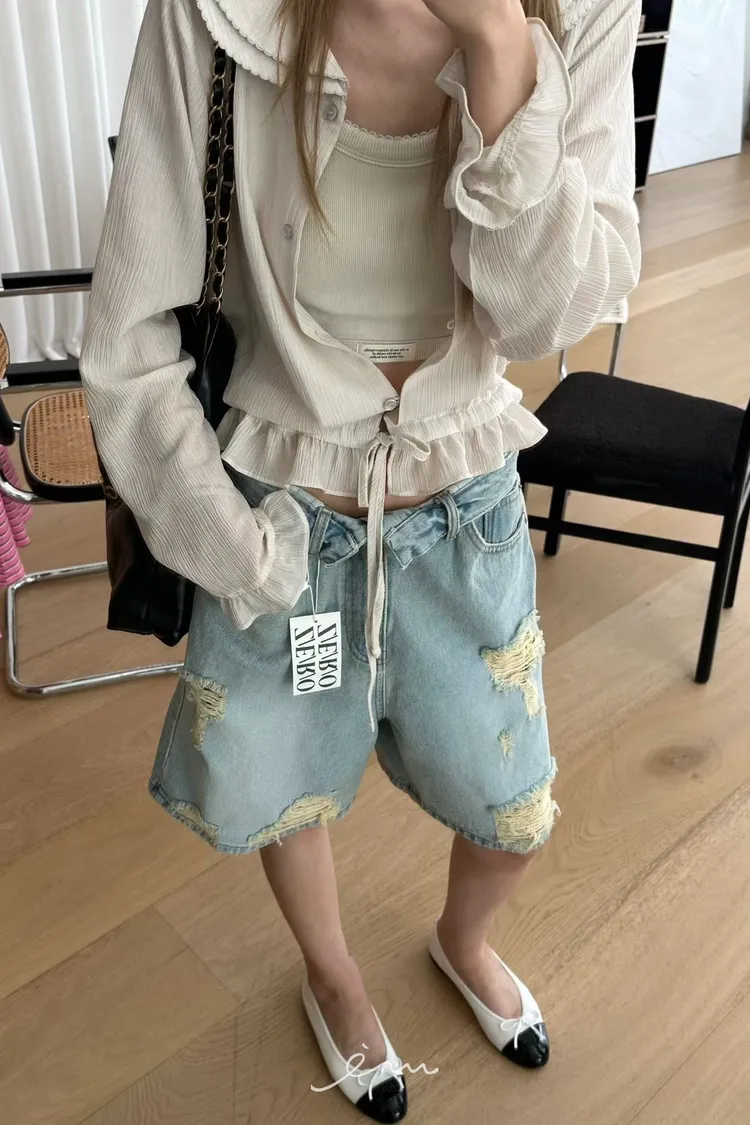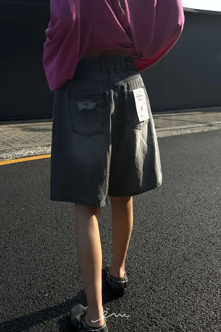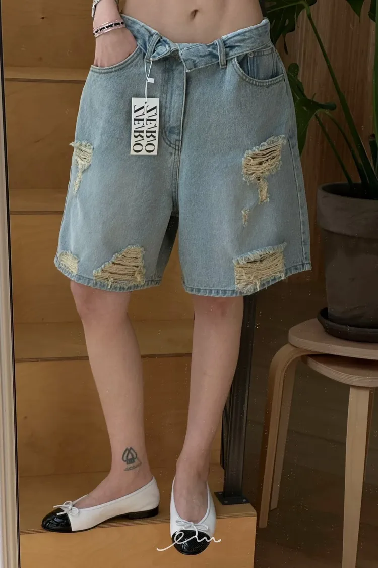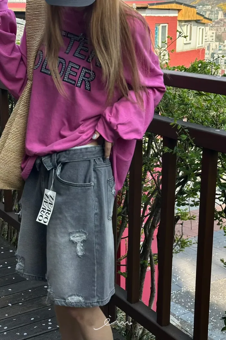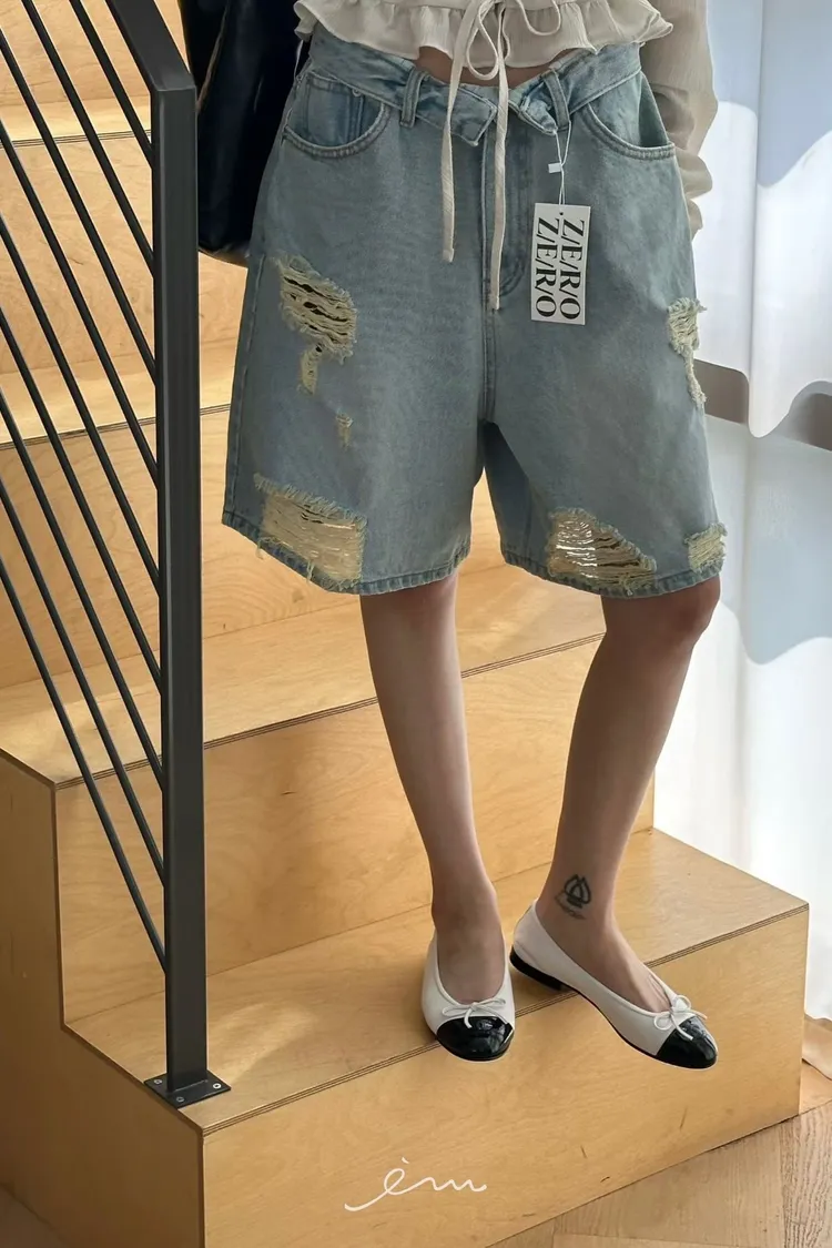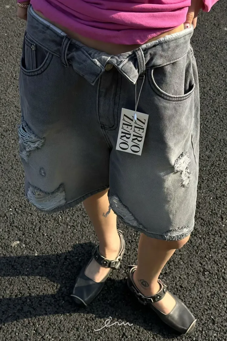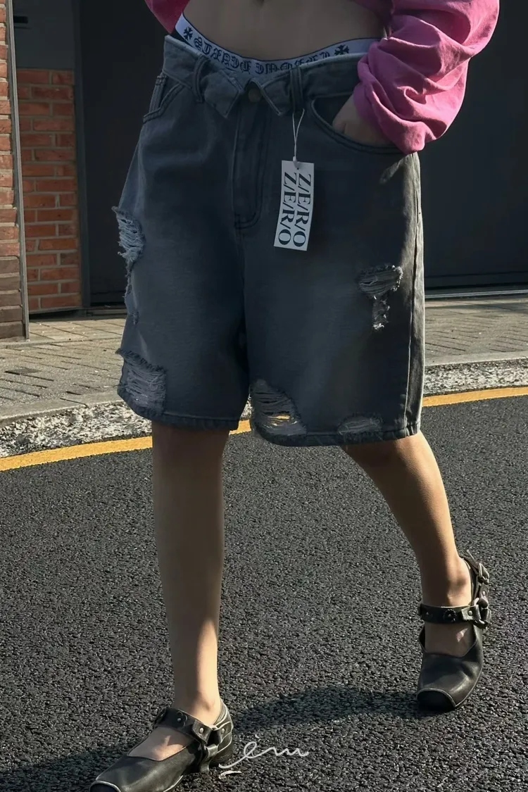 ZERO反摺褲頭刷破六分牛仔褲(肉0清單)