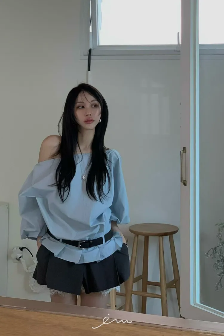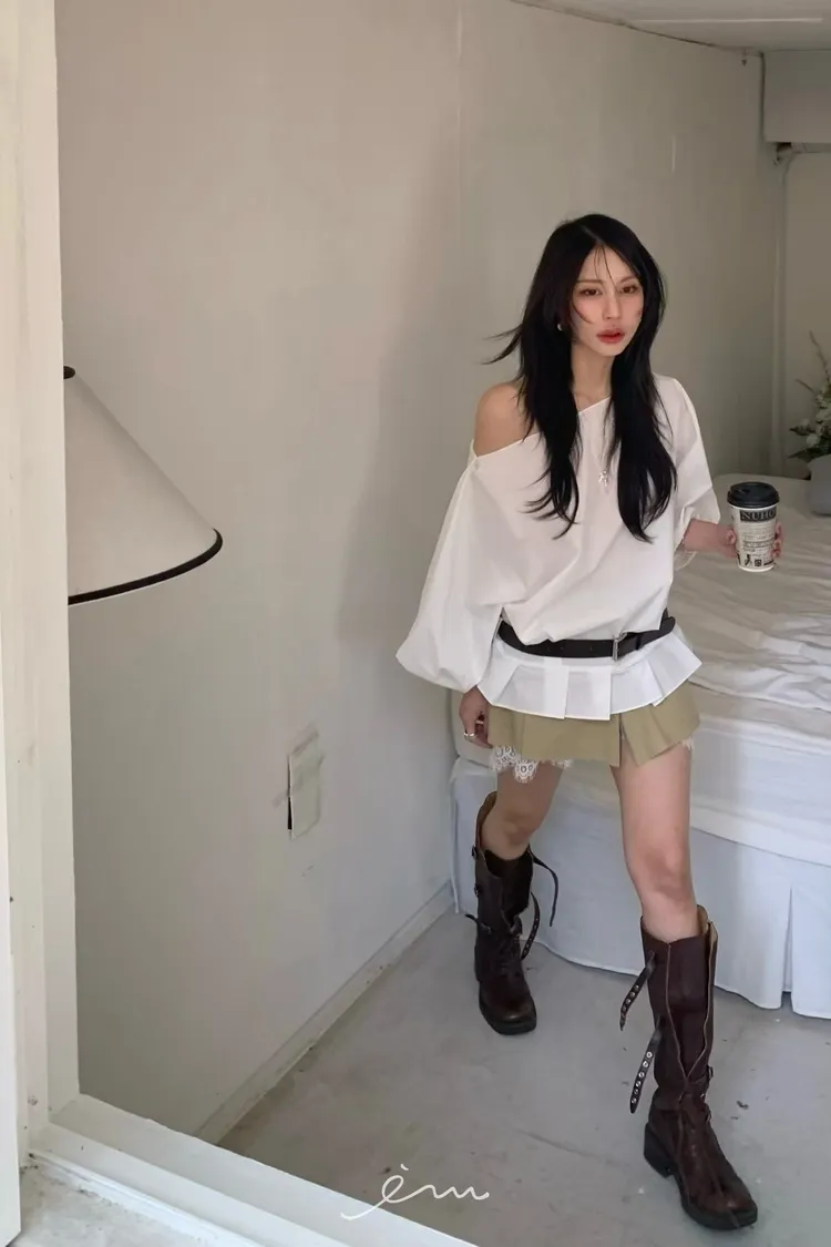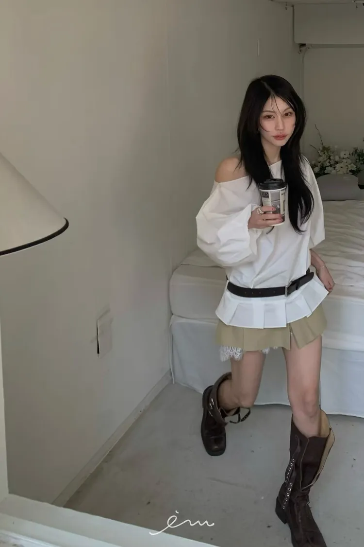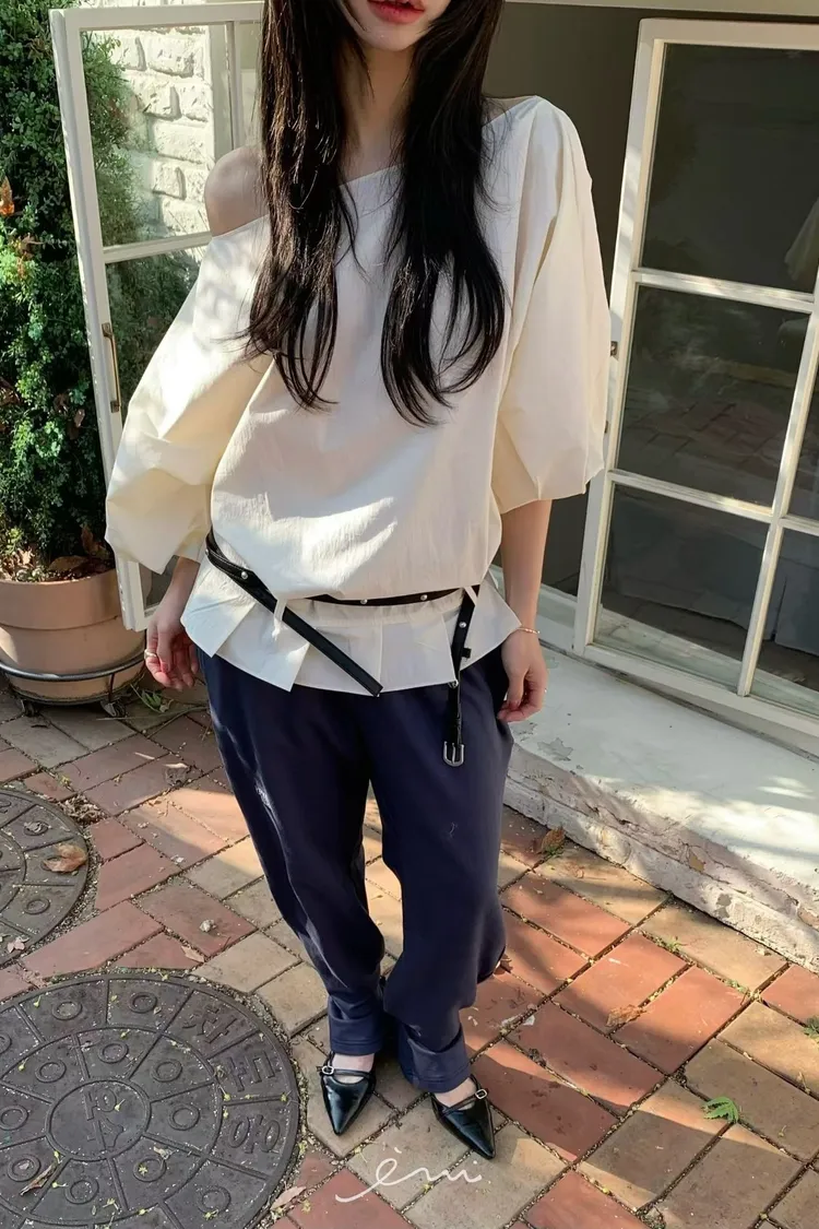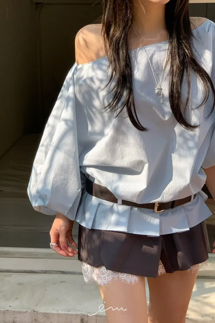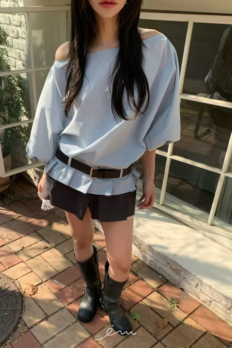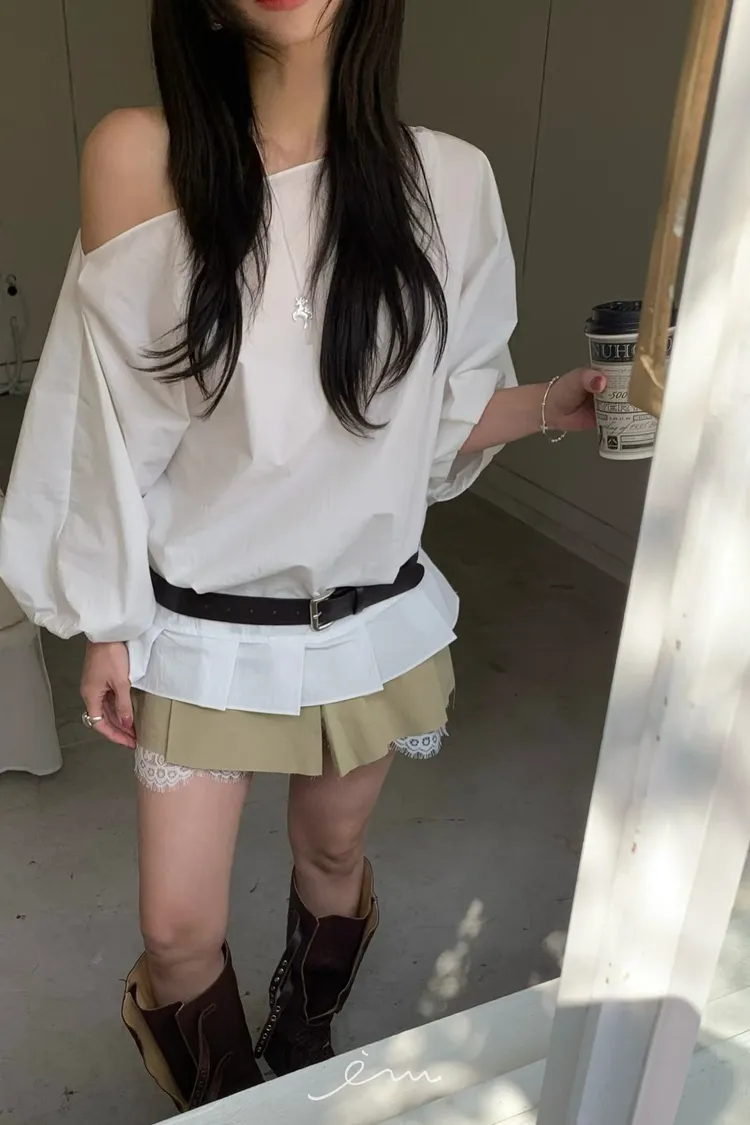 BER下擺摺腰帶環斜肩上衣