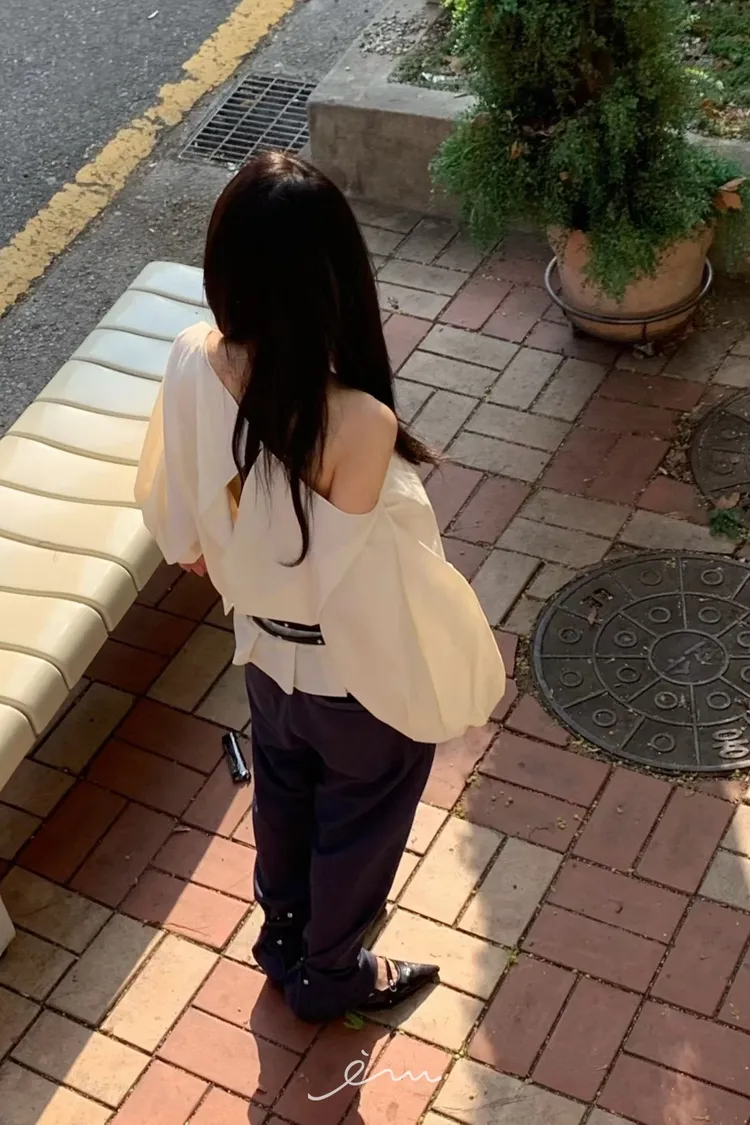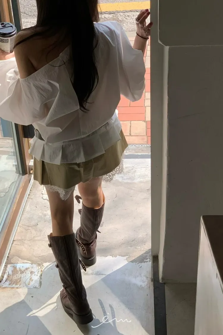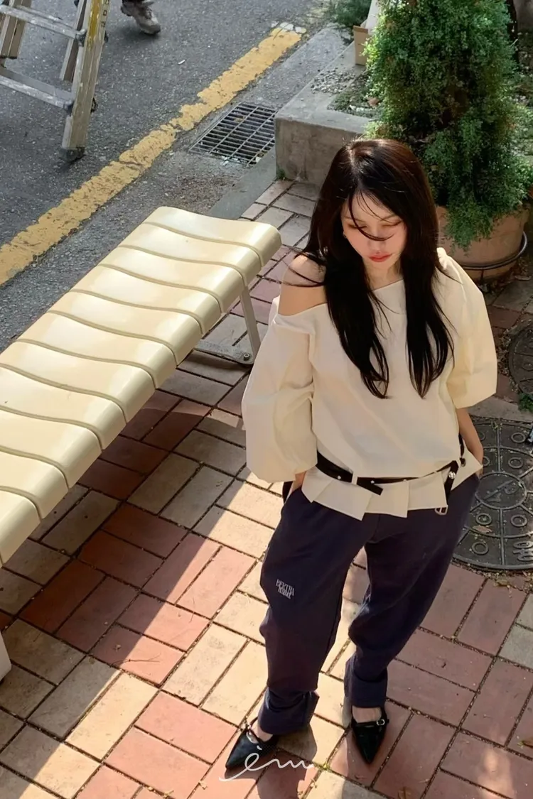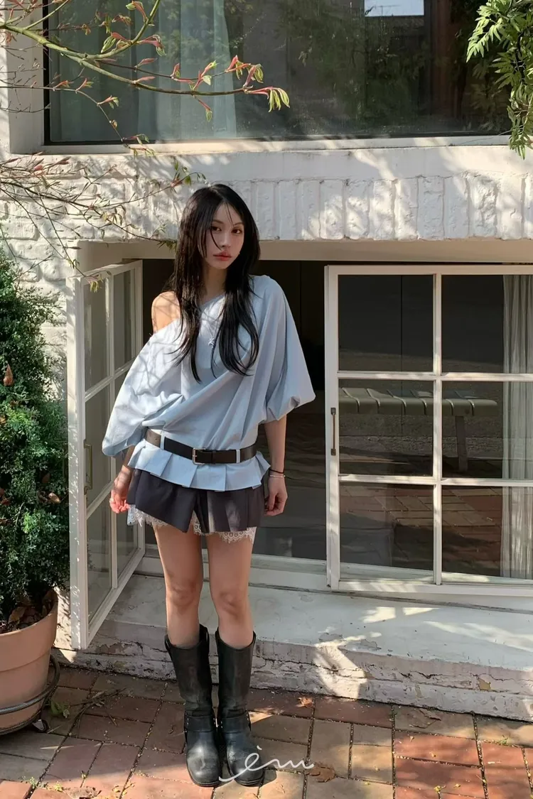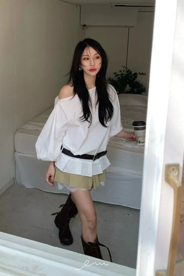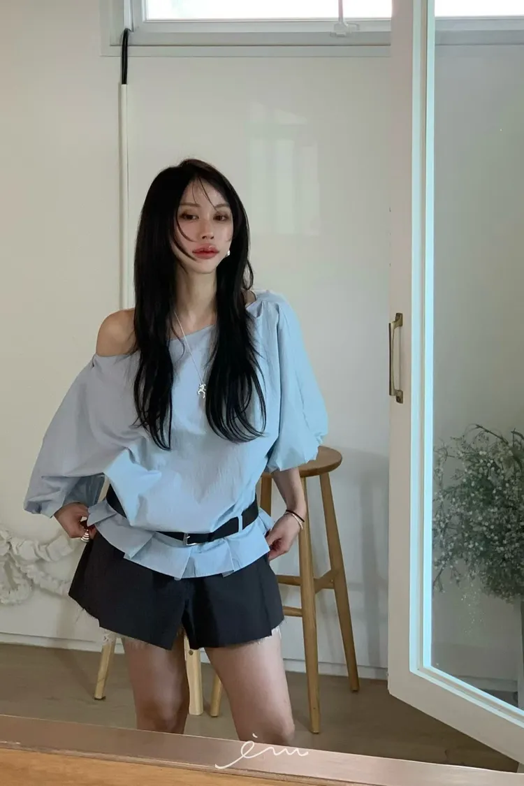 BER下擺摺腰帶環斜肩上衣