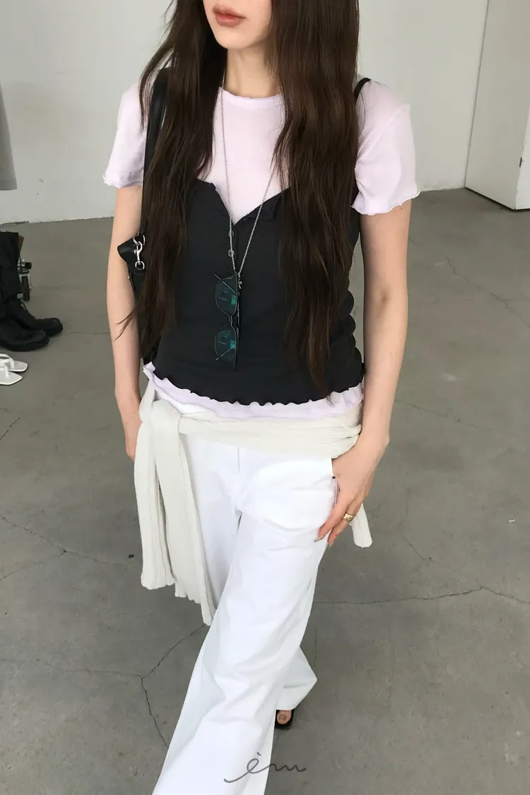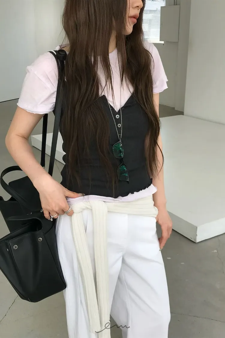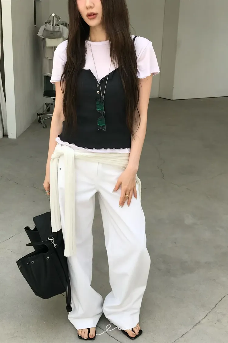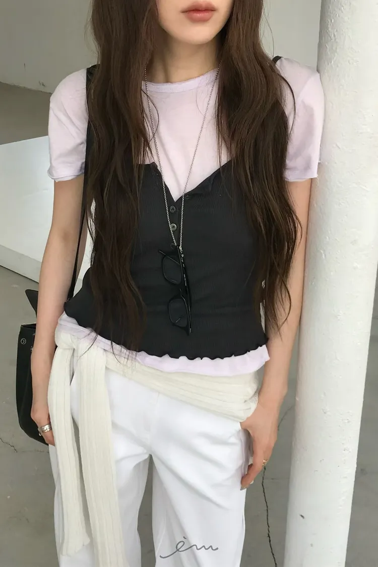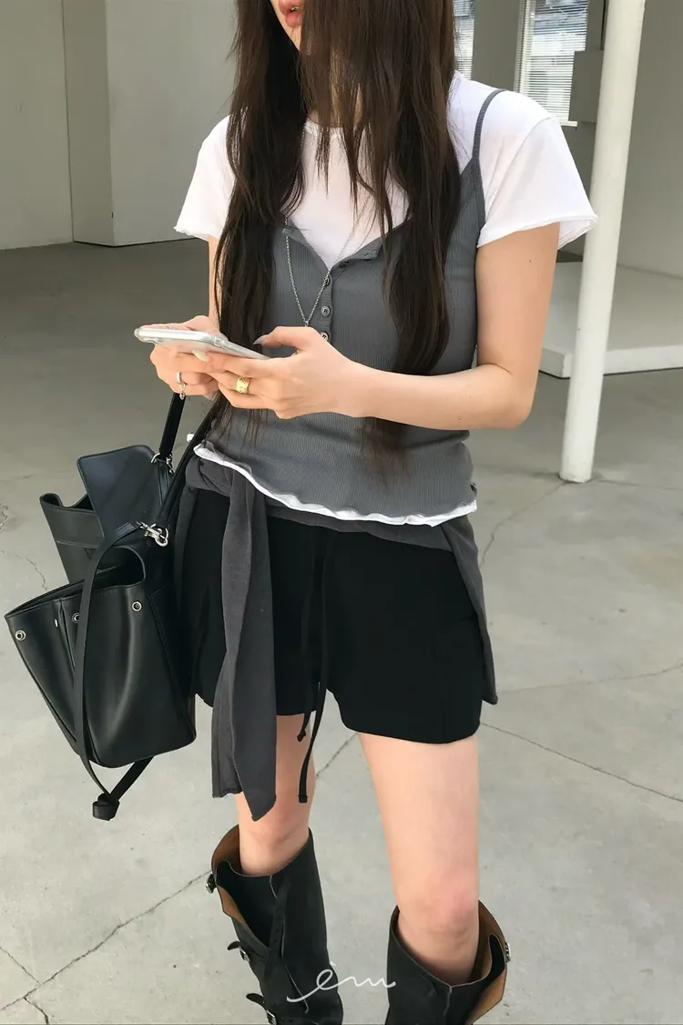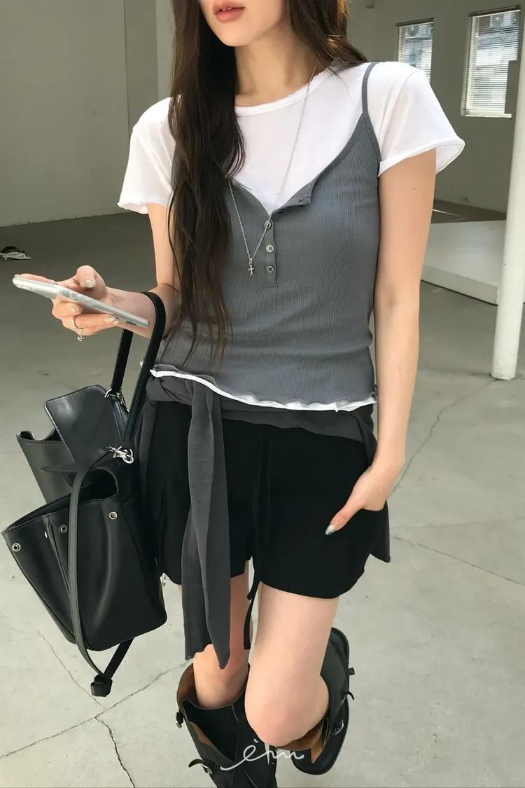 NU下捲邊鈕釦細肩背心(肉0清單)