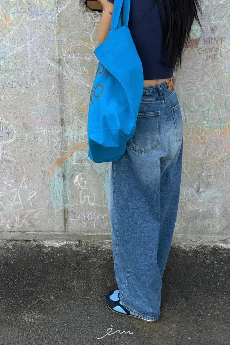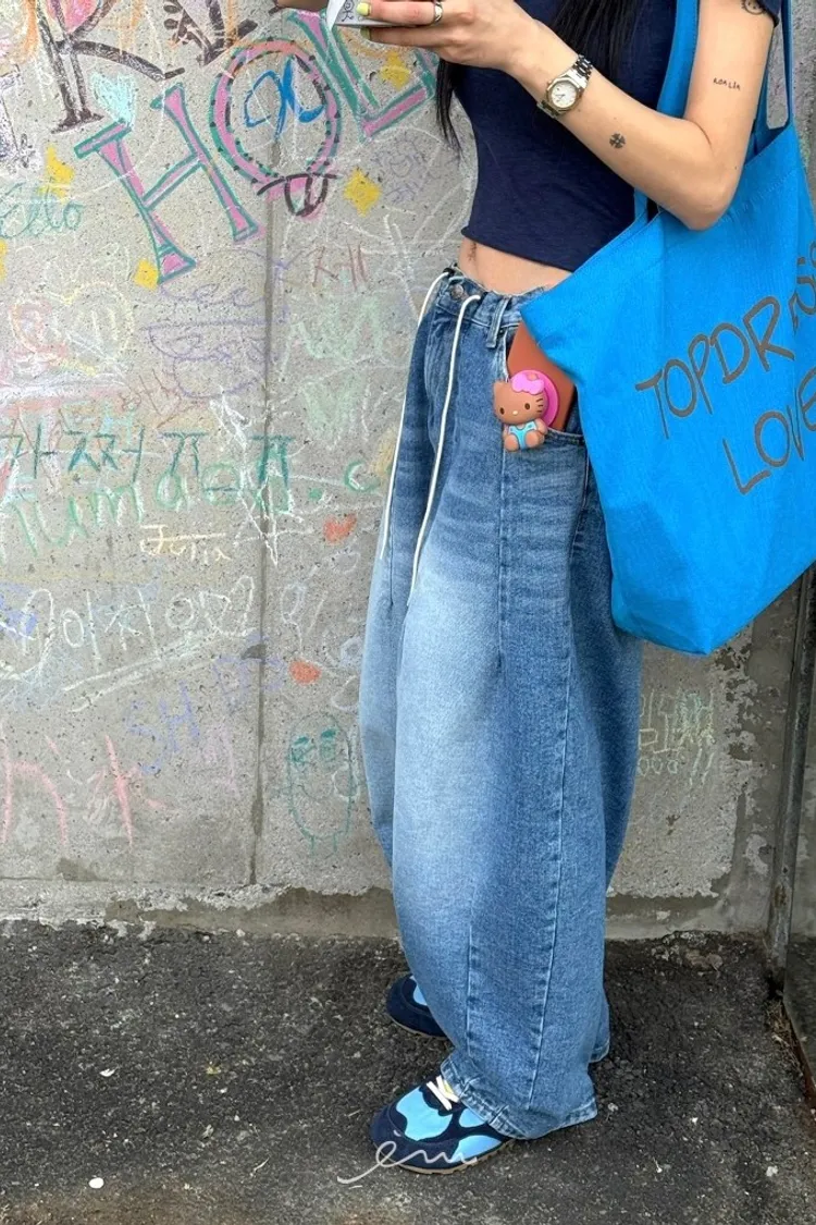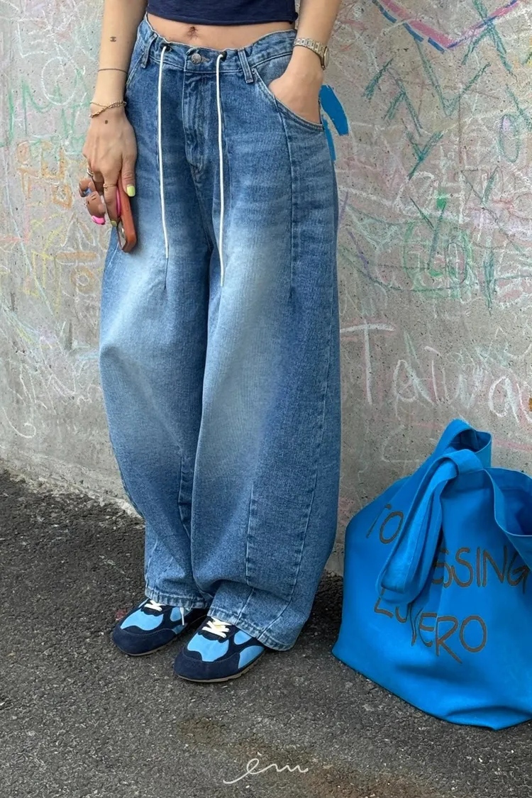 TOP上下車線抽繩牛仔褲