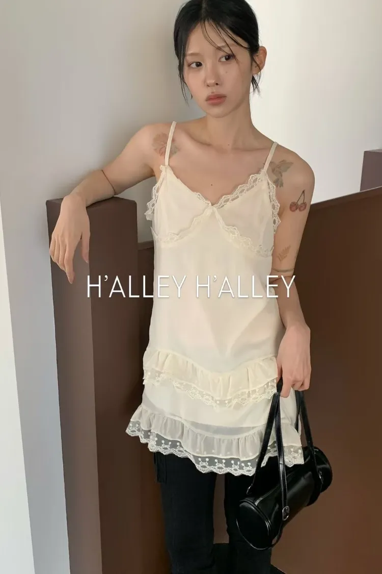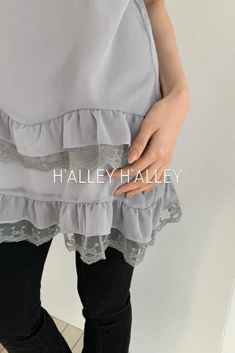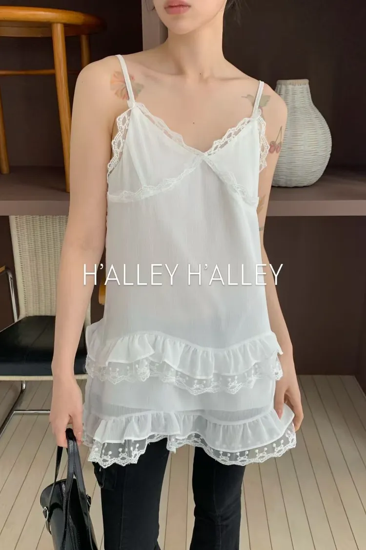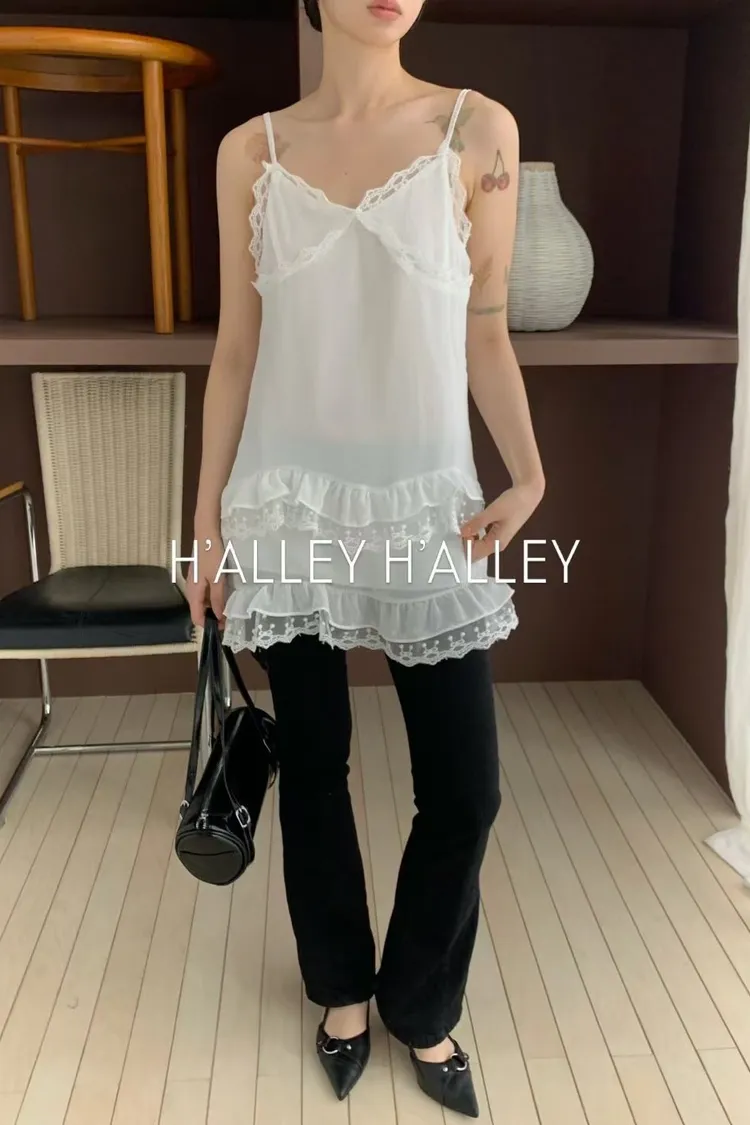 下荷葉拼蕾絲細肩背心(肉0清單)