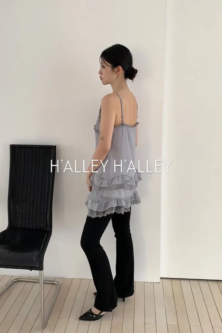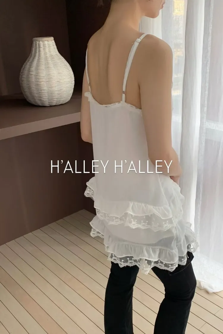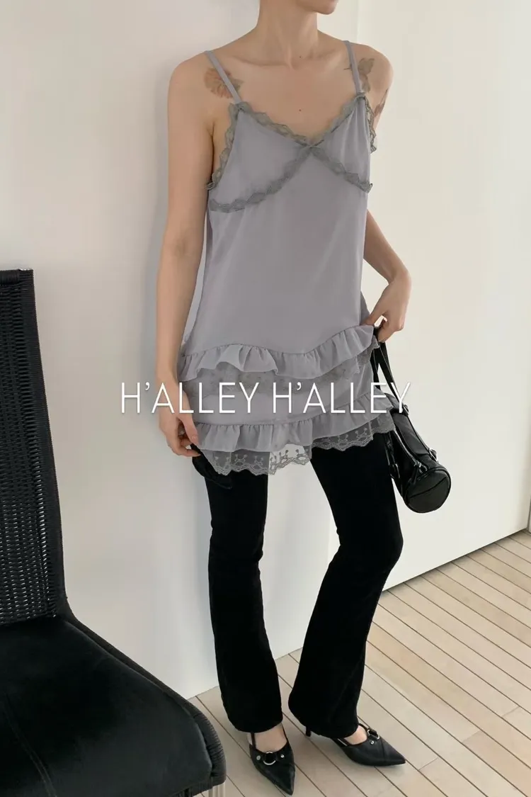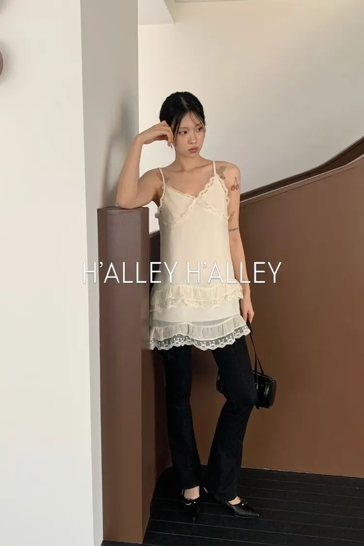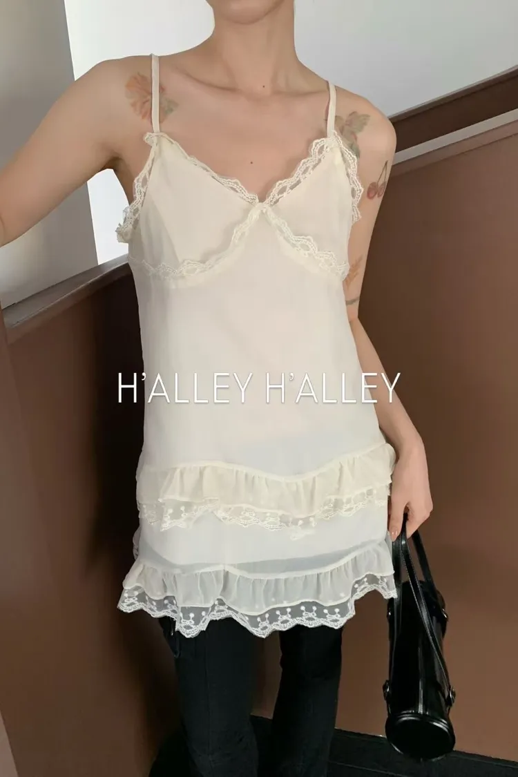 下荷葉拼蕾絲細肩背心(肉0清單)