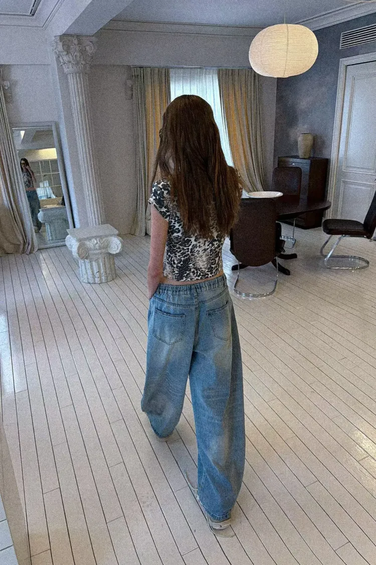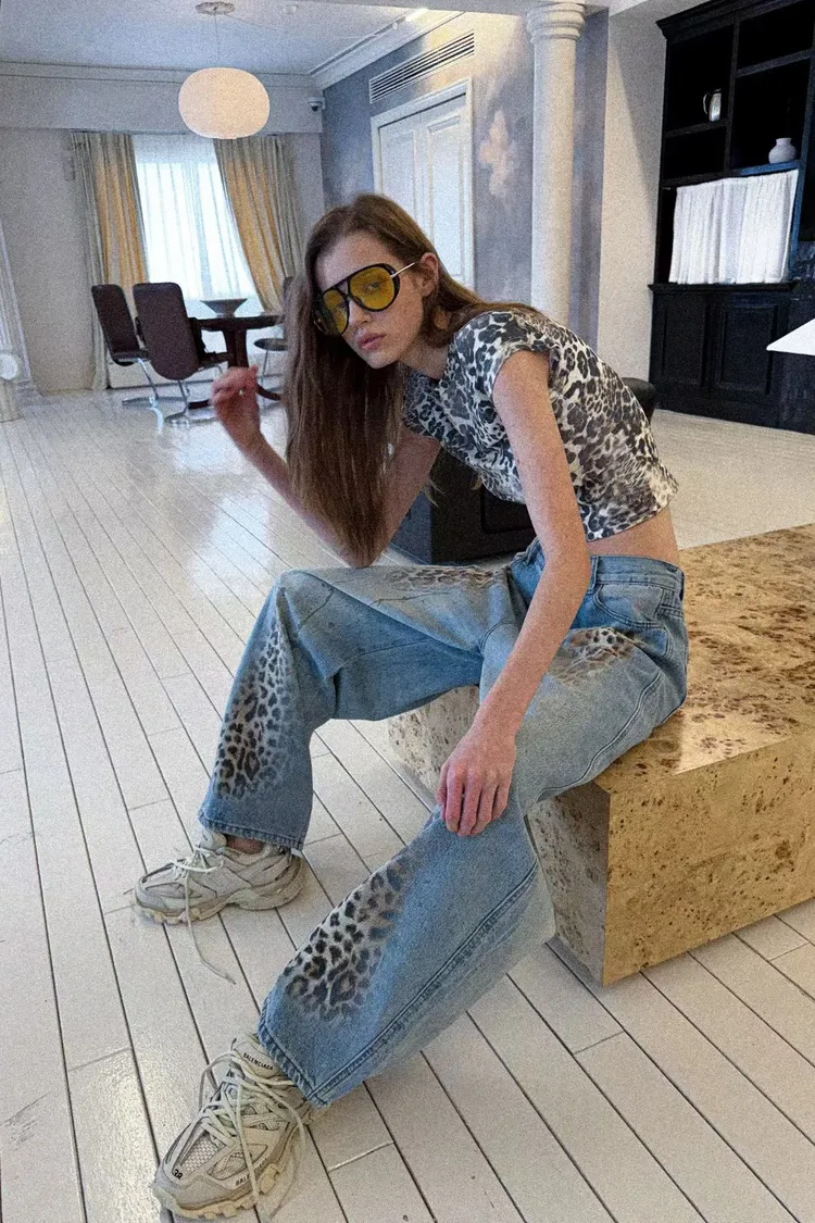 潑漆拼豹紋後鬆緊牛仔褲