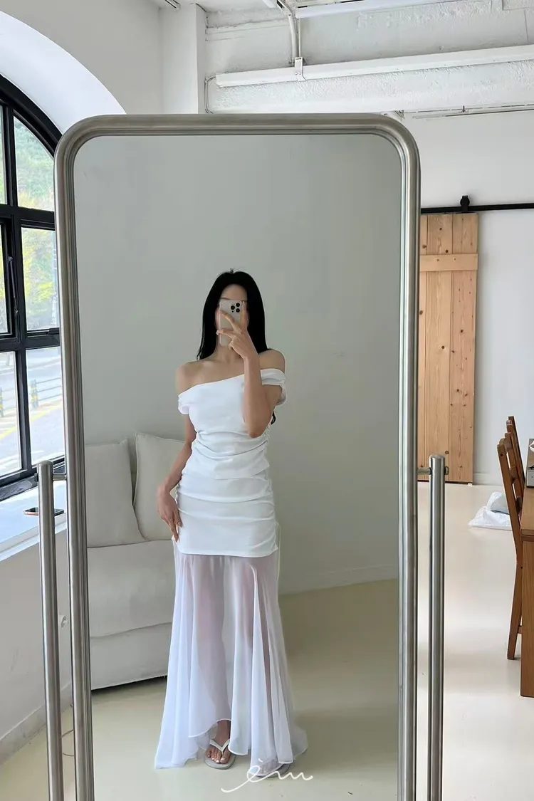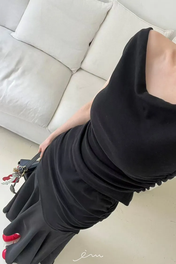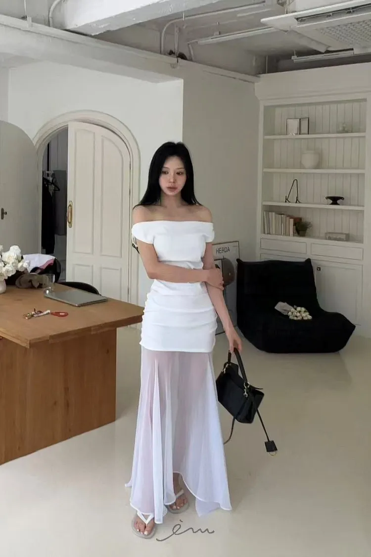 BAI可拉一字領側抓皺素衣