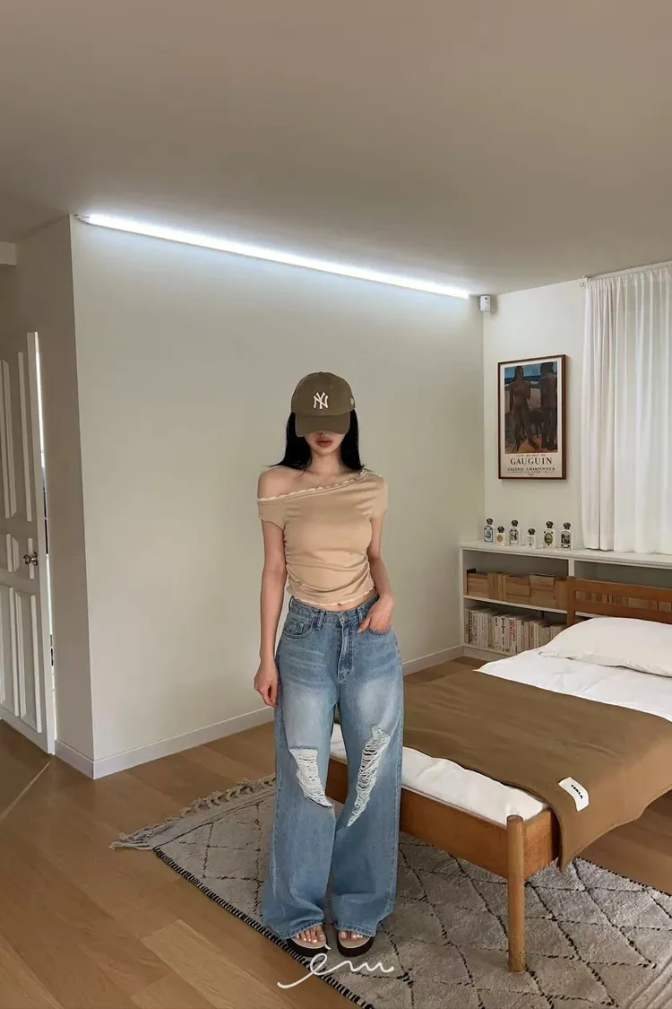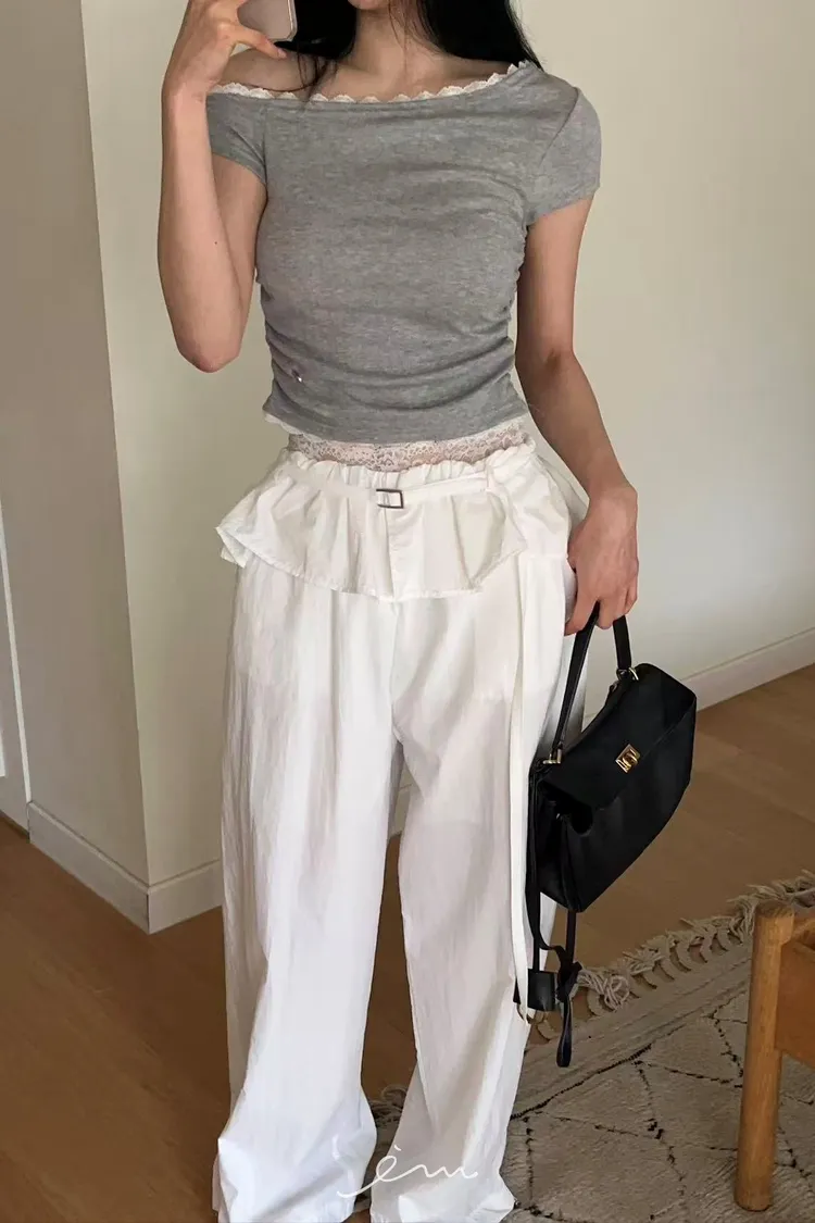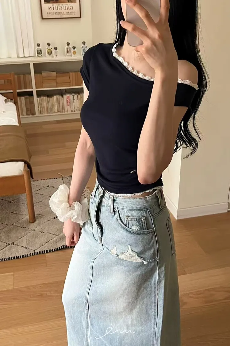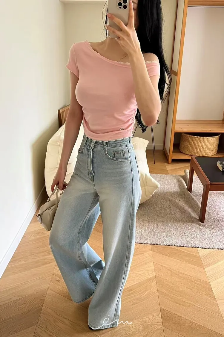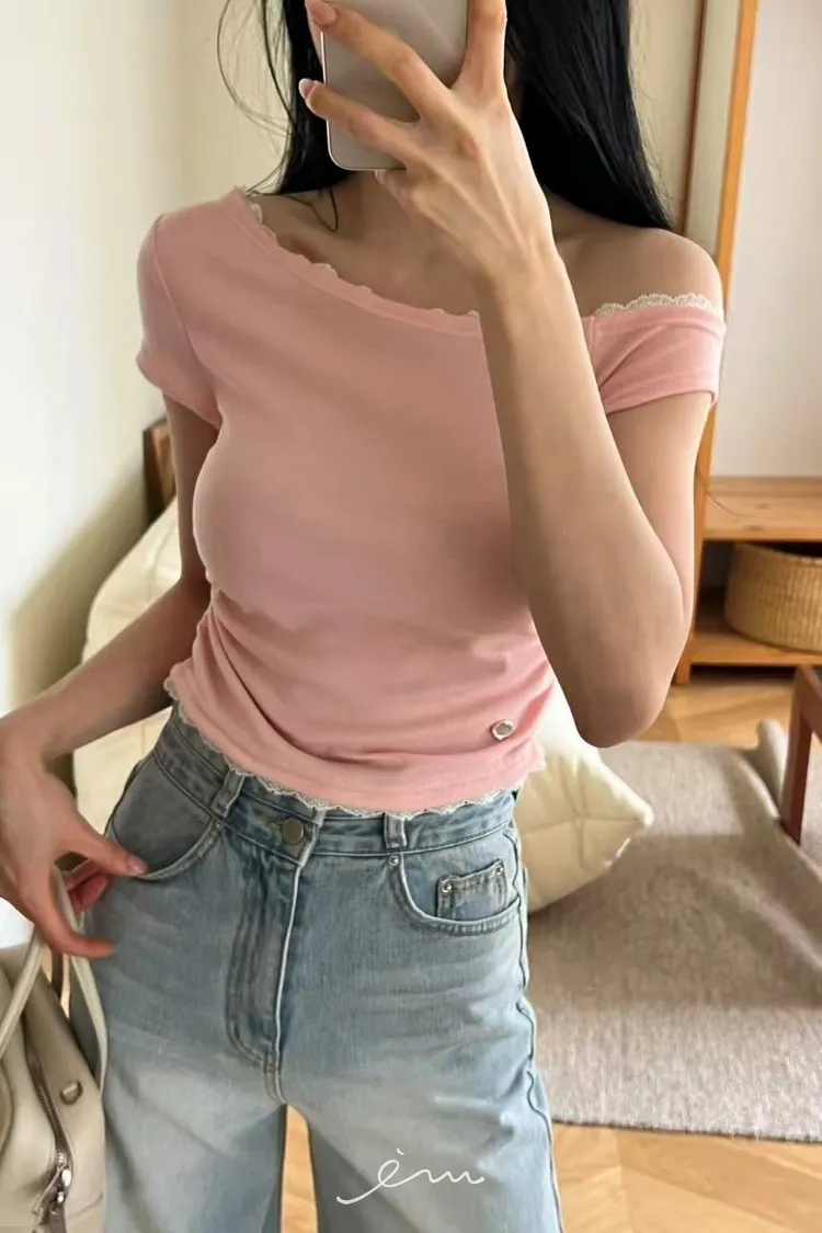 BAI拼蕾絲斜肩側抓皺鐵標衣(前50名優惠價)