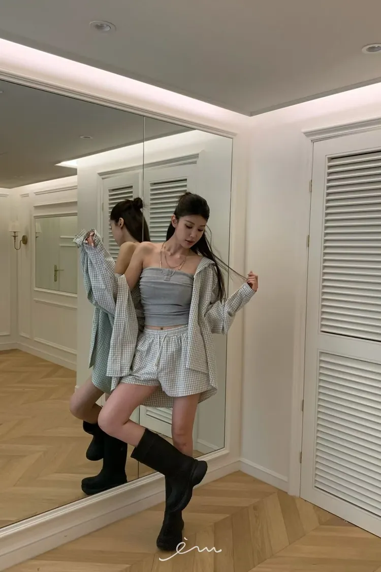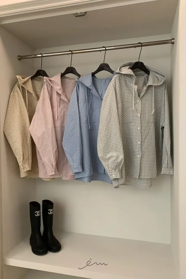 VK雙口袋方格連帽襯衫