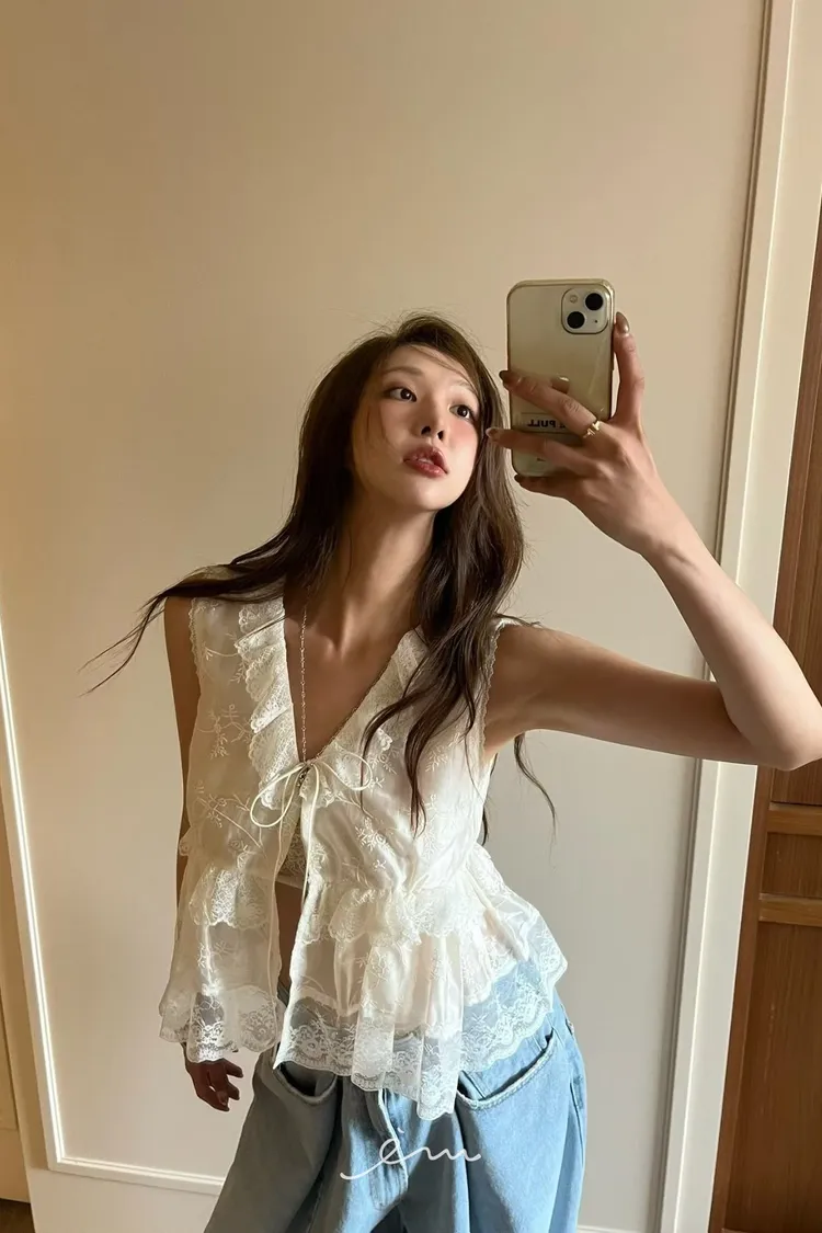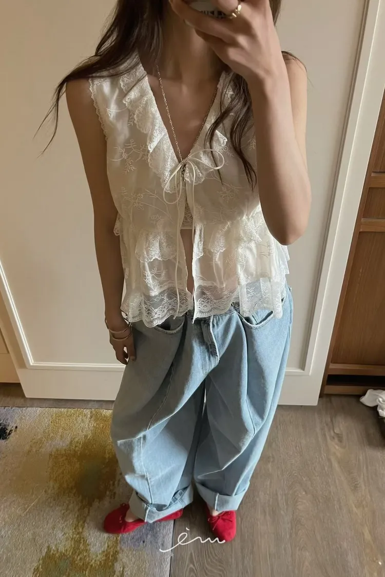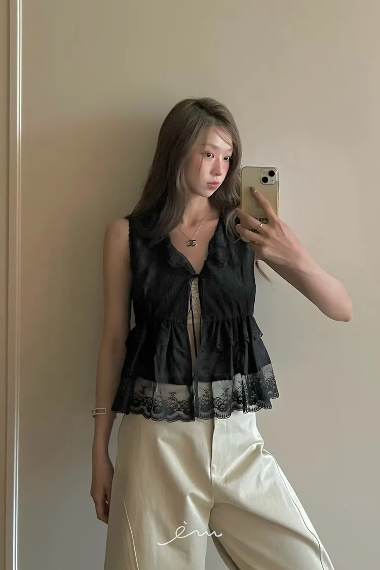PU荷葉綁帶雕花蕾絲無袖外罩