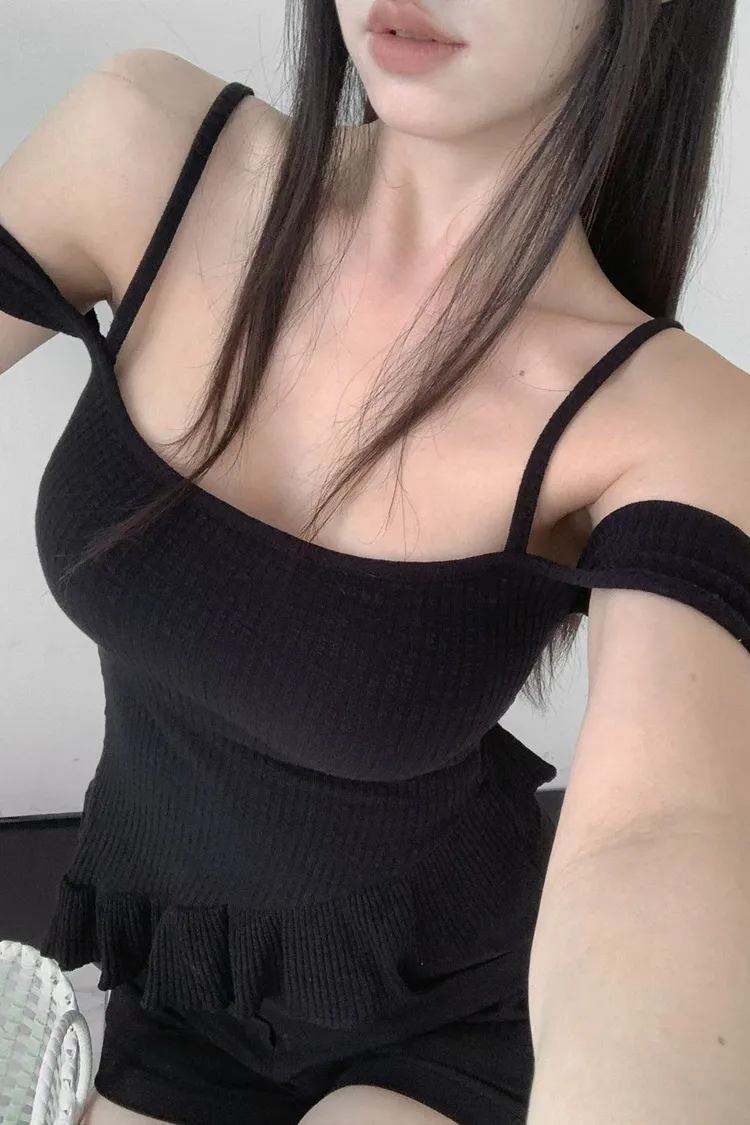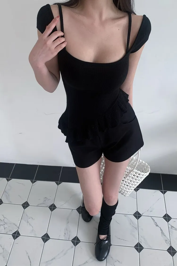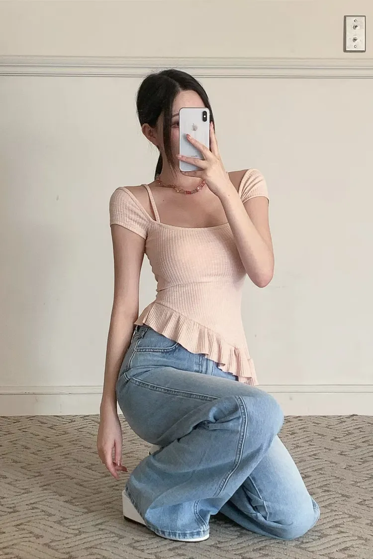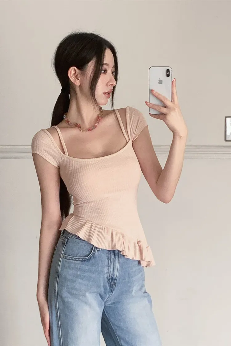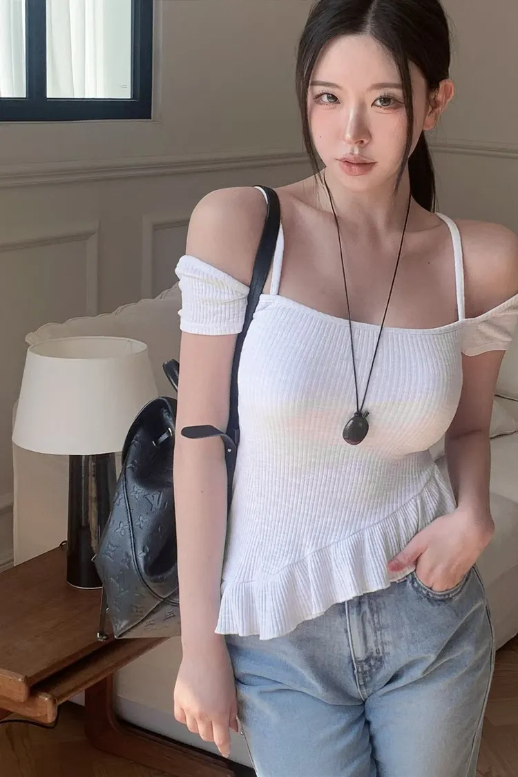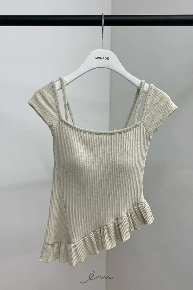 MON下荷葉肩帶短袖有BRA上衣(胸墊可拆)