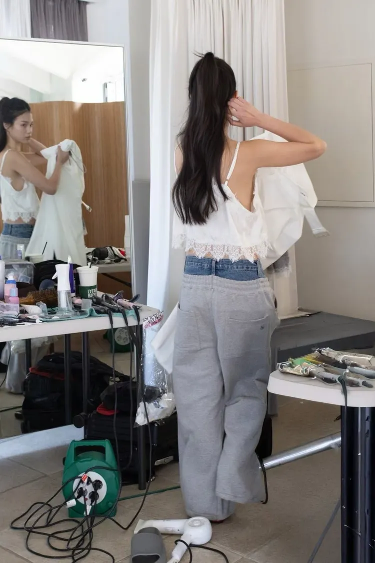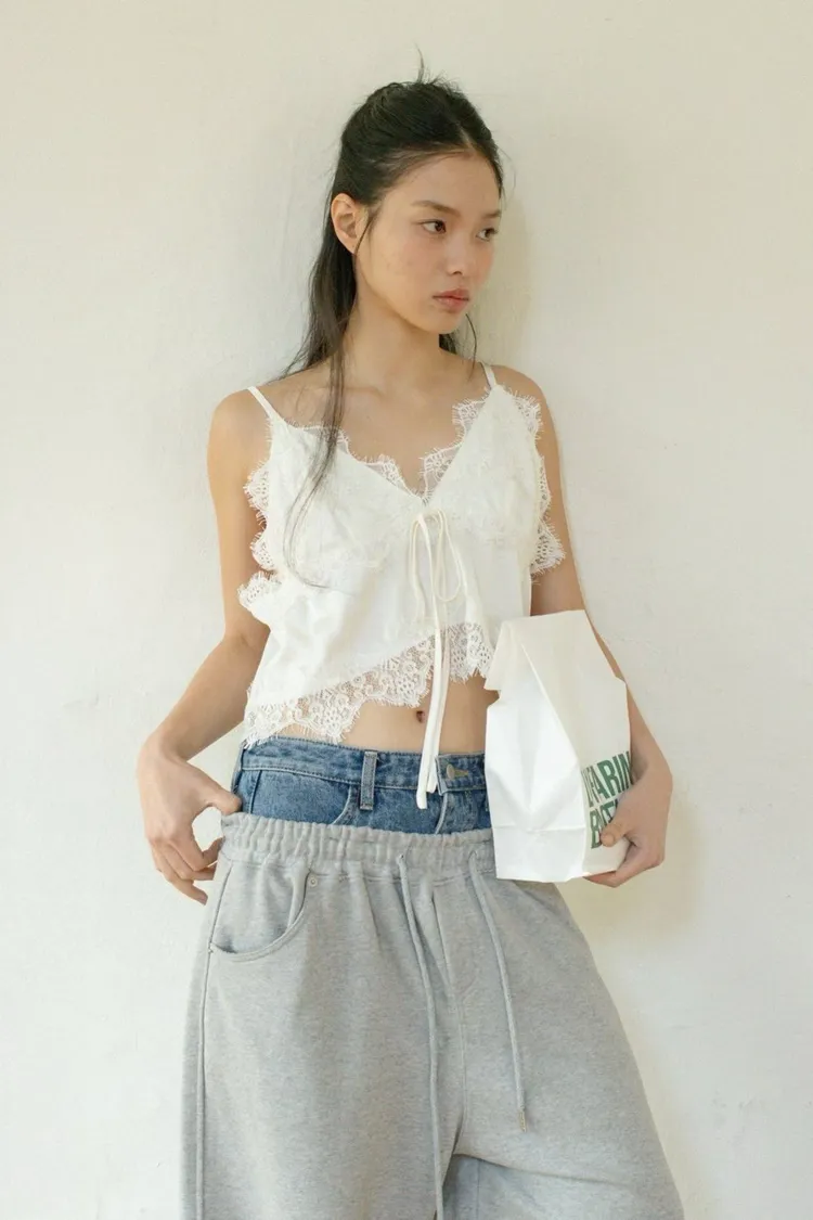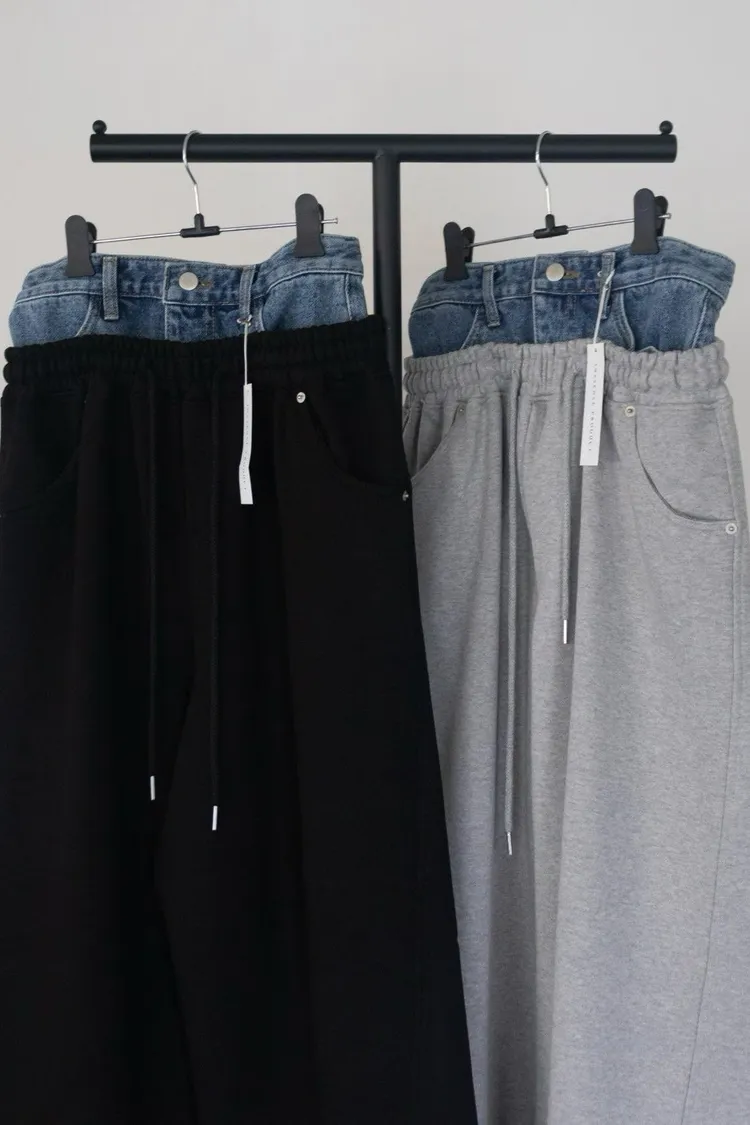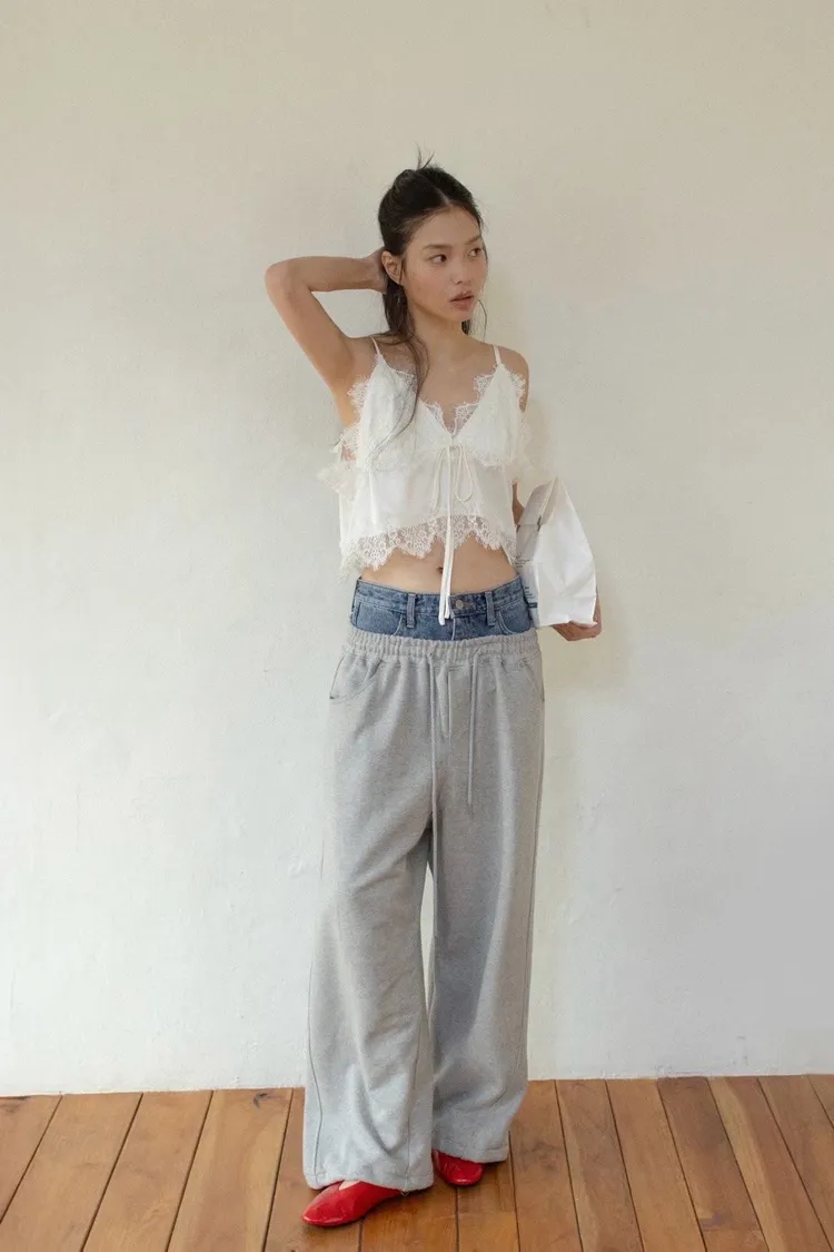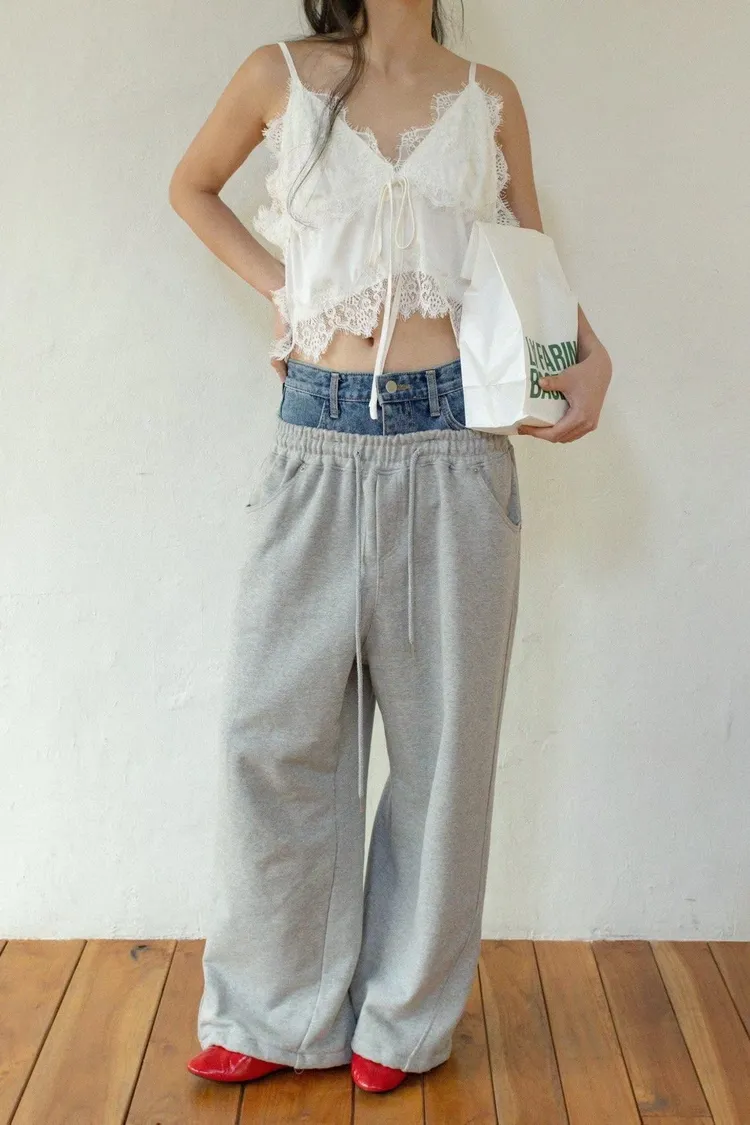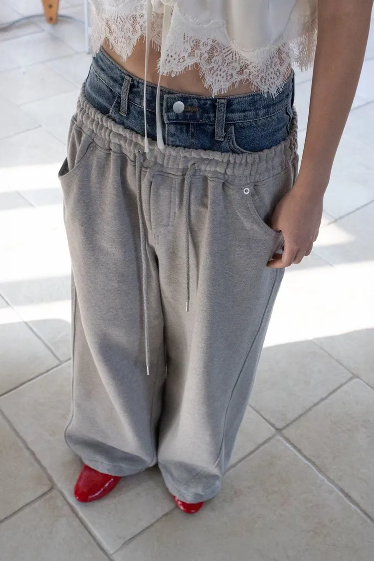 上拼牛仔抽繩長褲