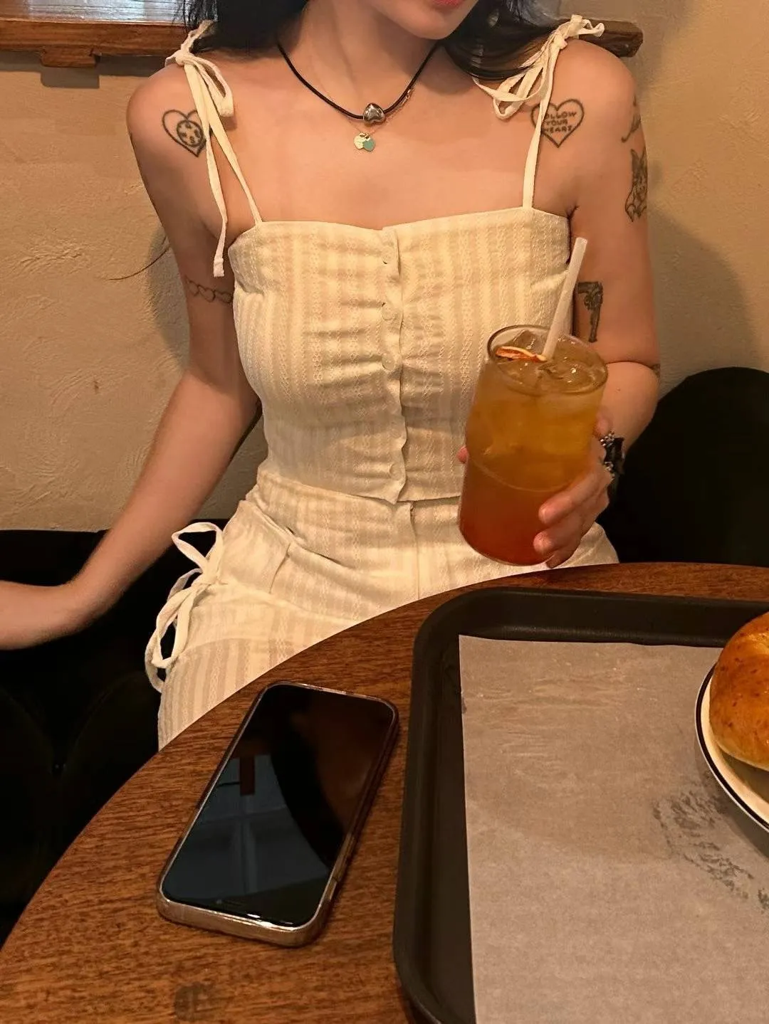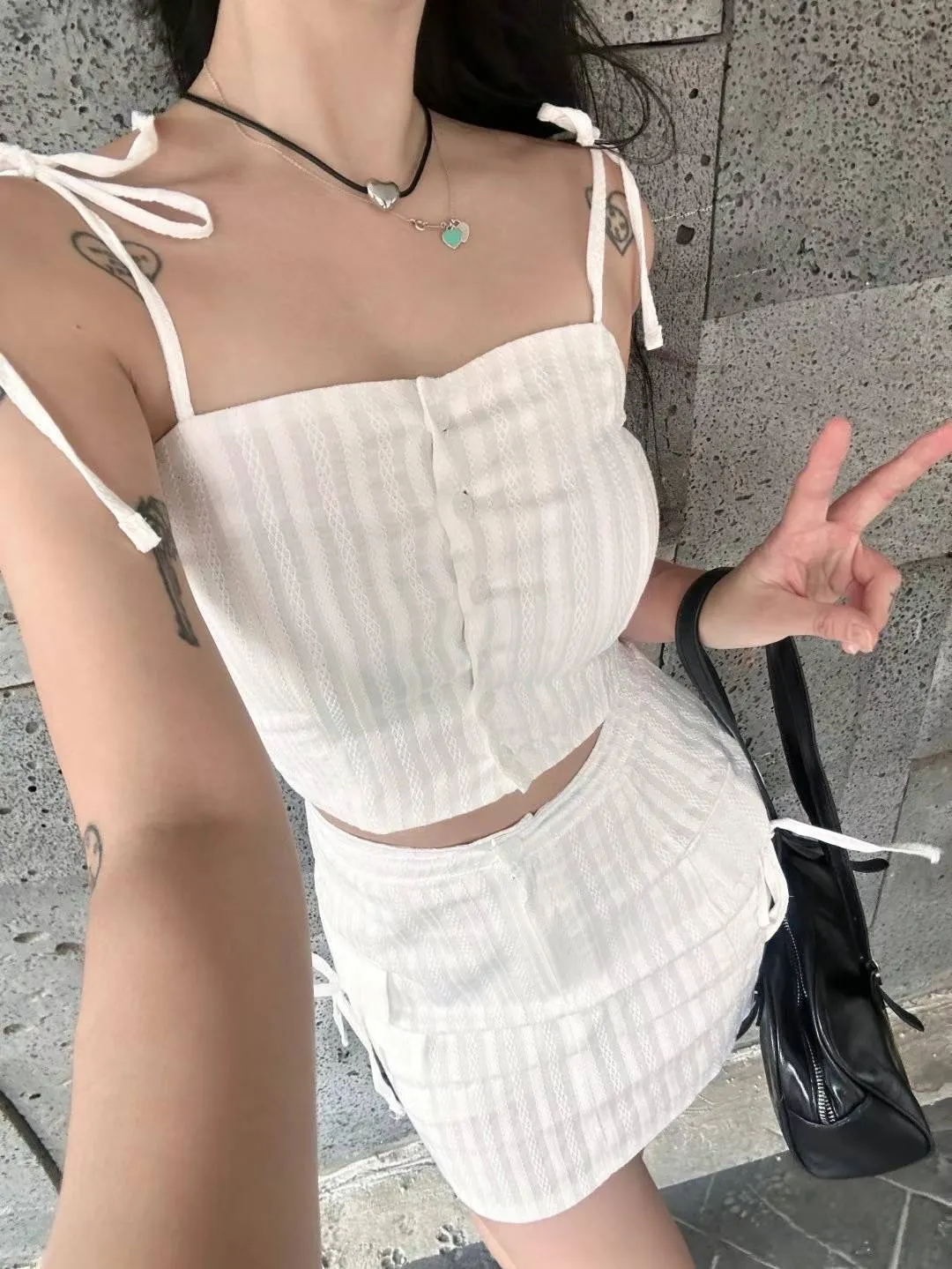 肩綁帶排扣壓紋背心