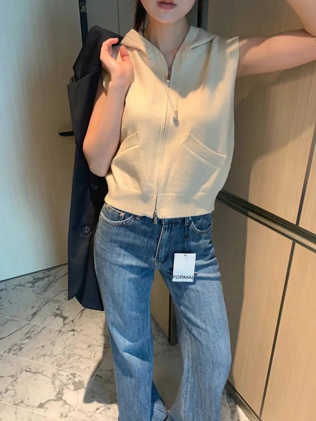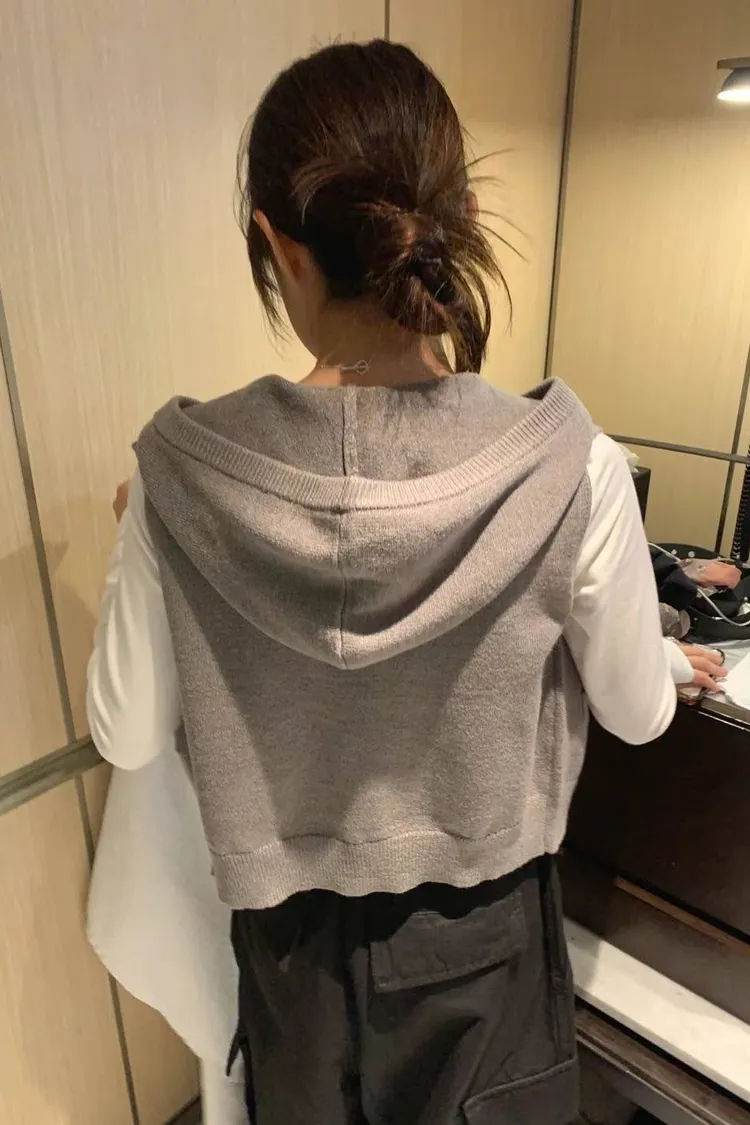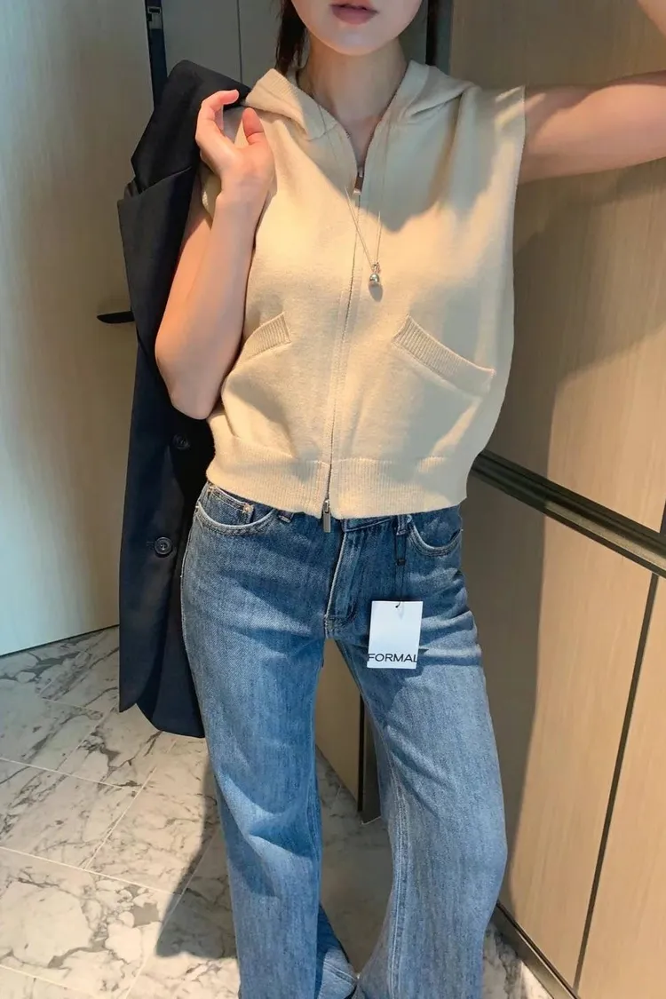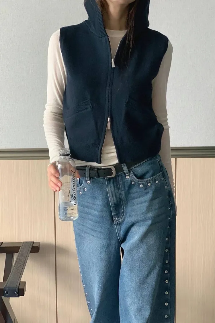 斜口袋連帽拉鍊背心