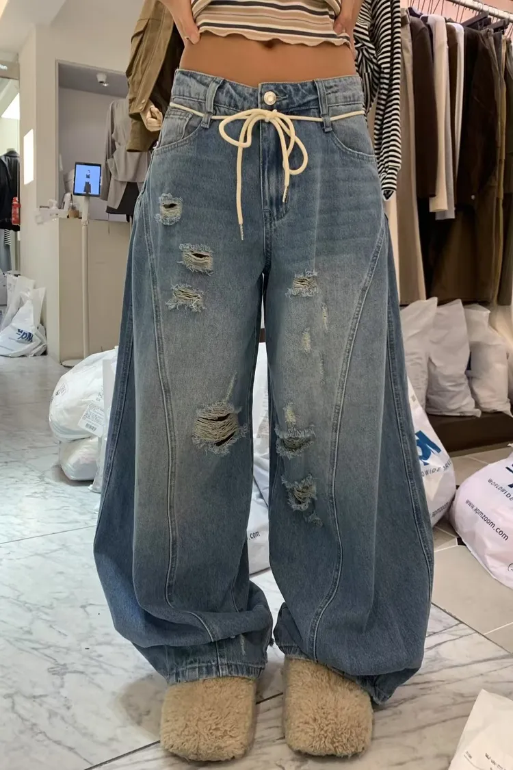 VK弧形車線刷破牛仔褲+繩子