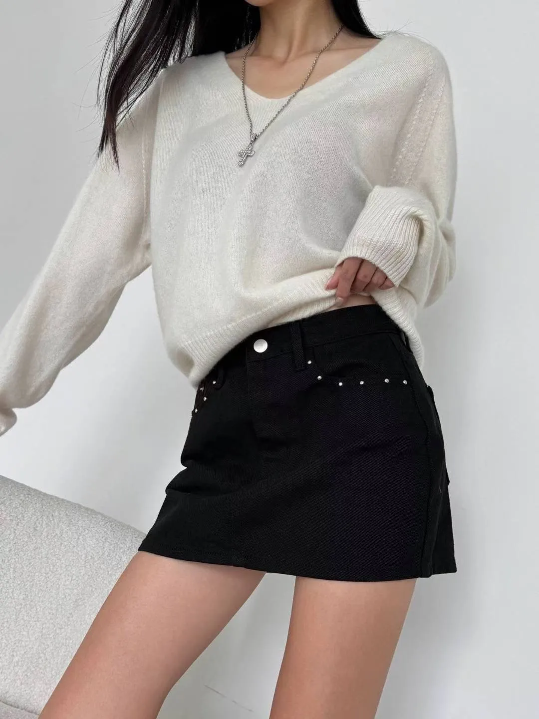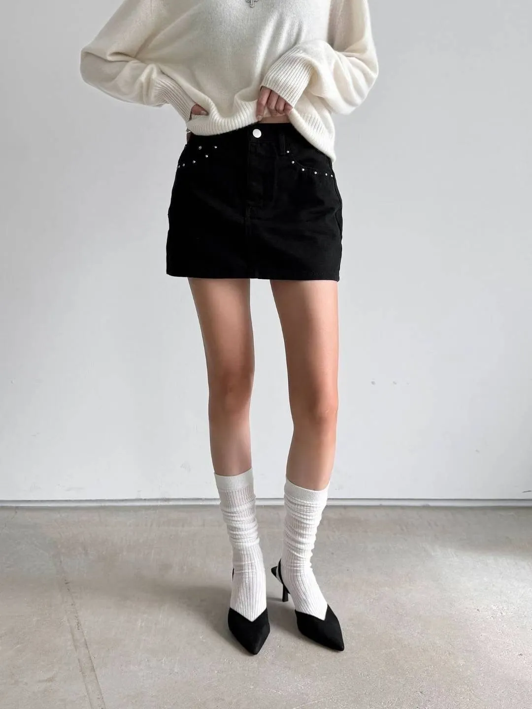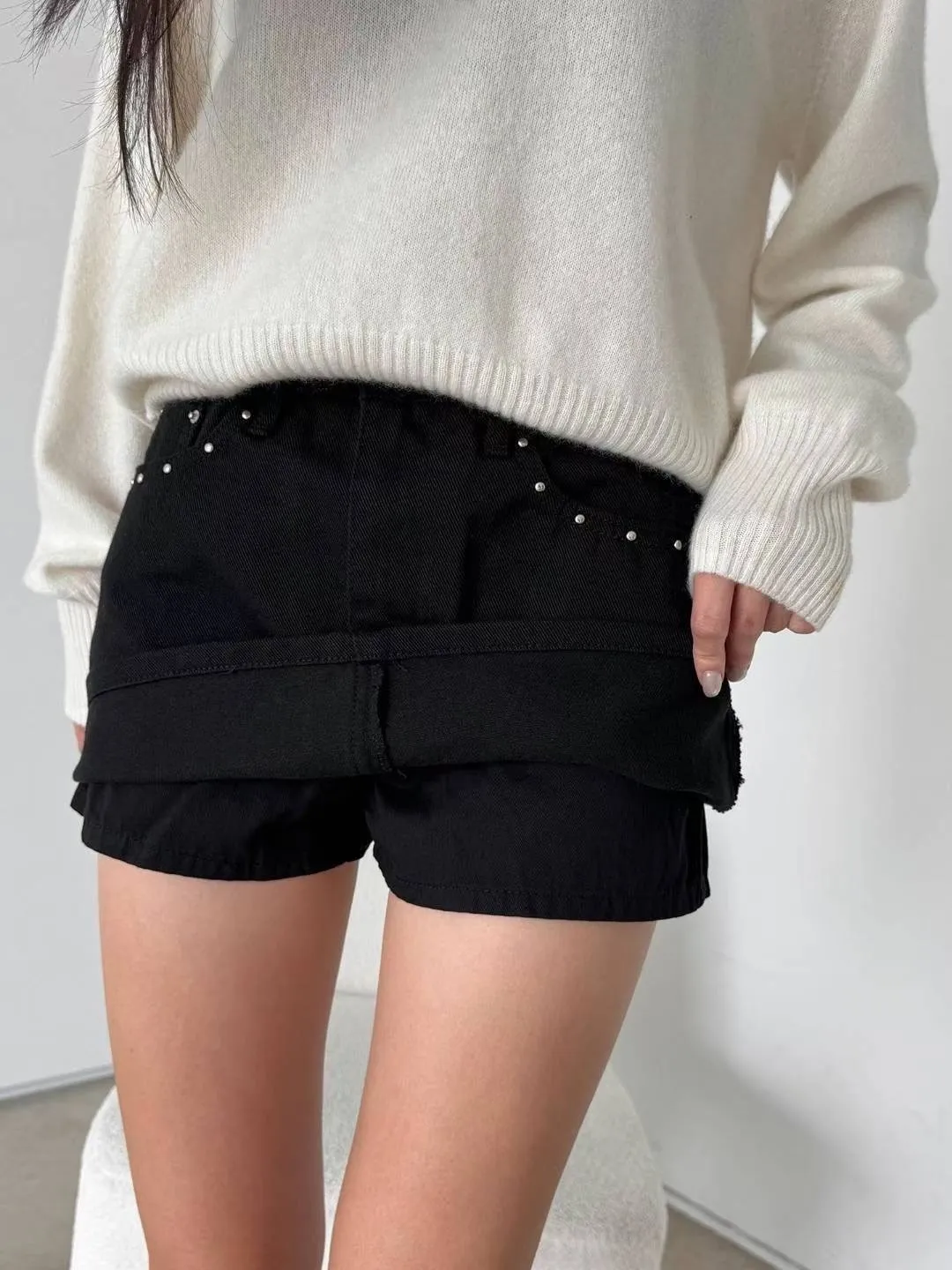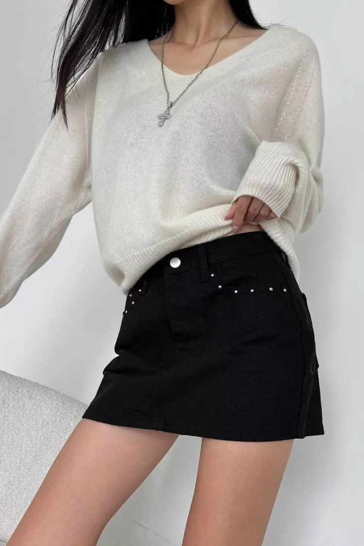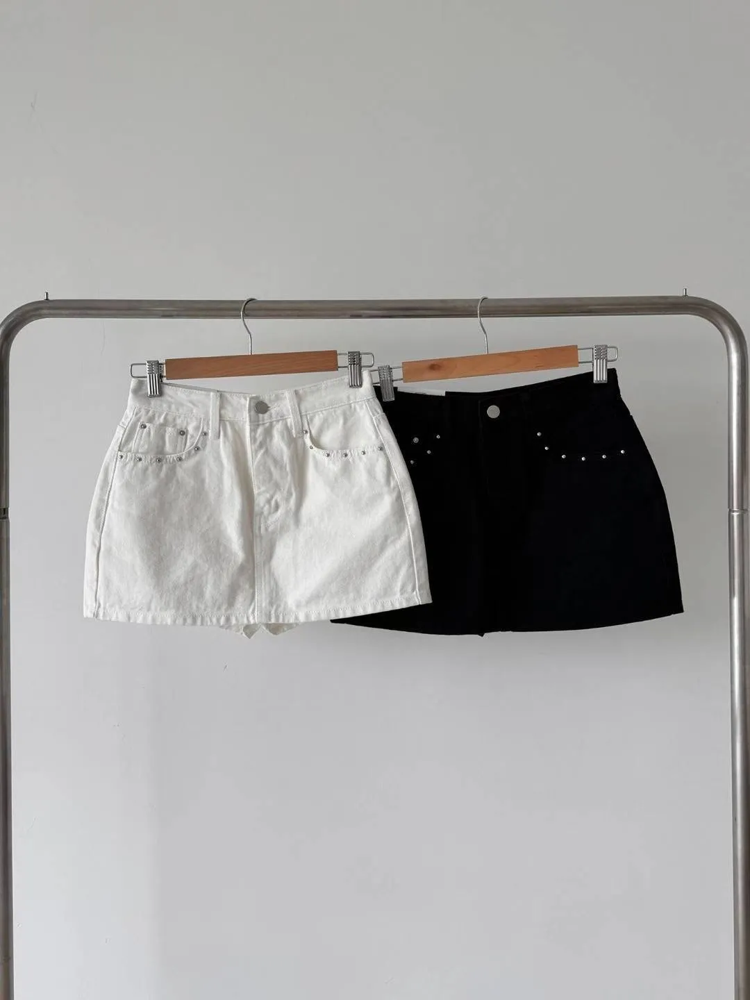 釘珠口袋牛仔褲裙