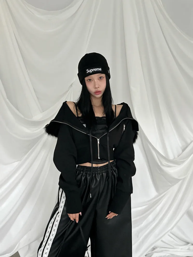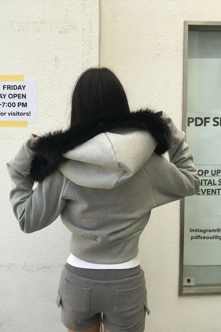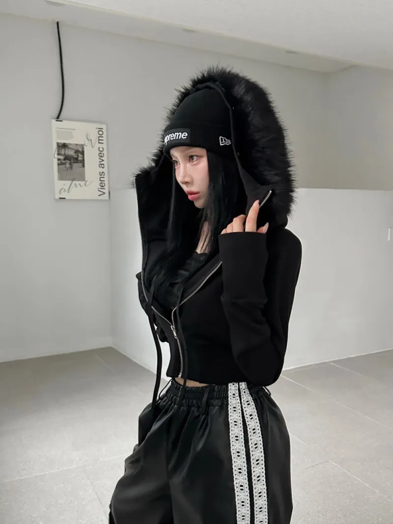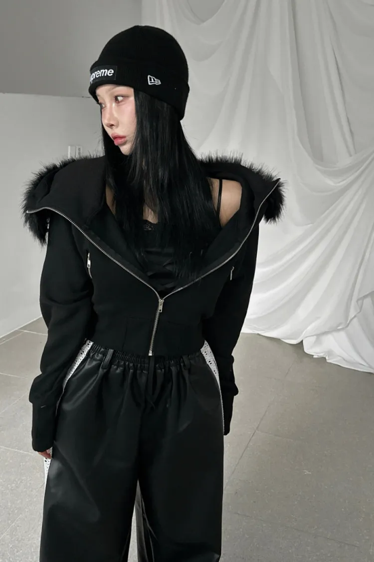 縮腰感連帽絨毛拉鍊外套