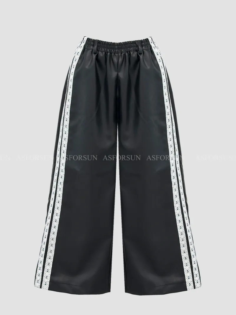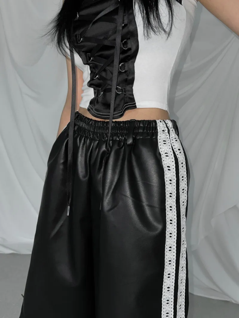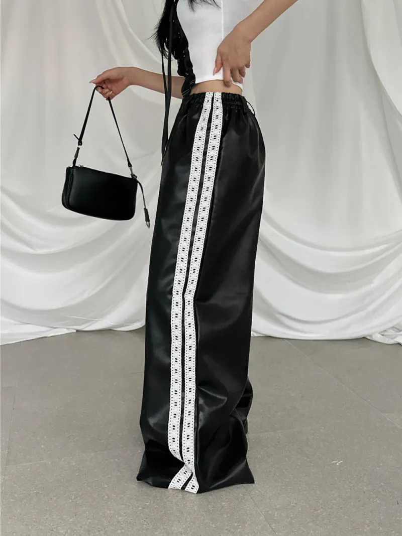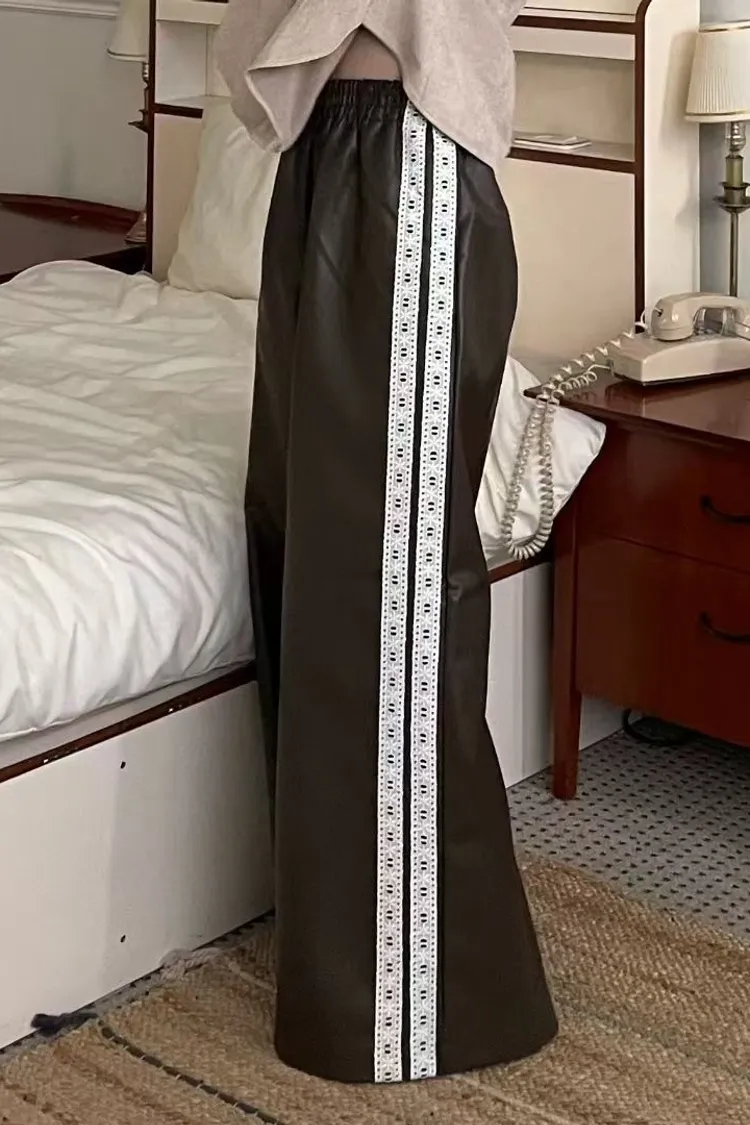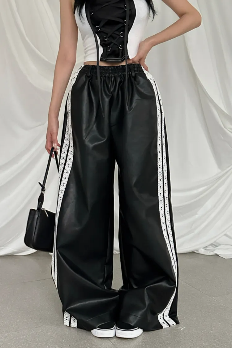 雙線蕾絲皮革寬褲