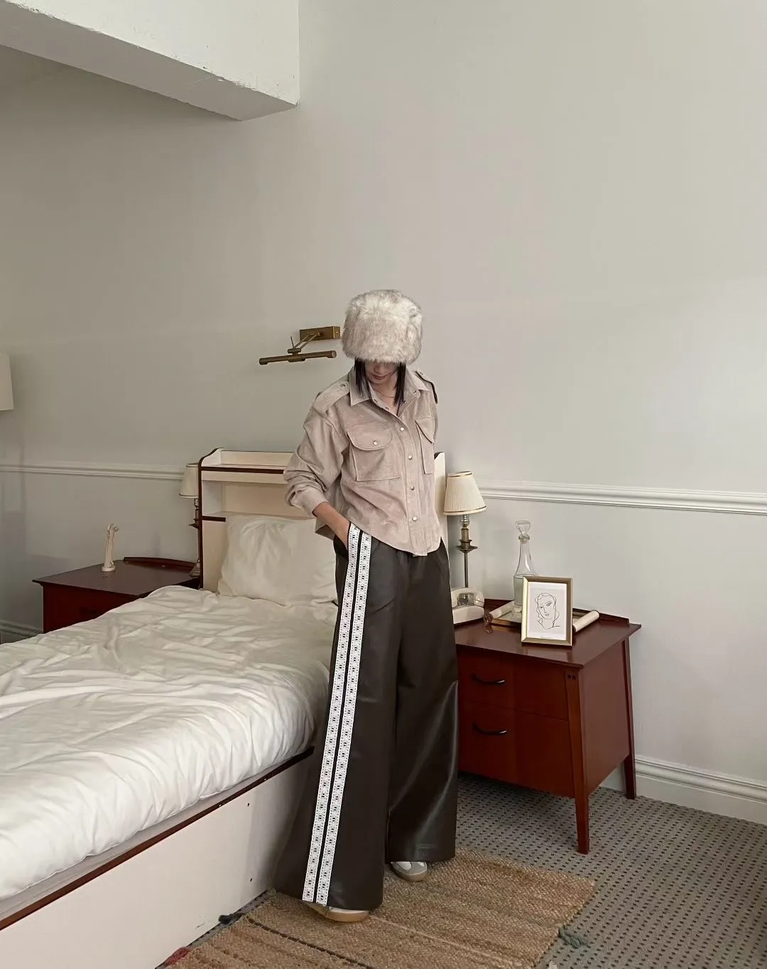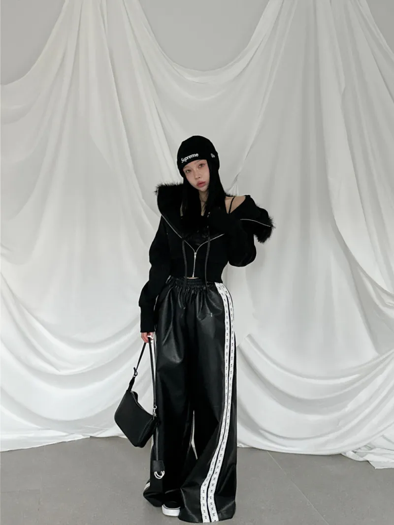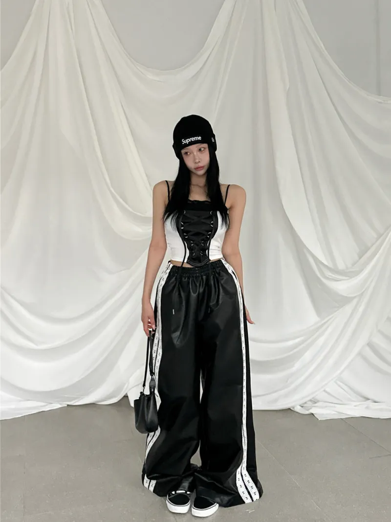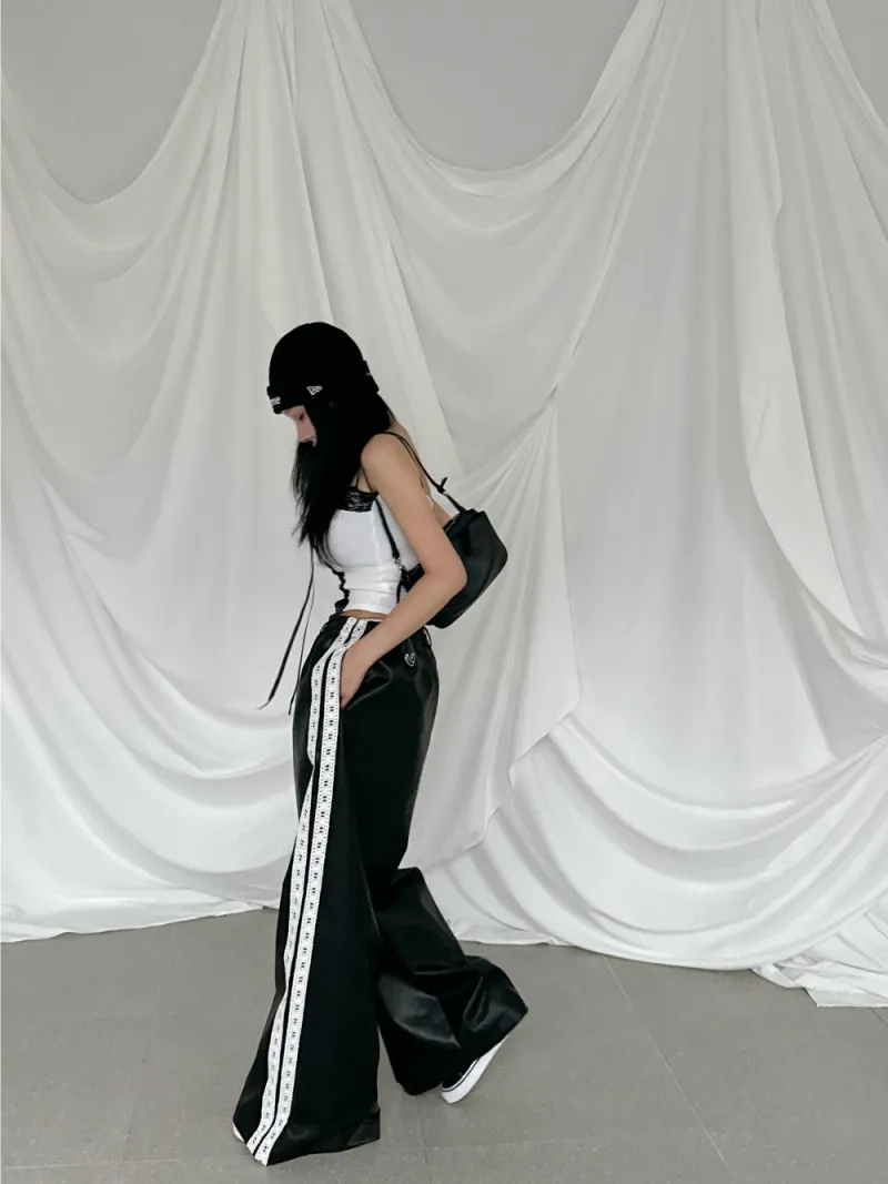 雙線蕾絲皮革寬褲