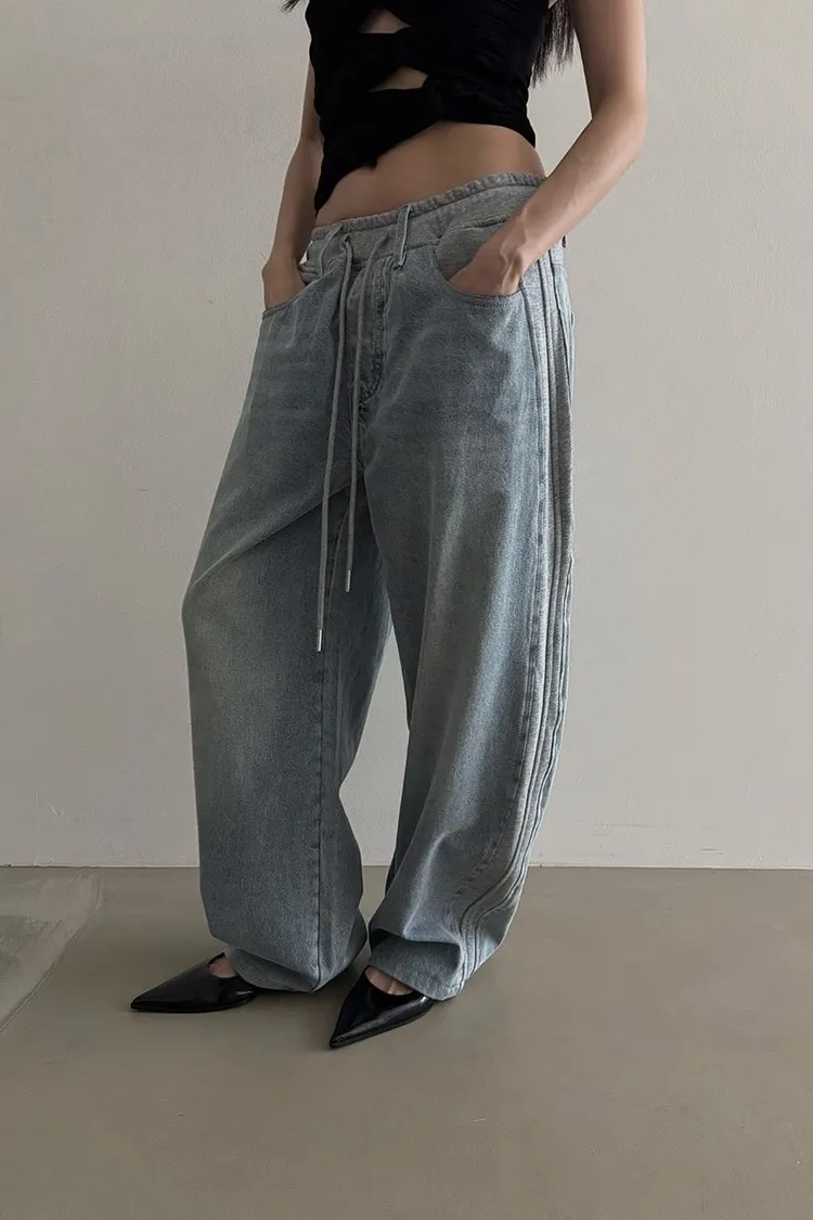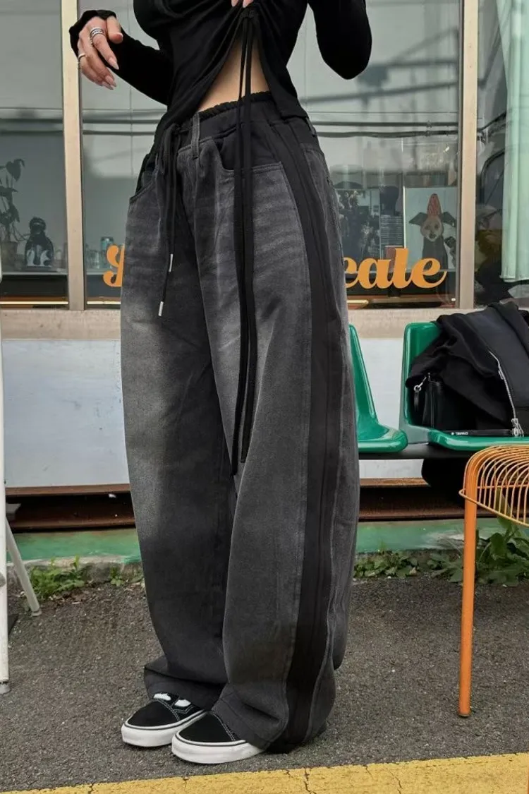 棉褲拼接牛仔寬褲