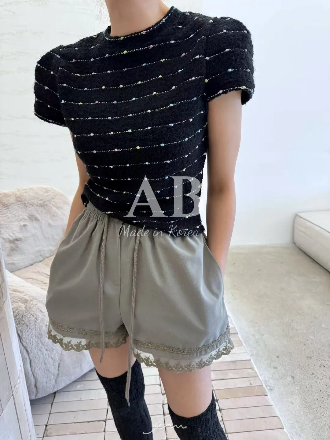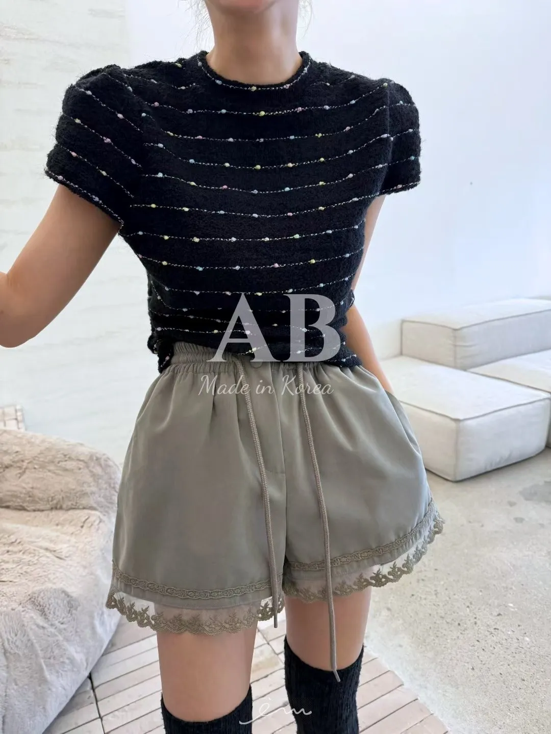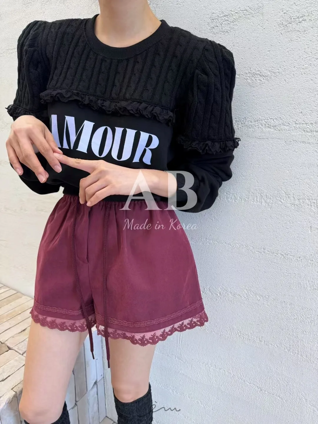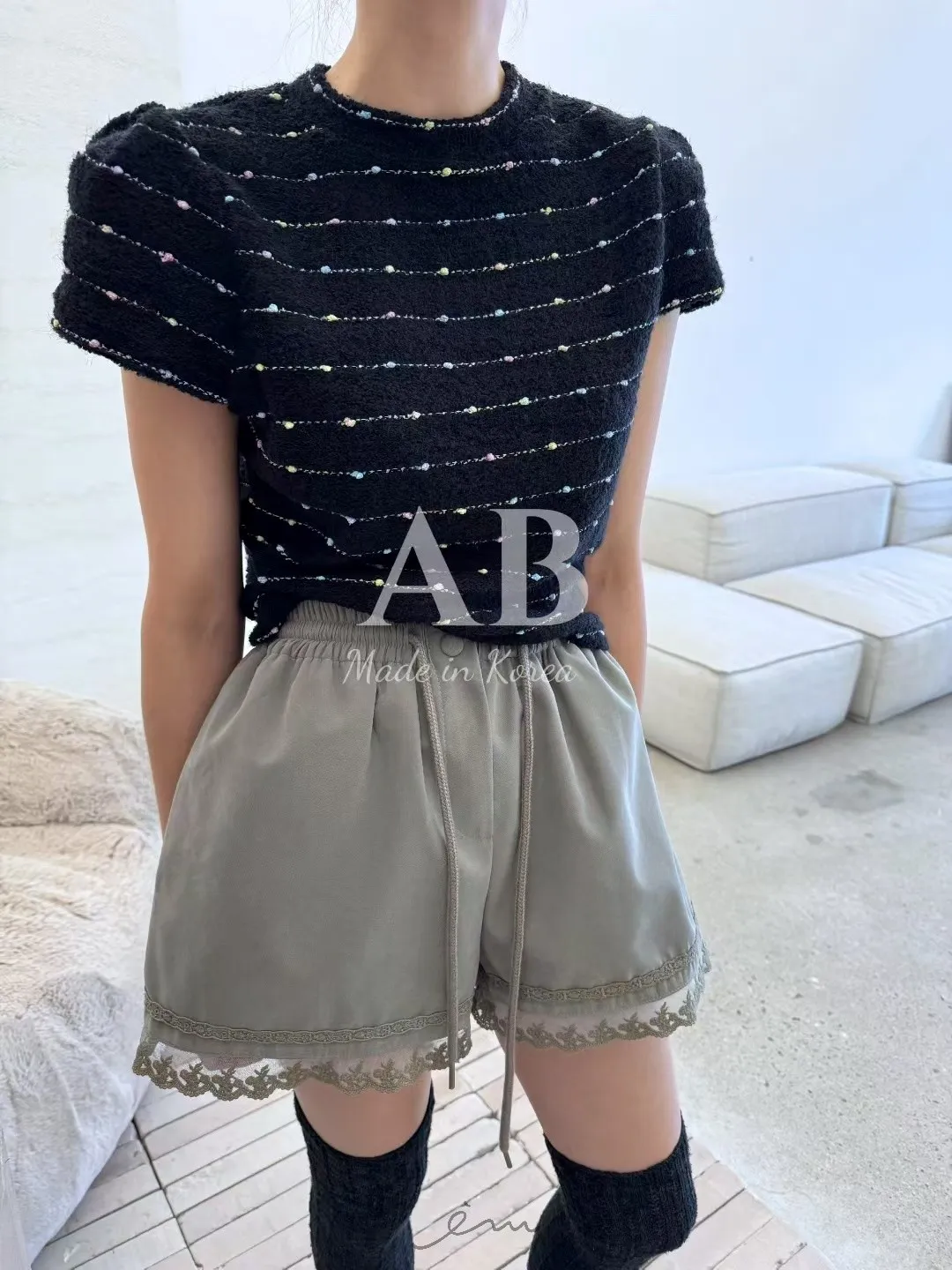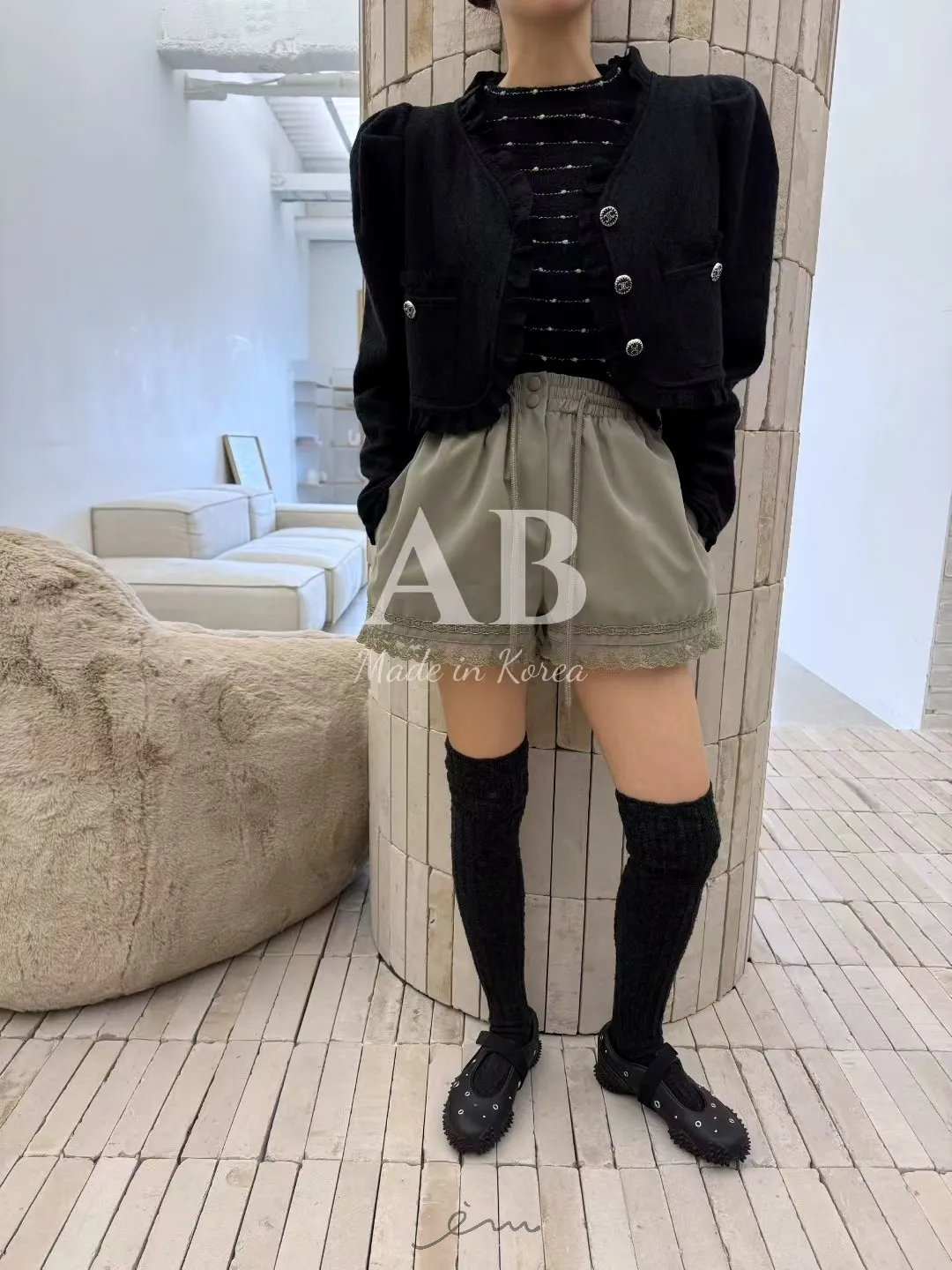 下蕾絲壓釦抽繩鬆緊短褲(黑斷)