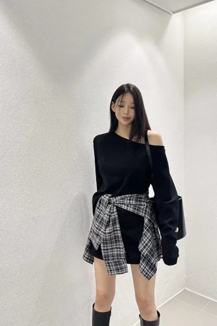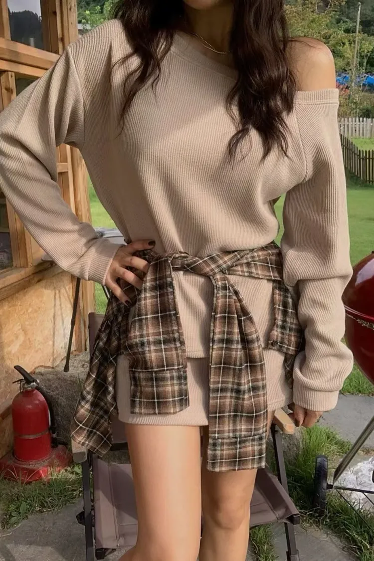 大圓領上衣+綁腰格紋+褲裙(三件組)