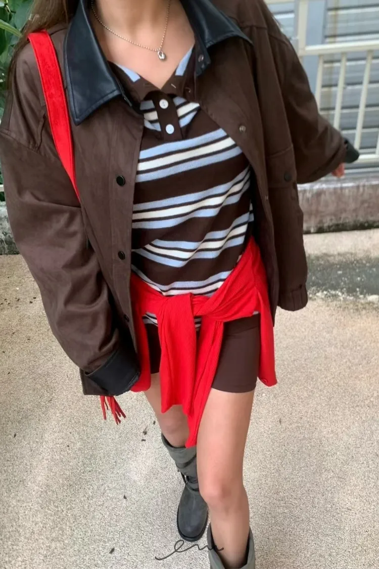 Jimmy翻領麂皮拼皮領排釦外套