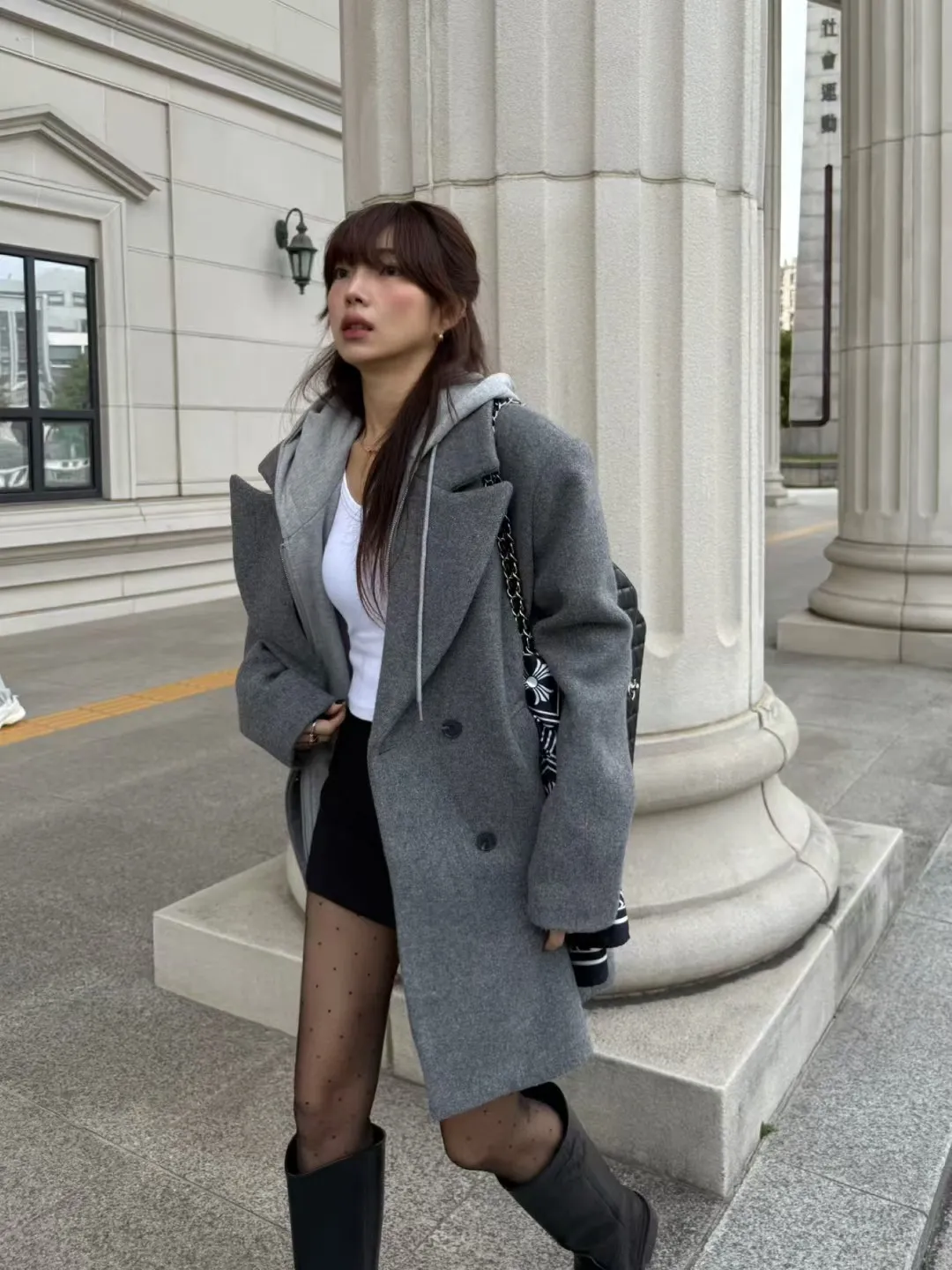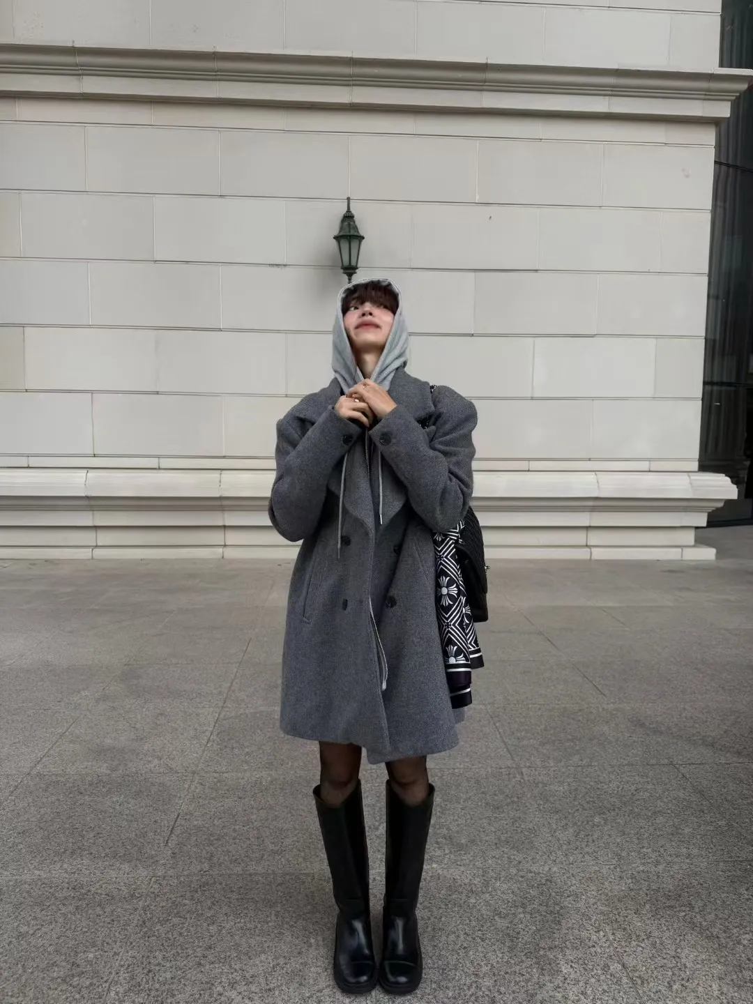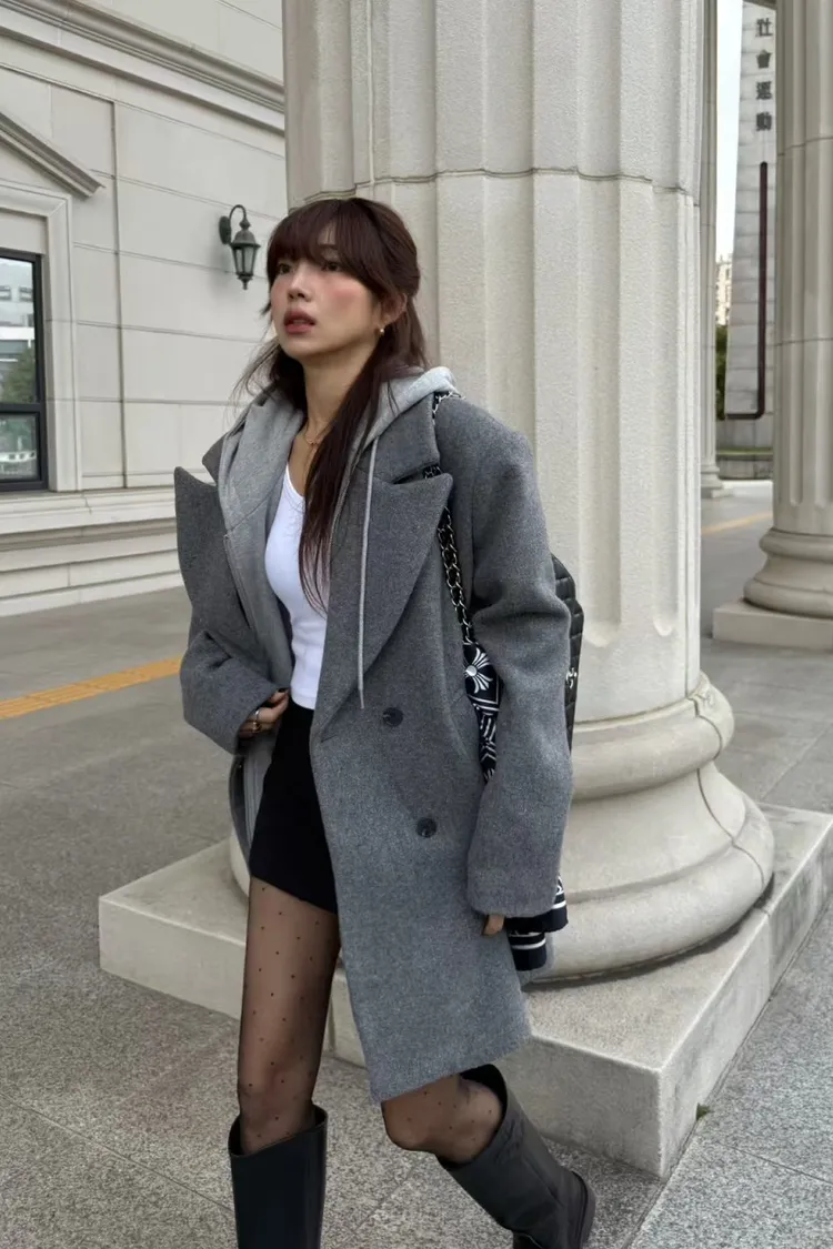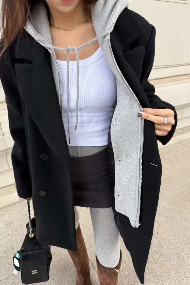SO假兩件羊毛連帽大衣(棉帽可以拆)