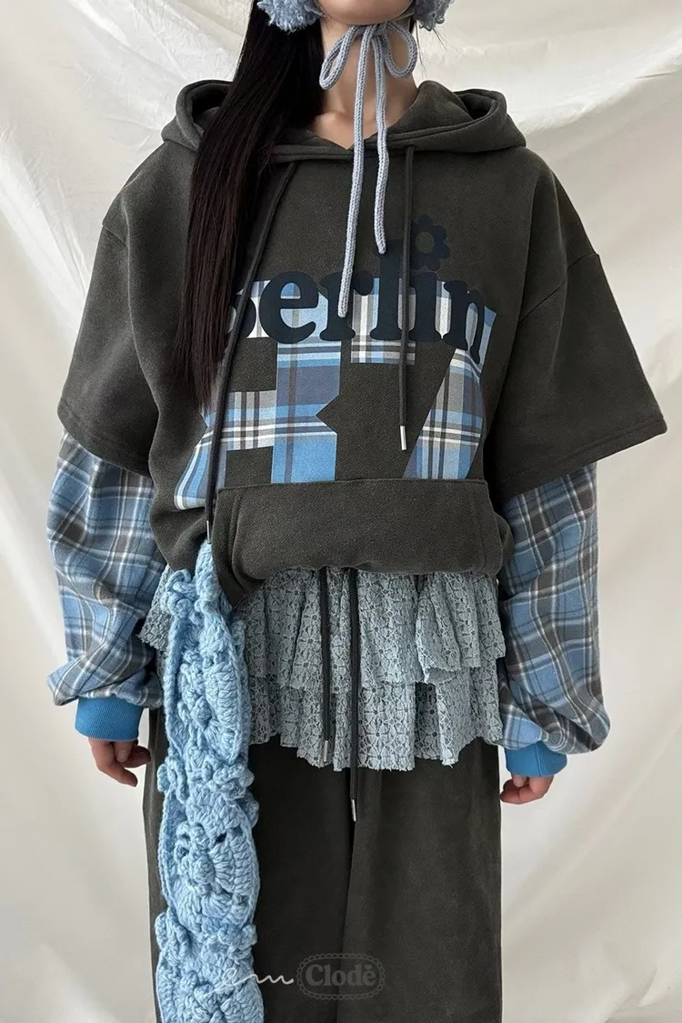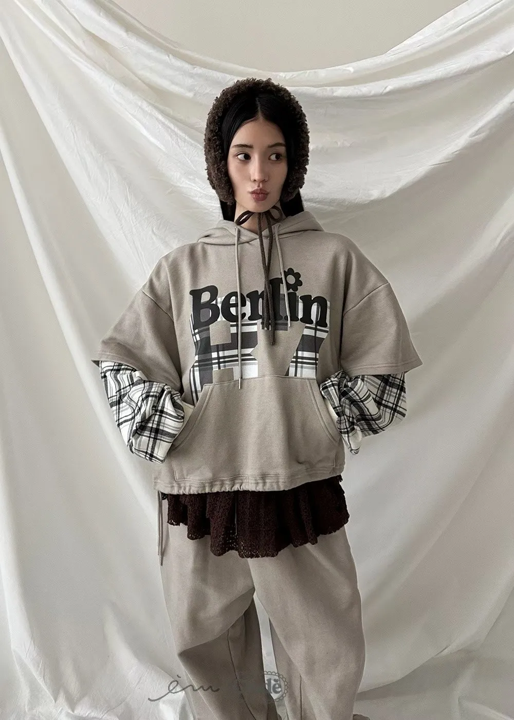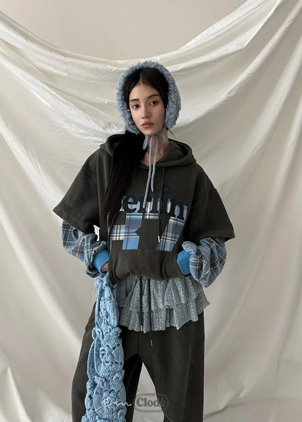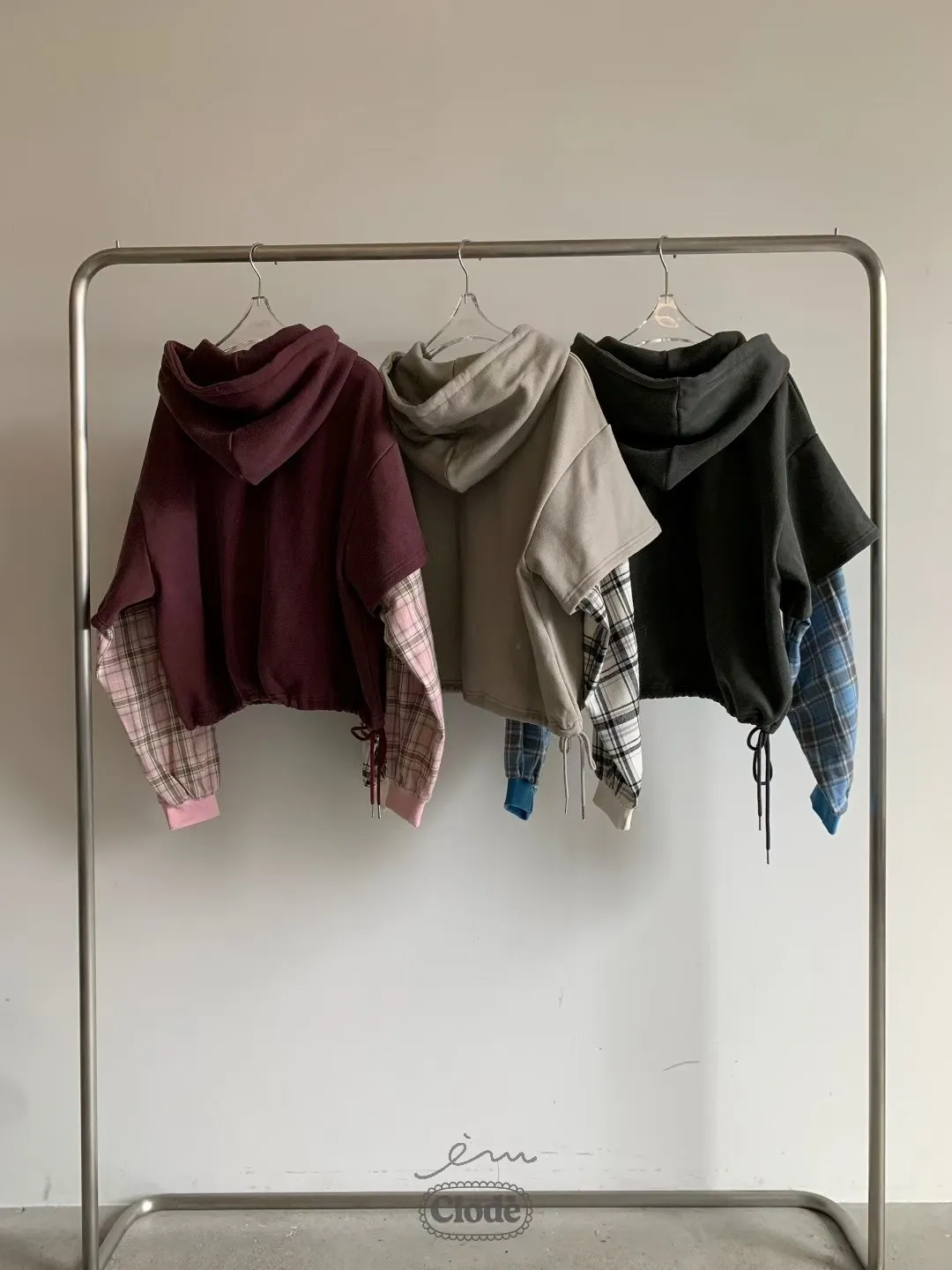 CL格紋印花假兩件下擺綁帶連帽上衣
