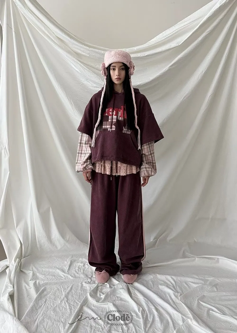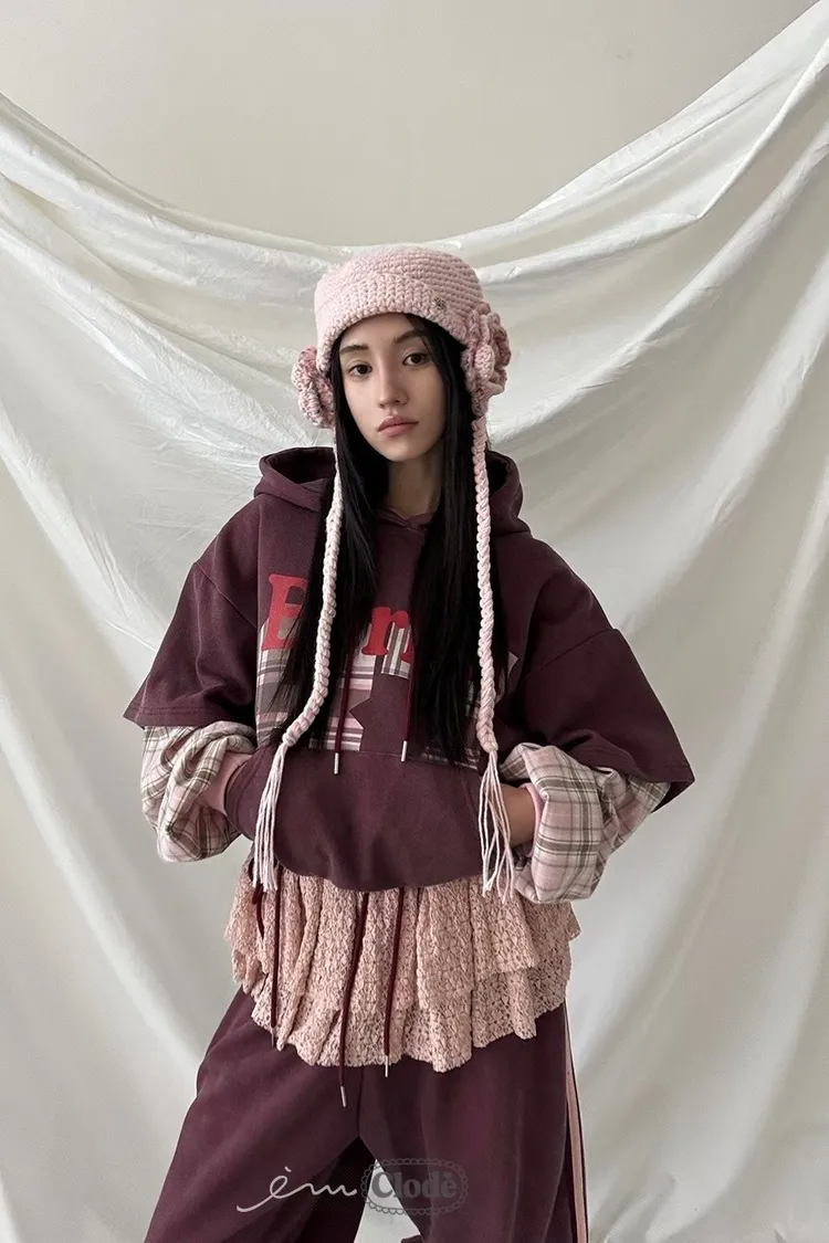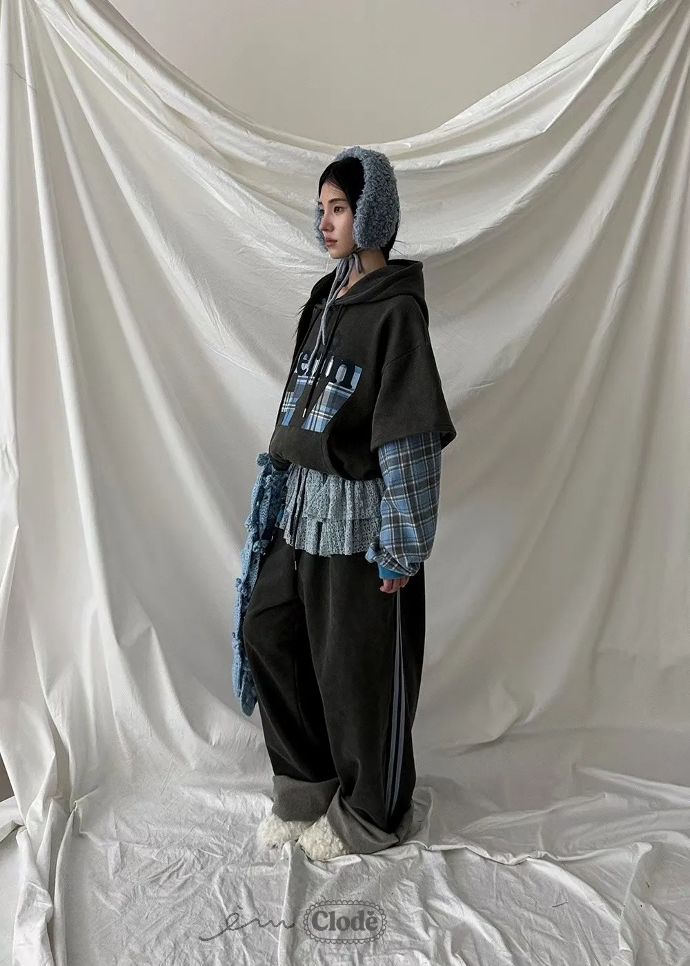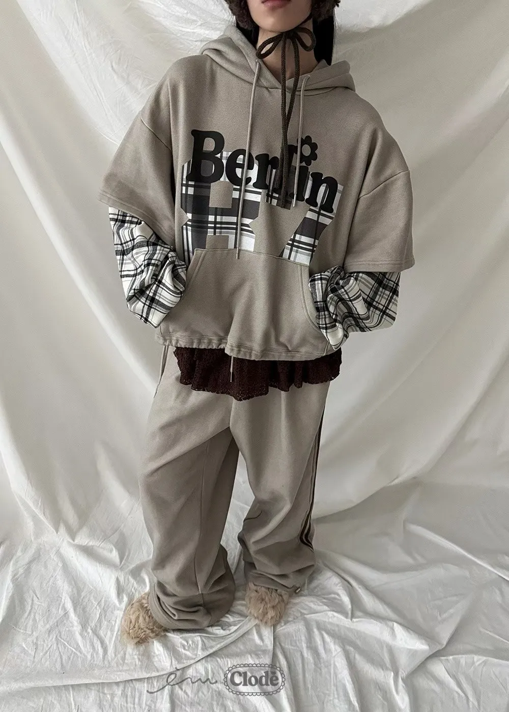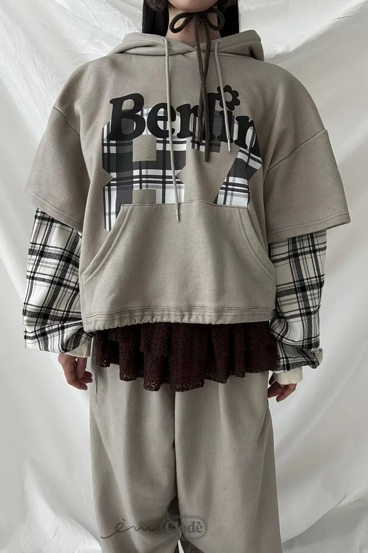 CL格紋印花假兩件下擺綁帶連帽上衣