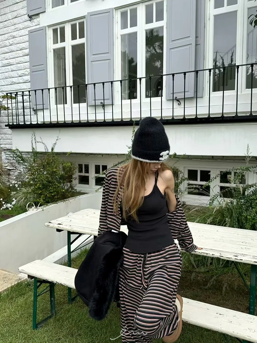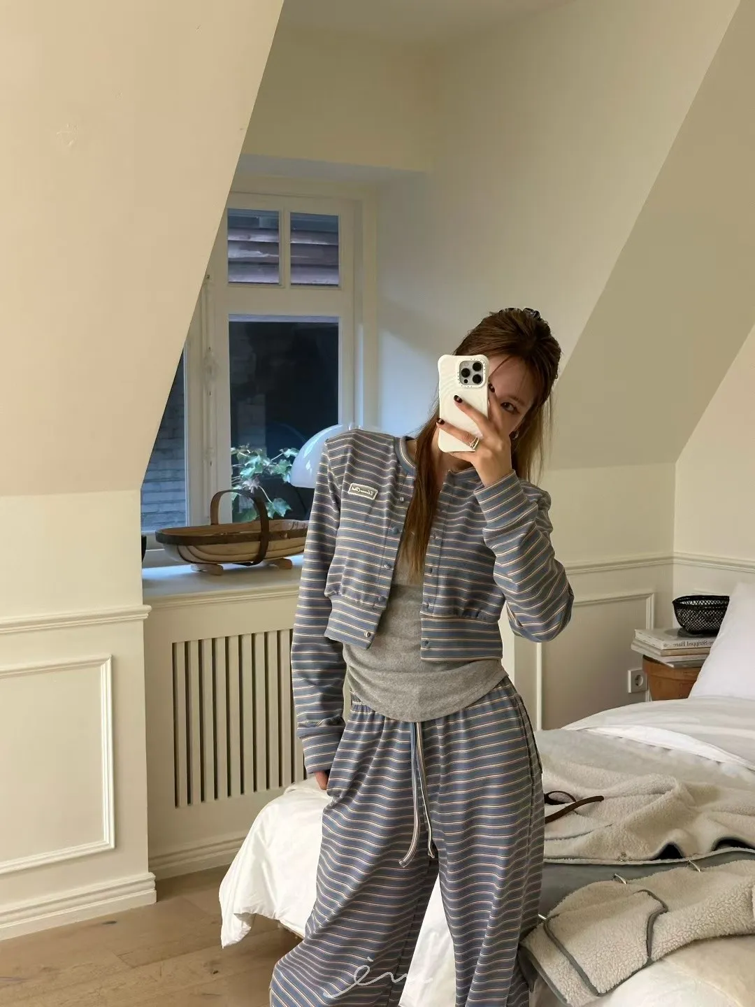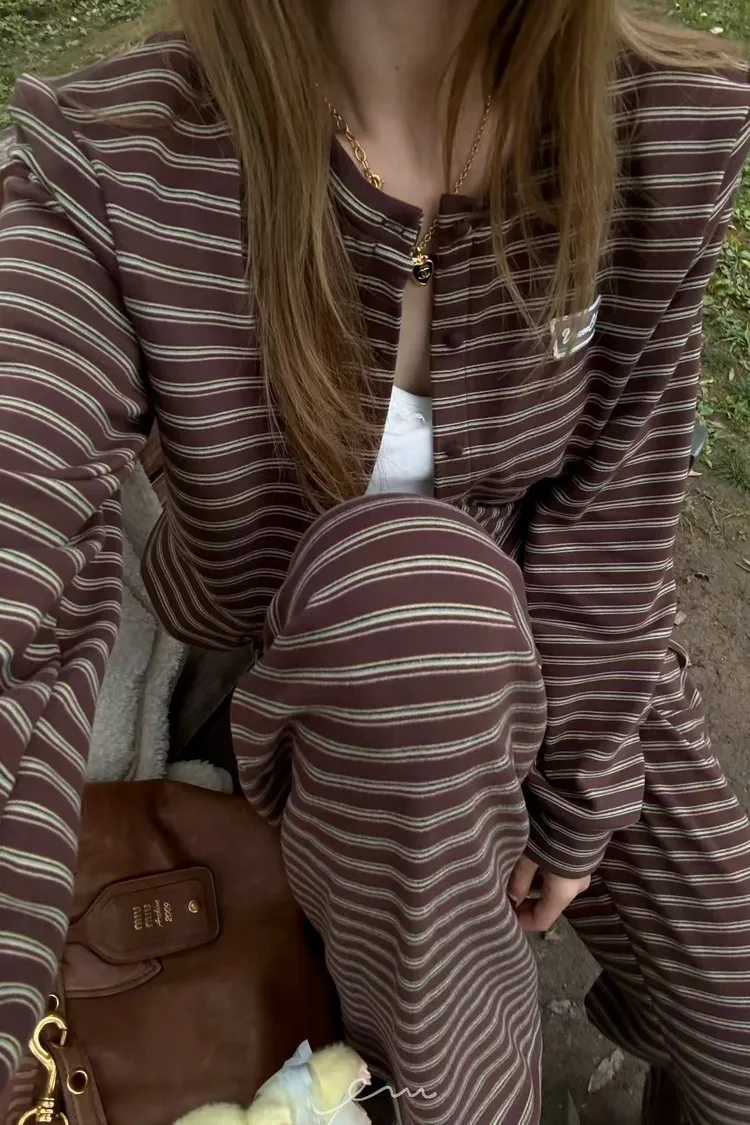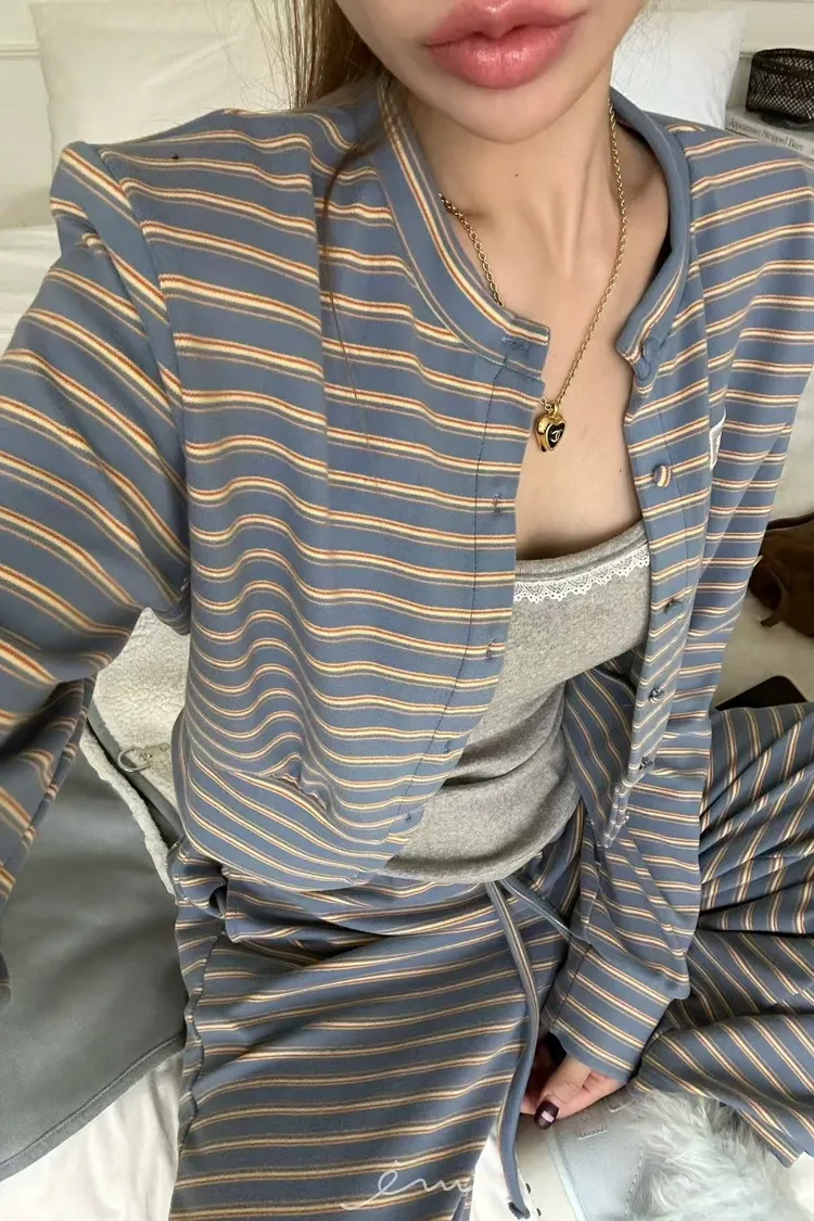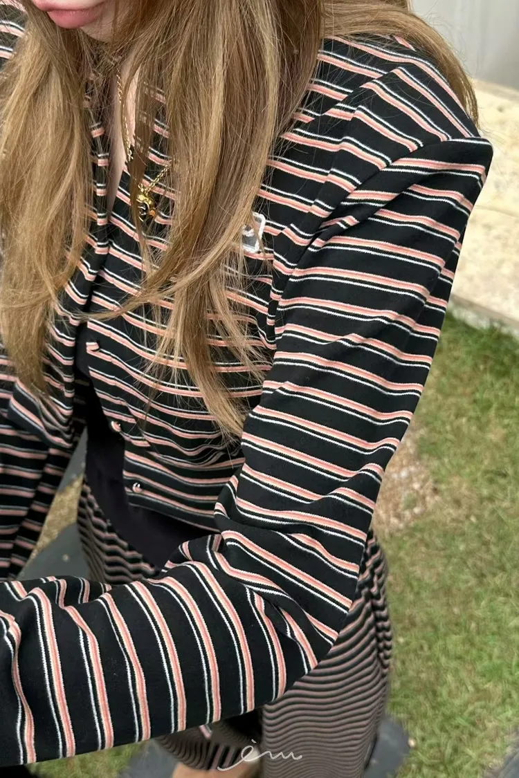 ZERO絨感條紋排釦小蕾絲標上衣