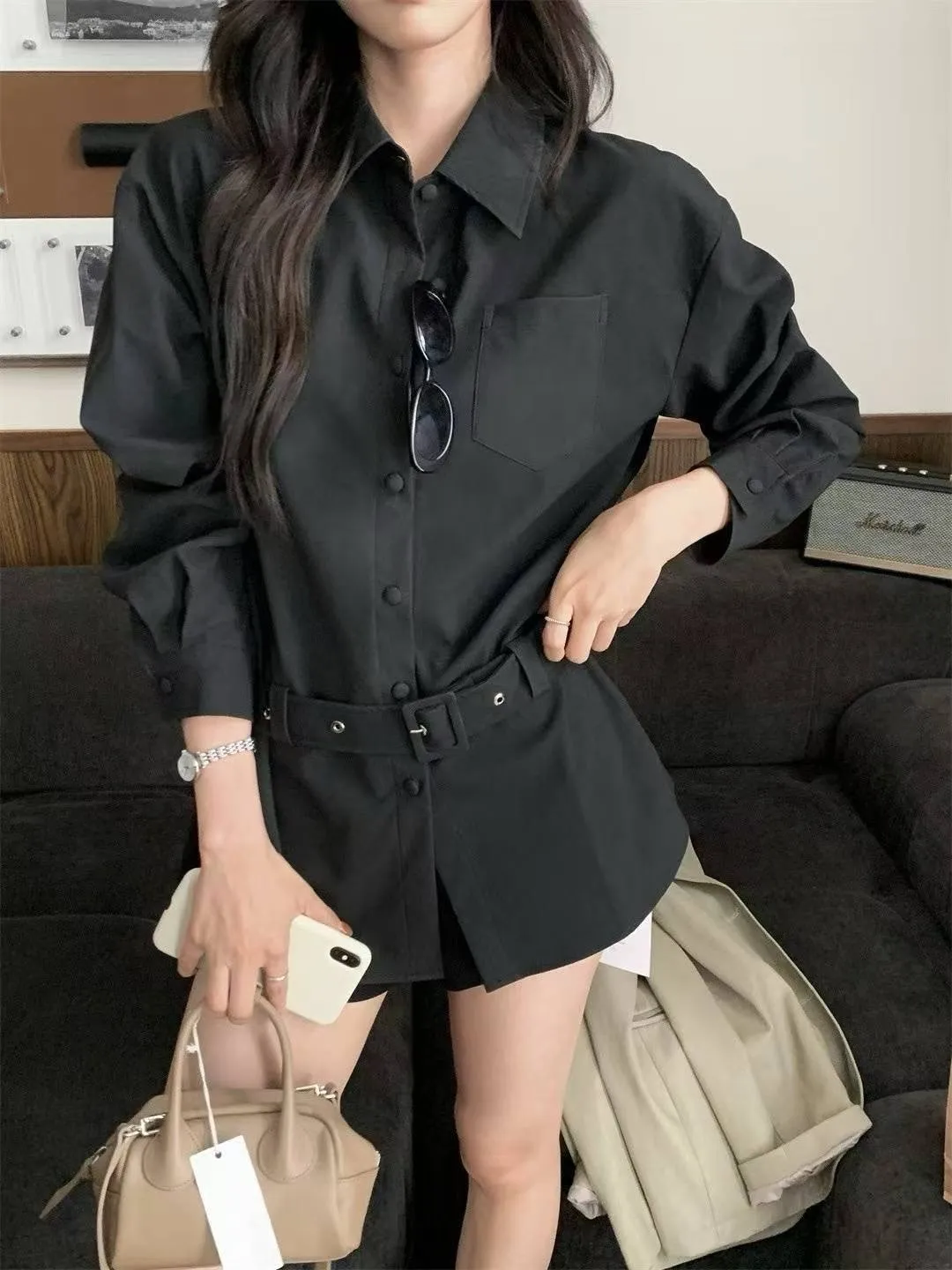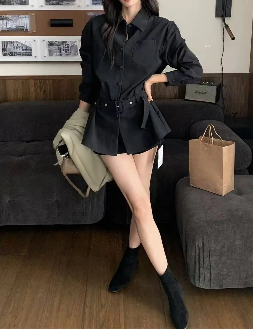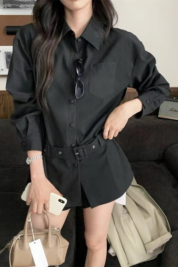 特別!霧面皮革!腰帶+單口袋長版襯衫