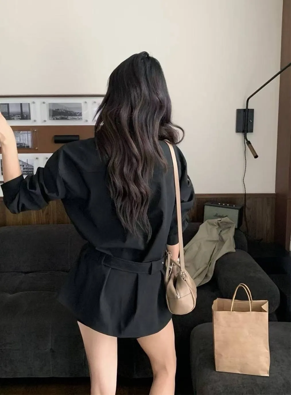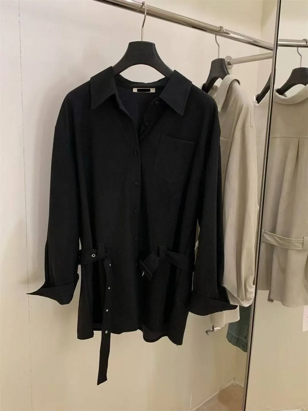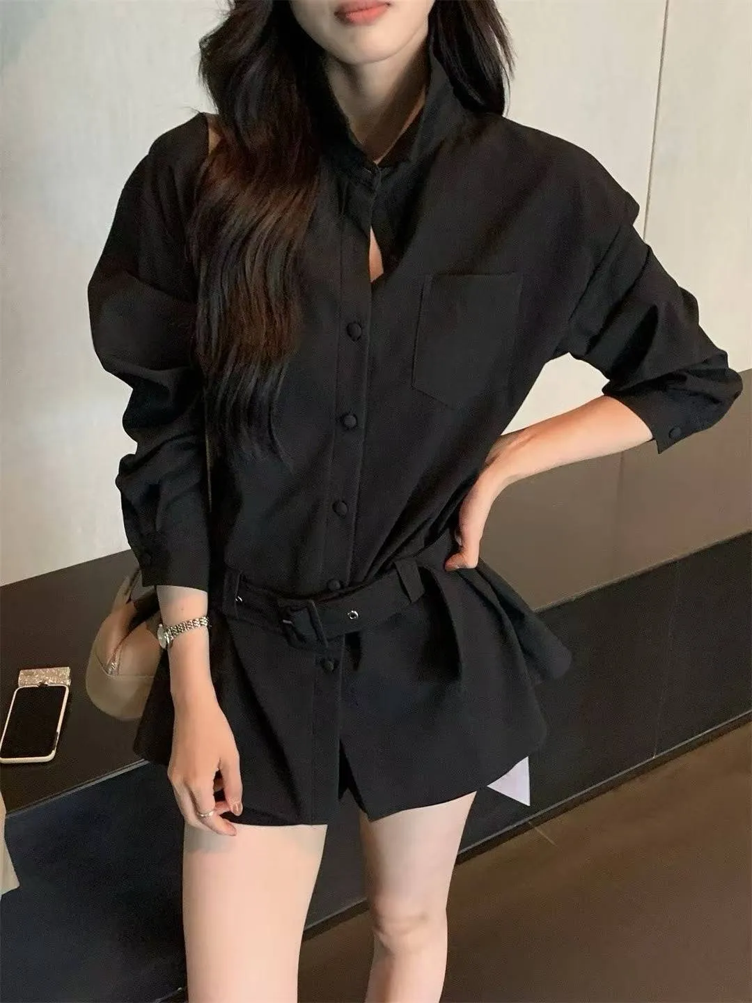 特別!霧面皮革!腰帶+單口袋長版襯衫